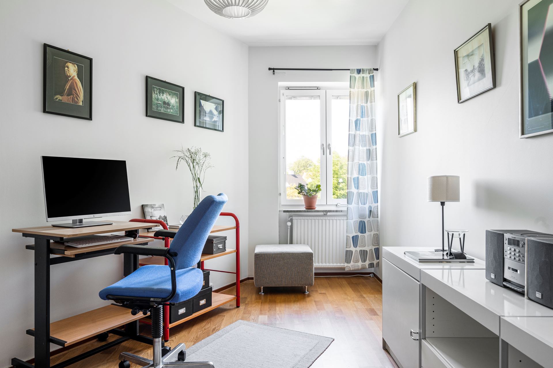 Mysigt vinklat sovrum, lagom för säng och skrivbord, med parkettgolv (2010) och ljusbeigemålad fiskbenstapet.