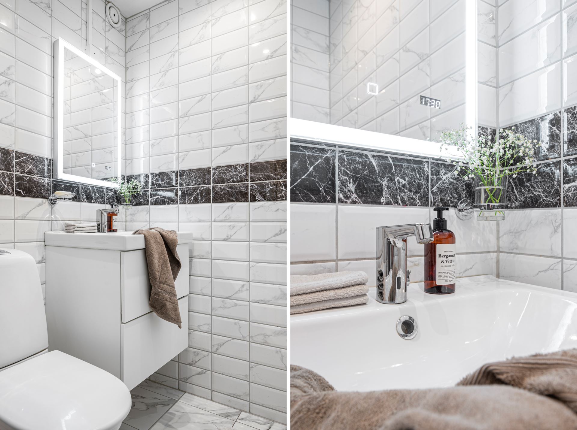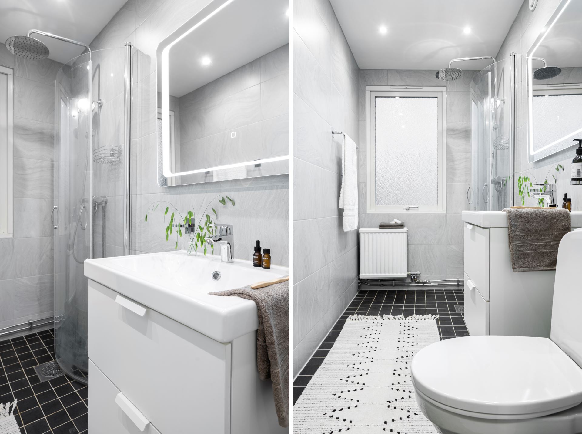 Badrummet som renoverades 2021 nås direkt till vänster från hallen. Helkaklat badrum med vitt och grått kakel på väggarna tillsammans med klinkers i svart på golv. Utrustat med wc, handfat, spegel och dusch bakom glasvägg. Fönster i badrummet skänker extra mycket ljusinsläpp!