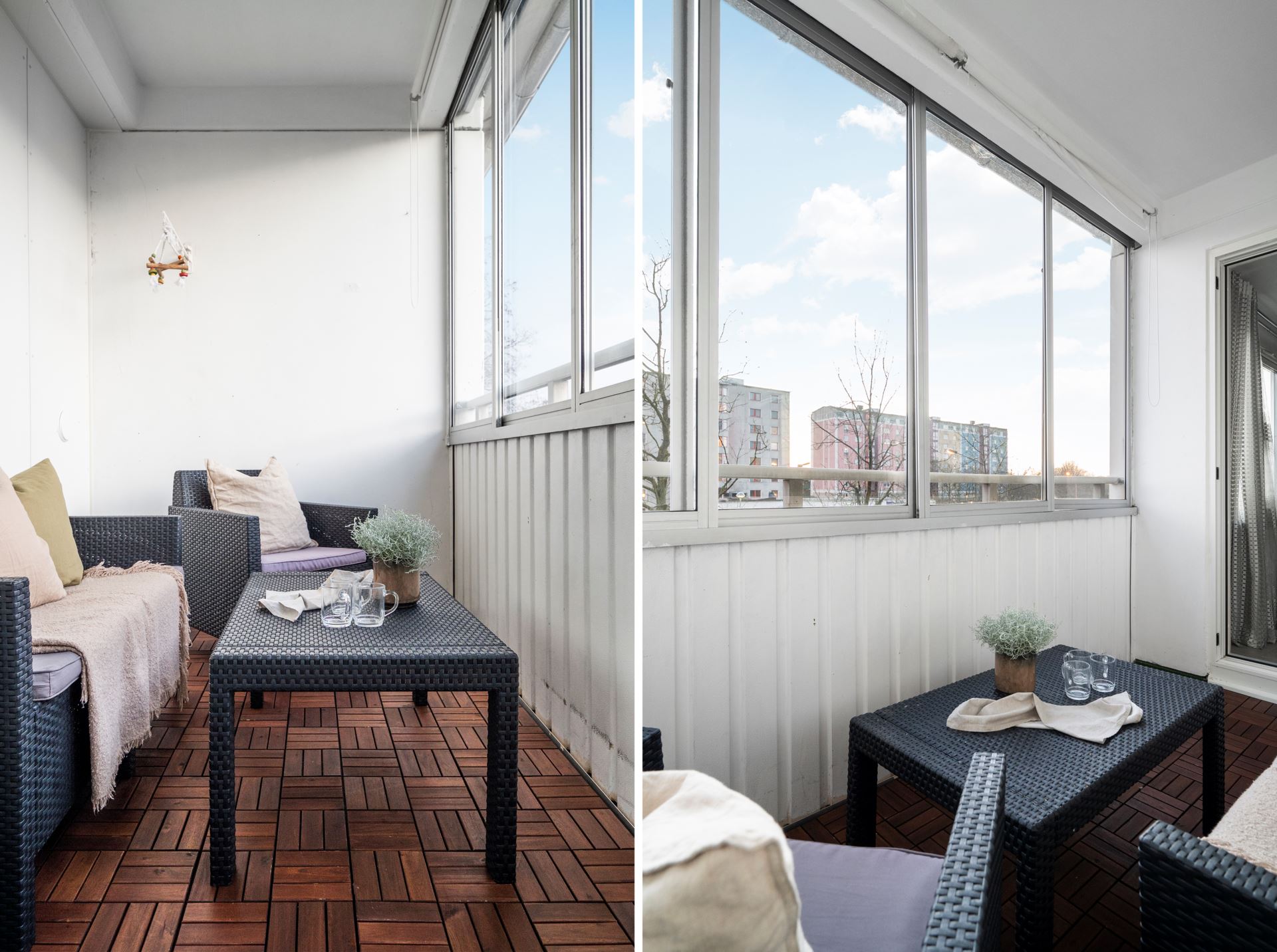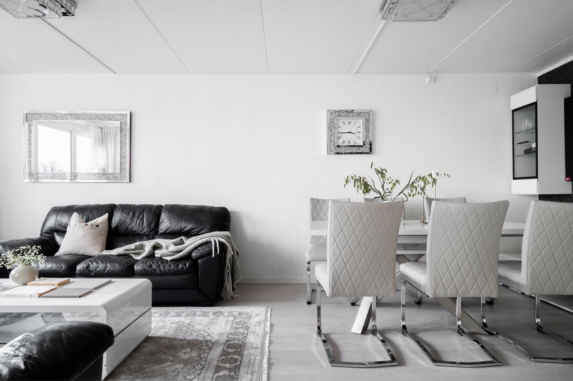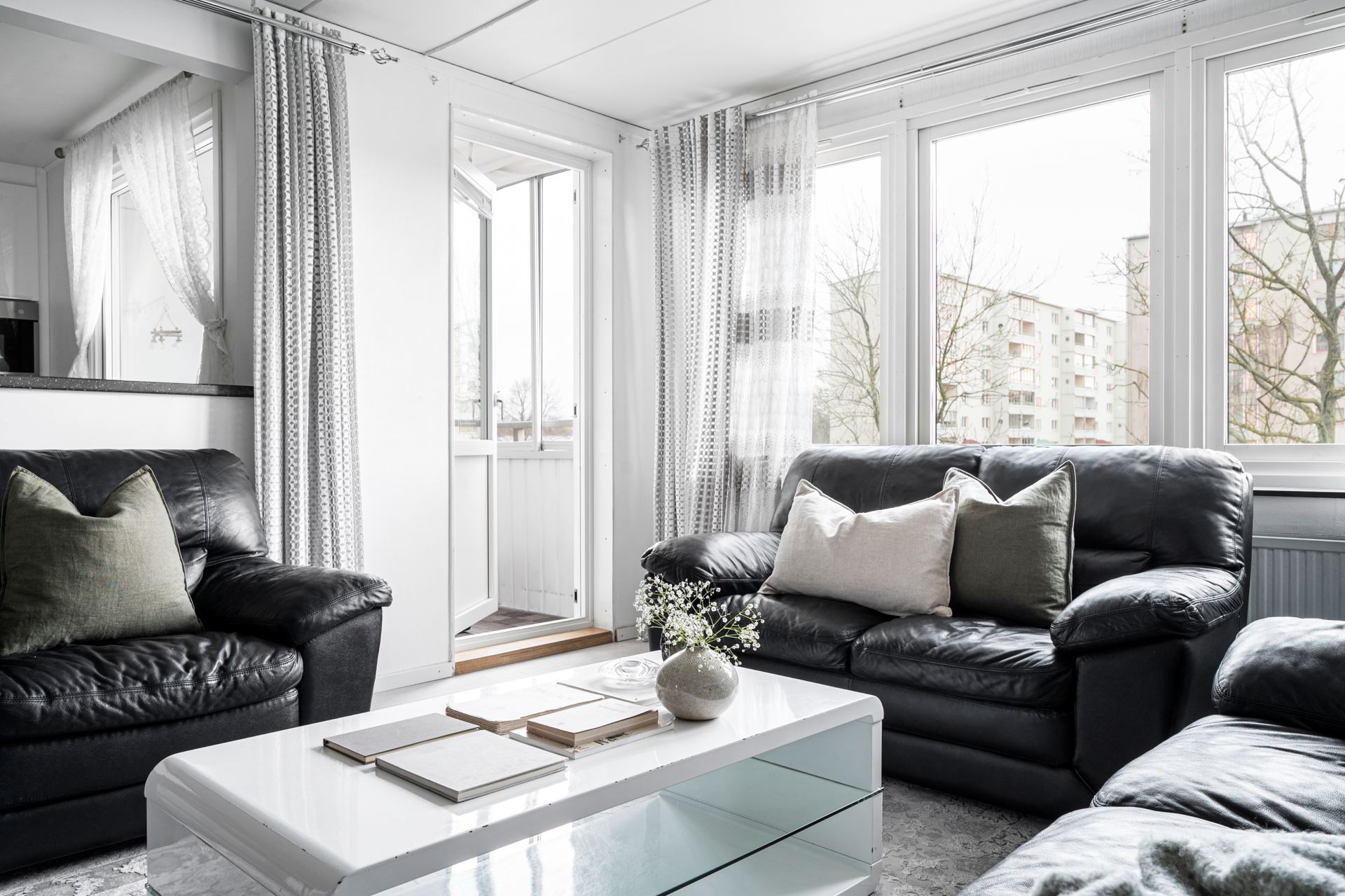 I anslutning till köket nås vardagsrummet. Rymligt med plats för större soffgrupp och matbord. Vita väggar samt fondvägg kombineras med ljust laminatgolv. Härifrån når vi dessutom den sköna inglasade balkongen i omtyckt västerläge!