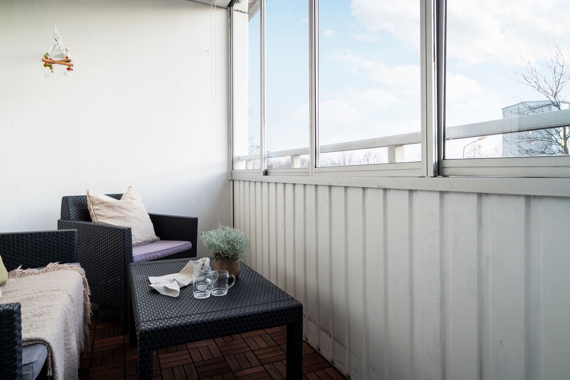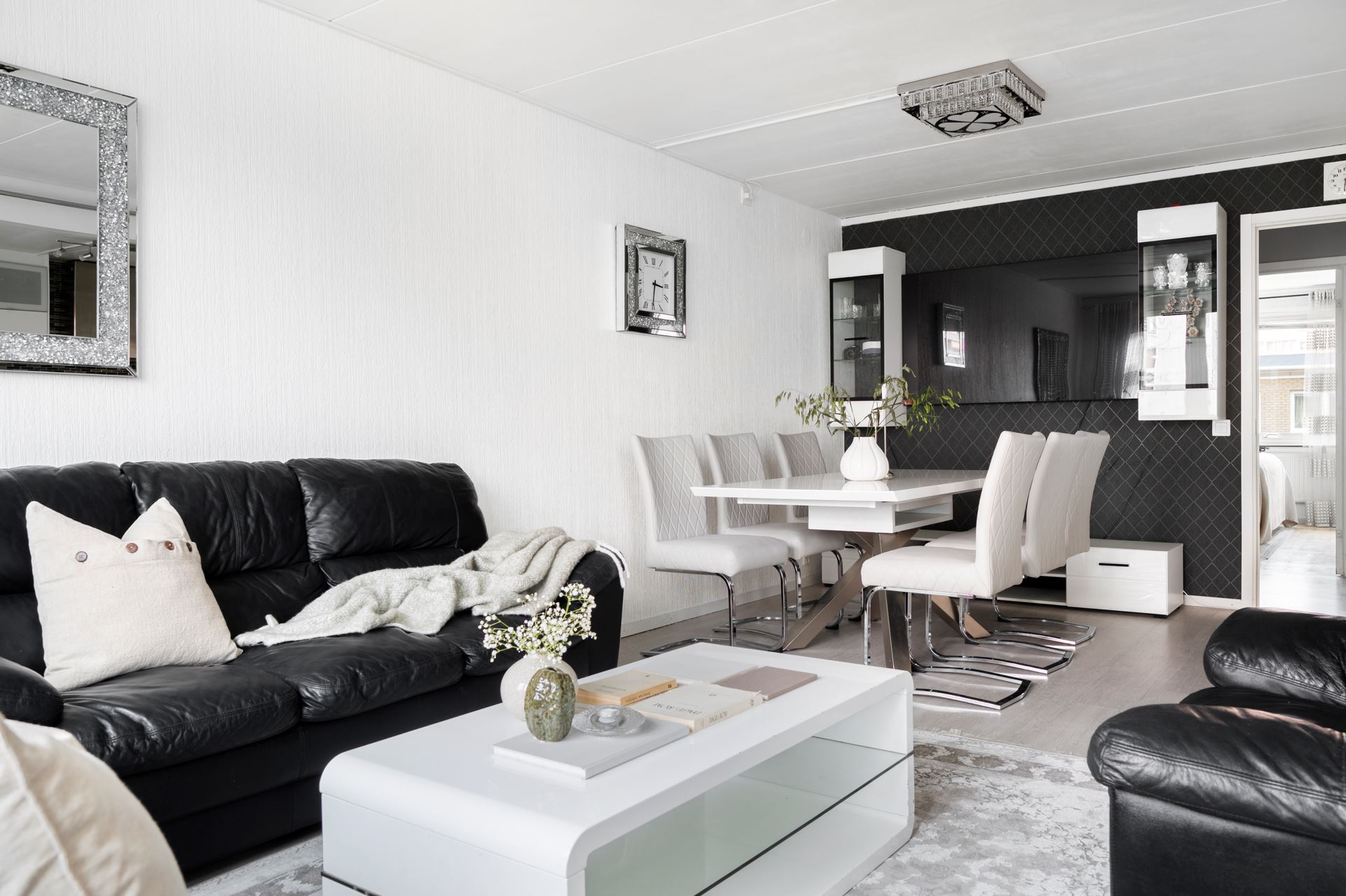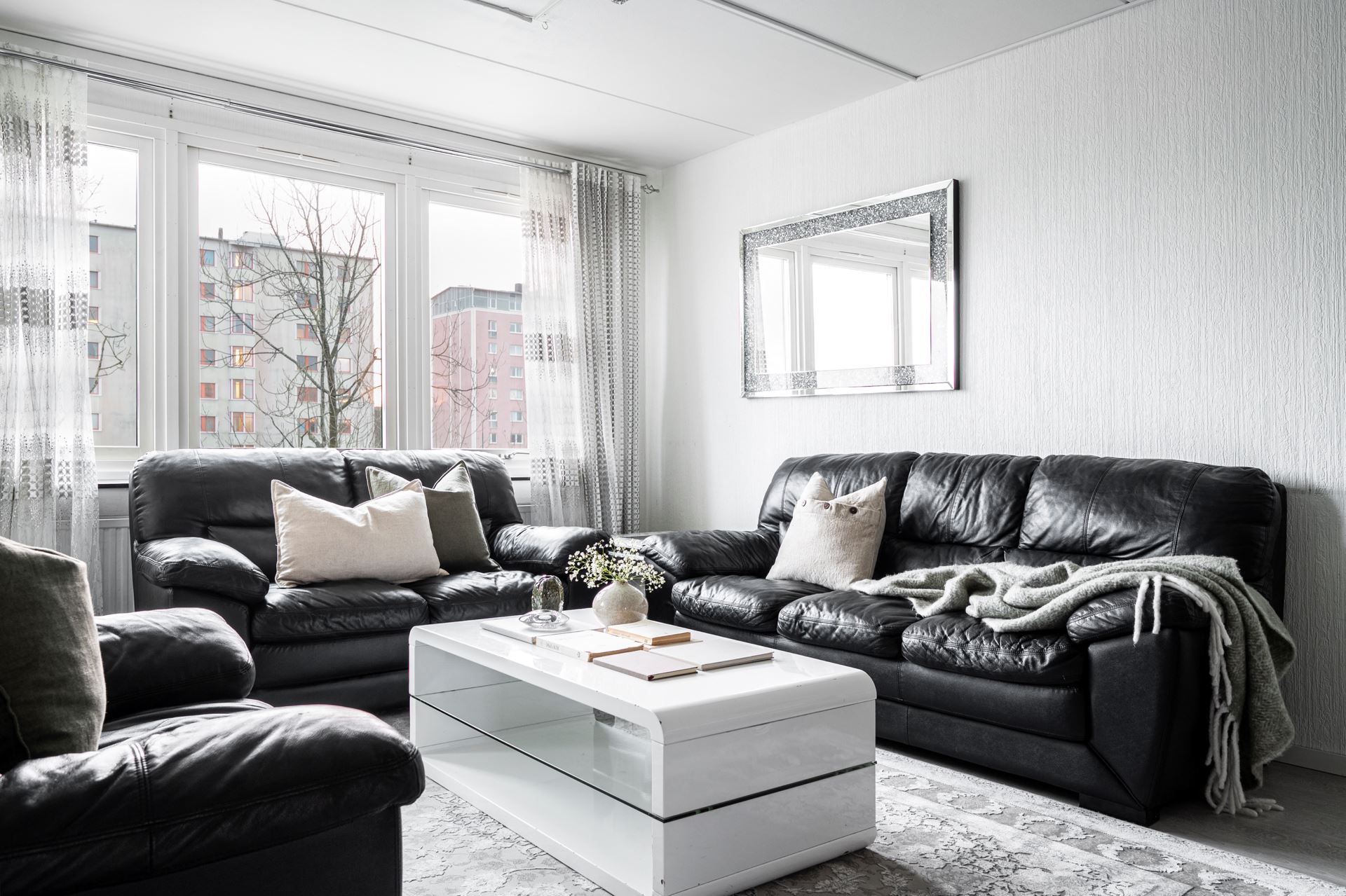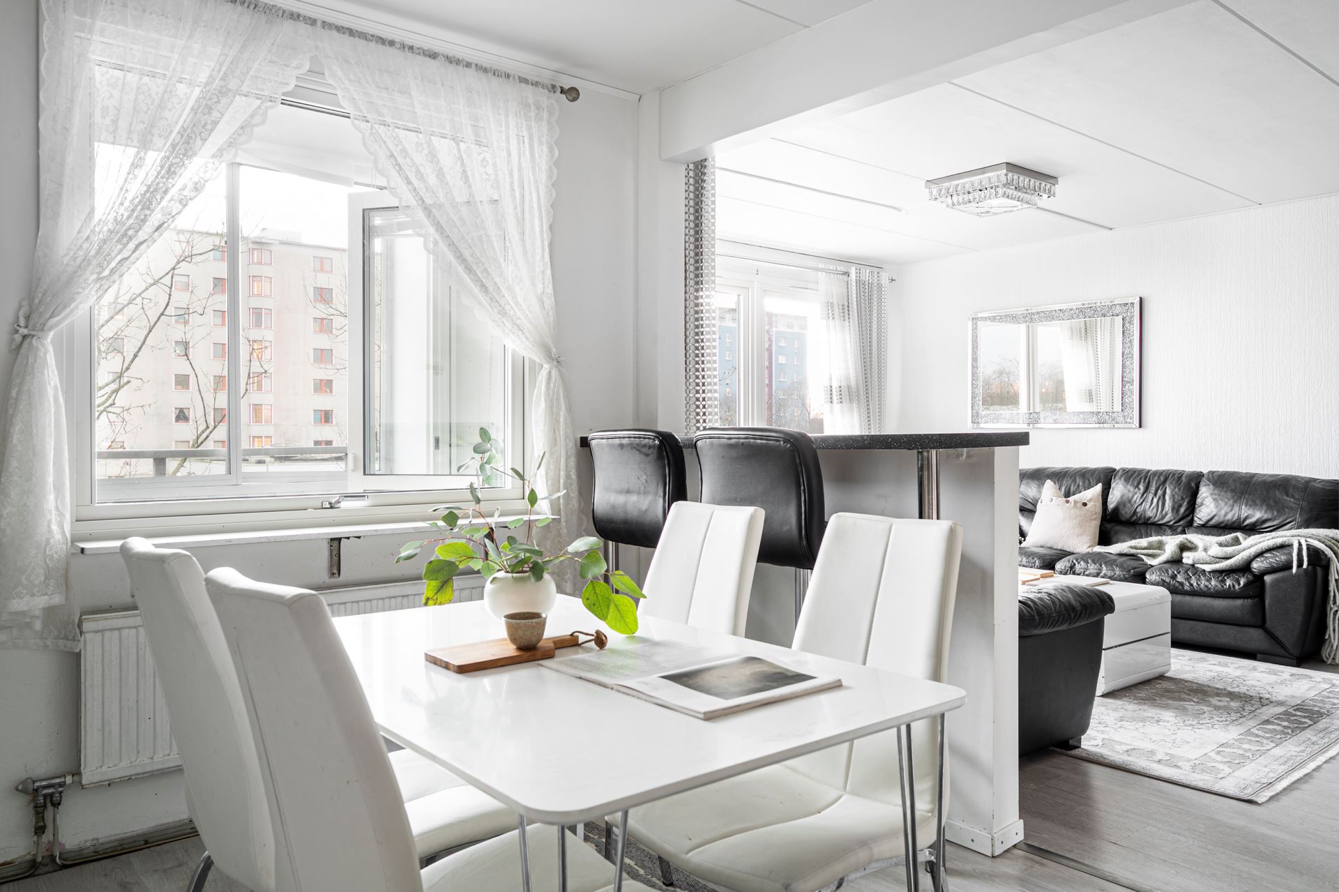 I anslutning till köket nås vardagsrummet. Rymligt med plats för större soffgrupp och matbord. Vita väggar samt fondvägg kombineras med ljust laminatgolv. Härifrån når vi dessutom den sköna inglasade balkongen i omtyckt västerläge!