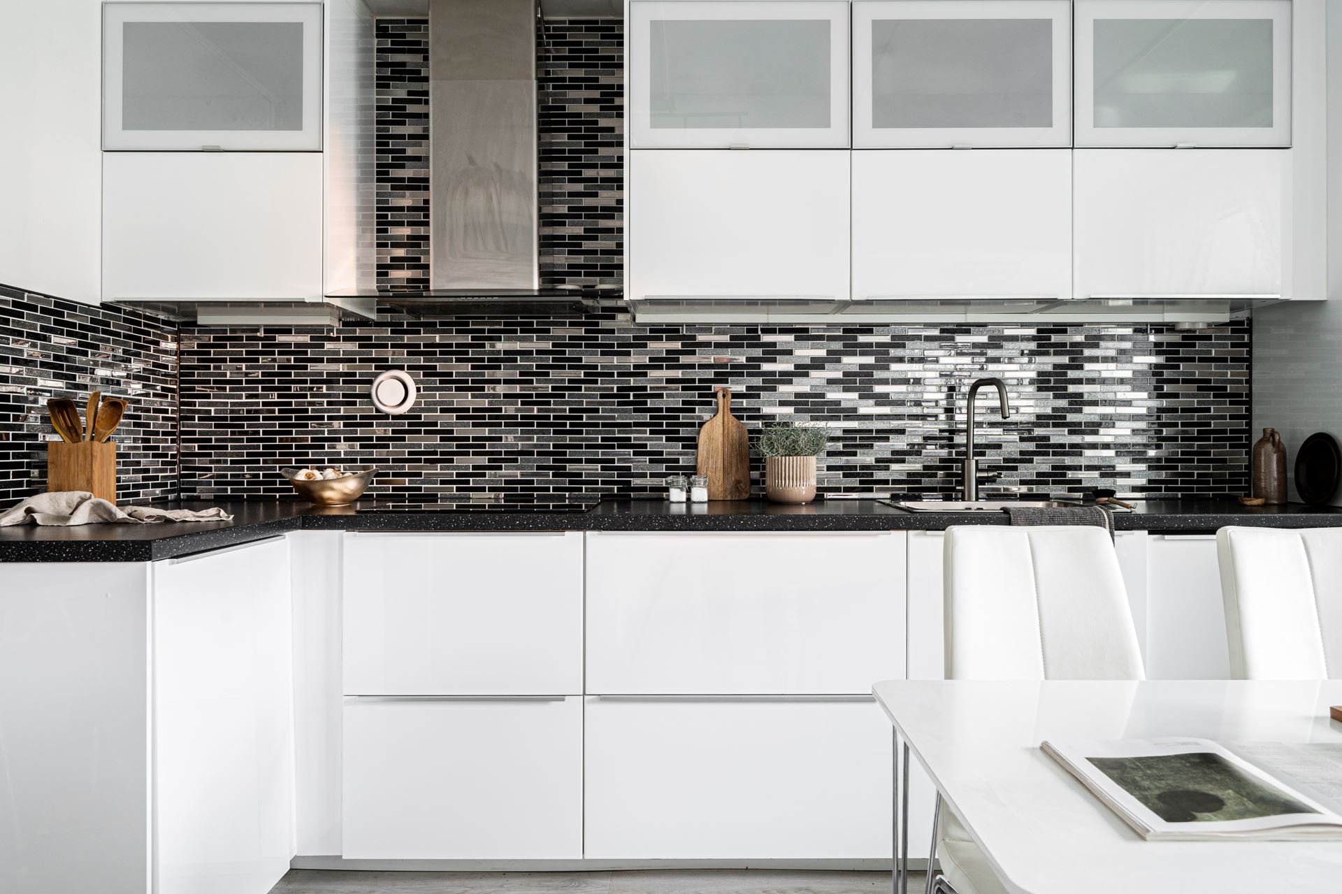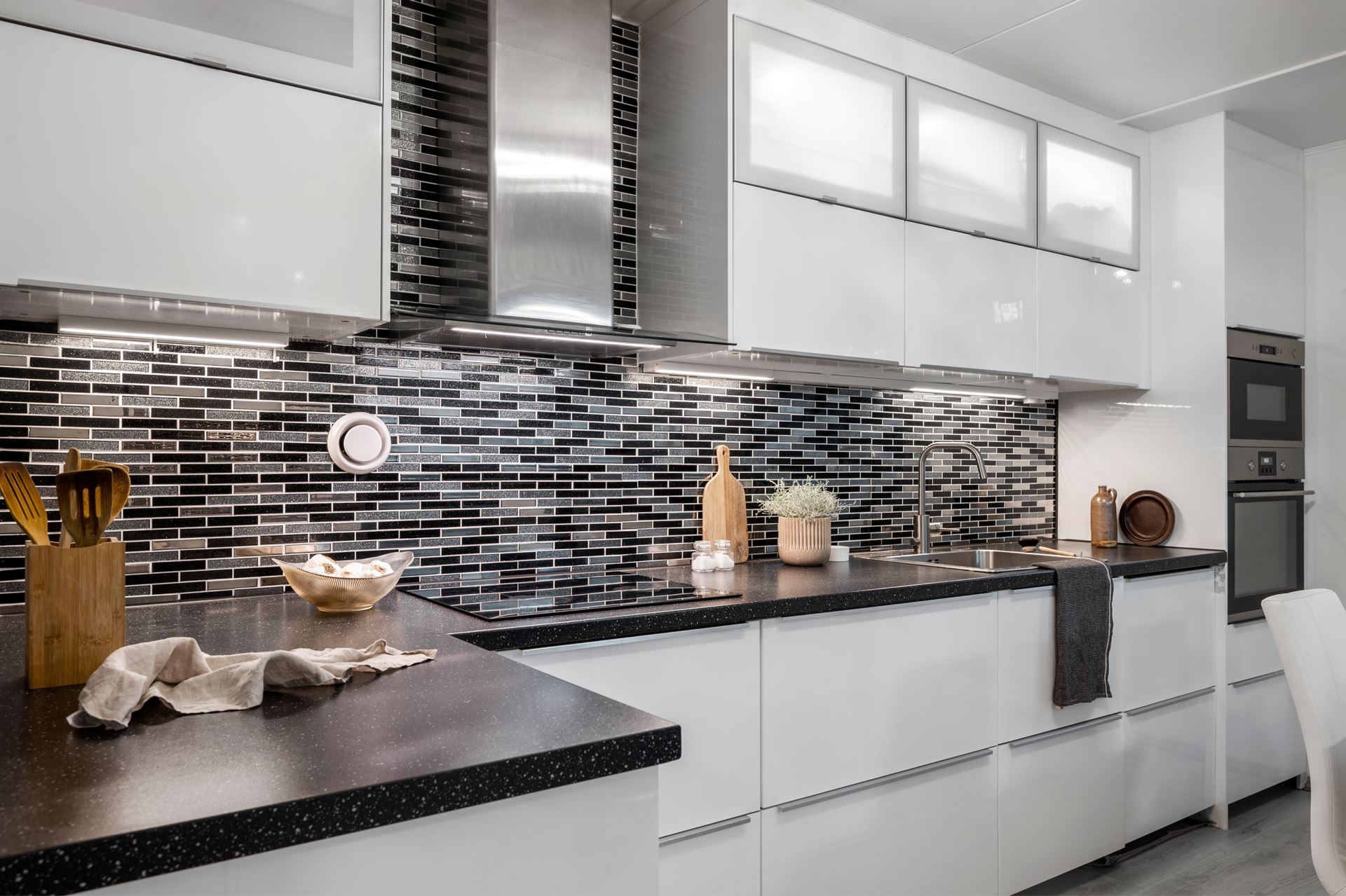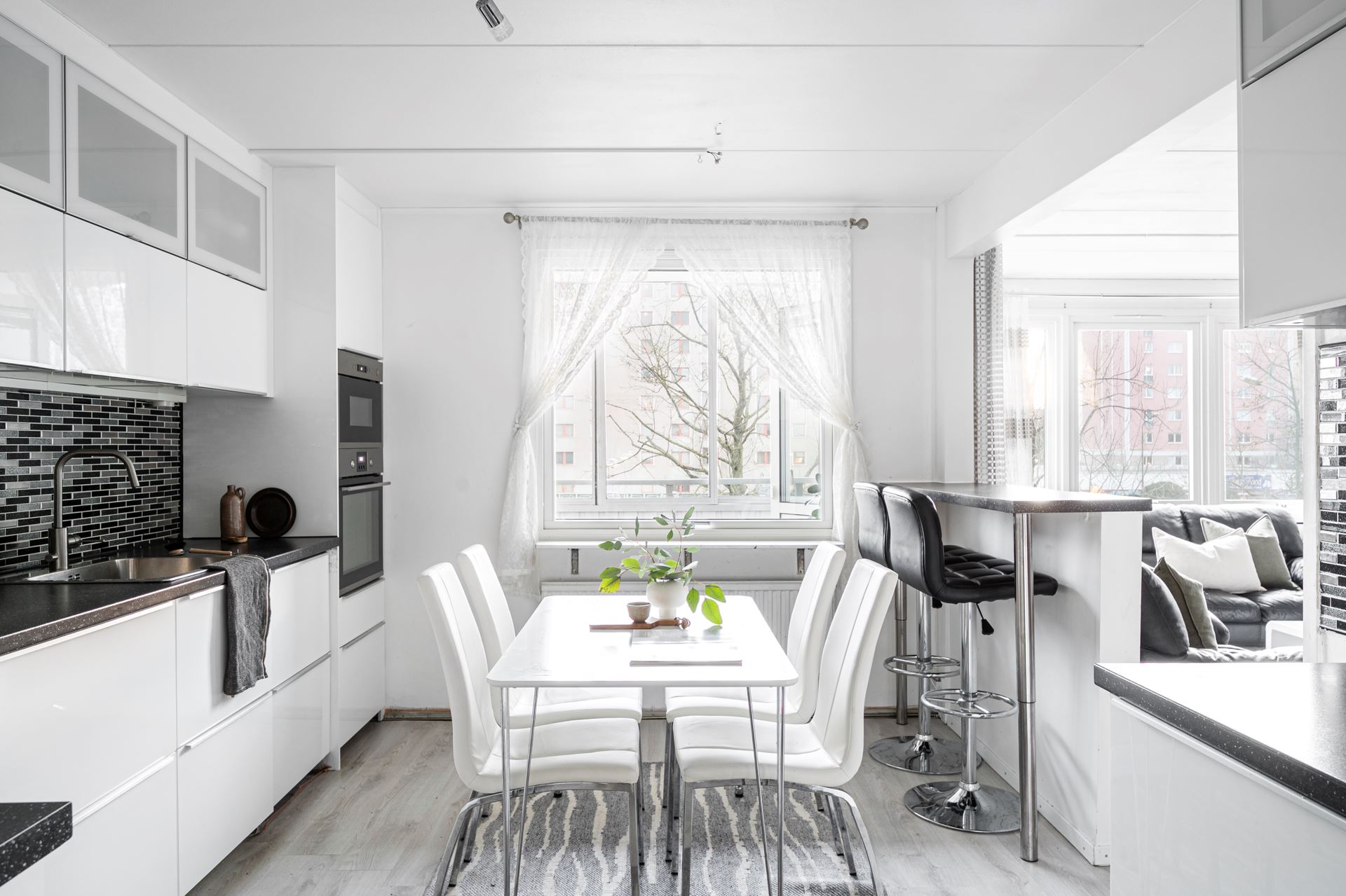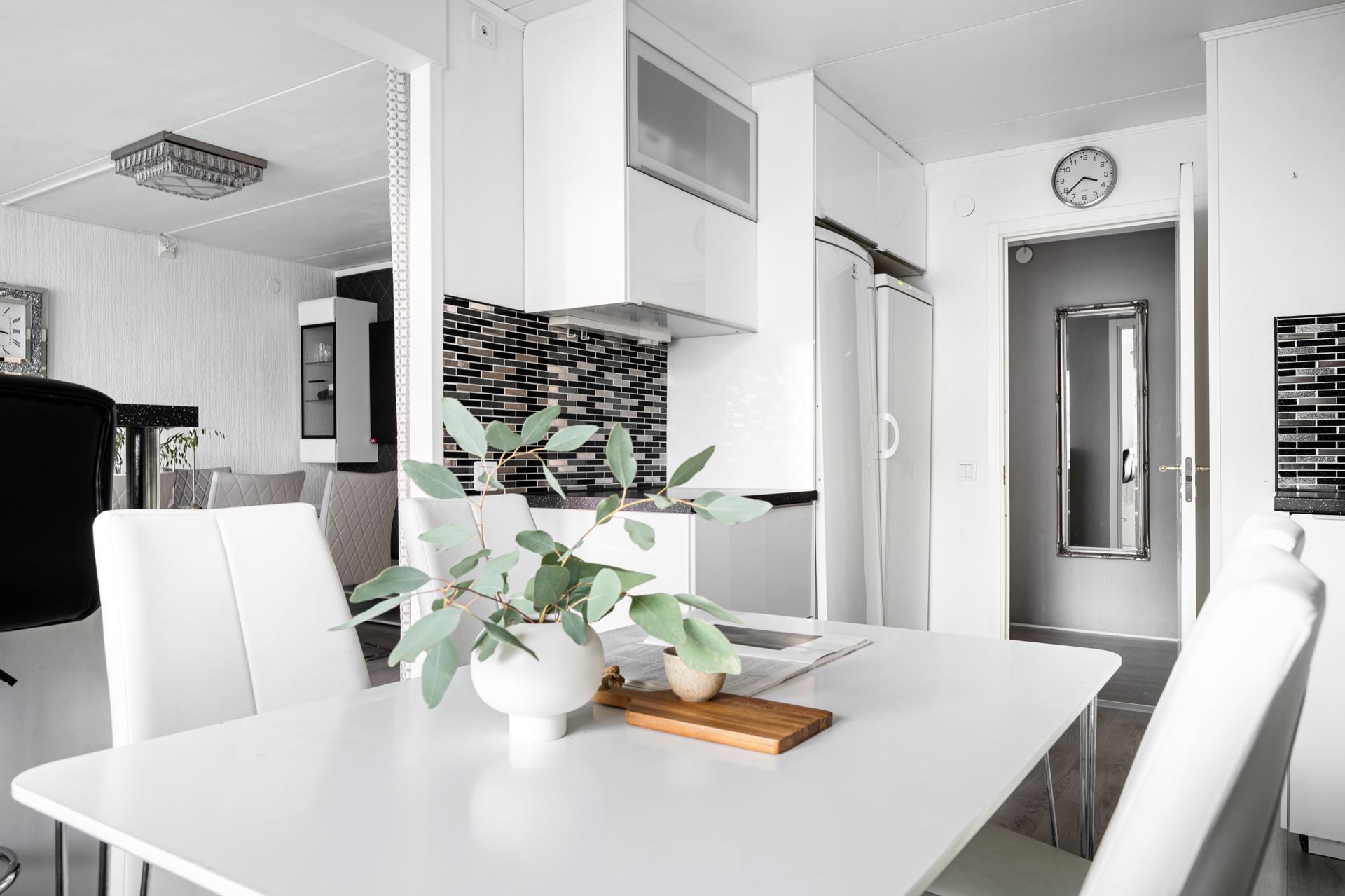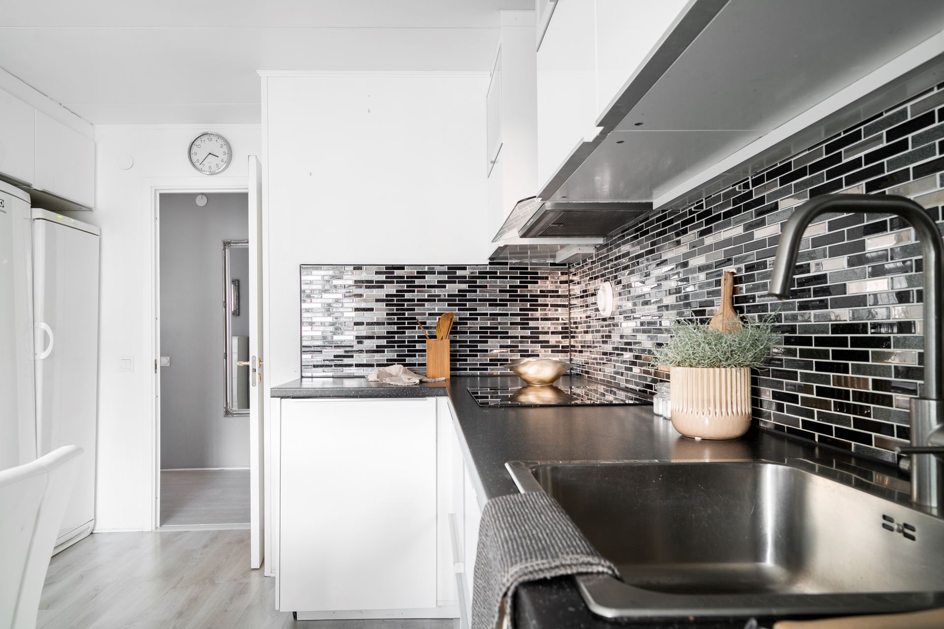 Vidare öppnar lägenheten upp med stilrent renoverat kök (2021)med vita köksluckor som kombineras med fin bänkskiva och grå mosaik. Praktisk köksö bjuder in till både matlagning och sociala ytor. Här finns dessutom gott om plats till både förvaring och arbetsytor. Köket är utrustat med spishäll, ugn, kyl och frys i fullhöjd, fläkt, integrerad diskmaskin och inbyggd mikrovågsugn.