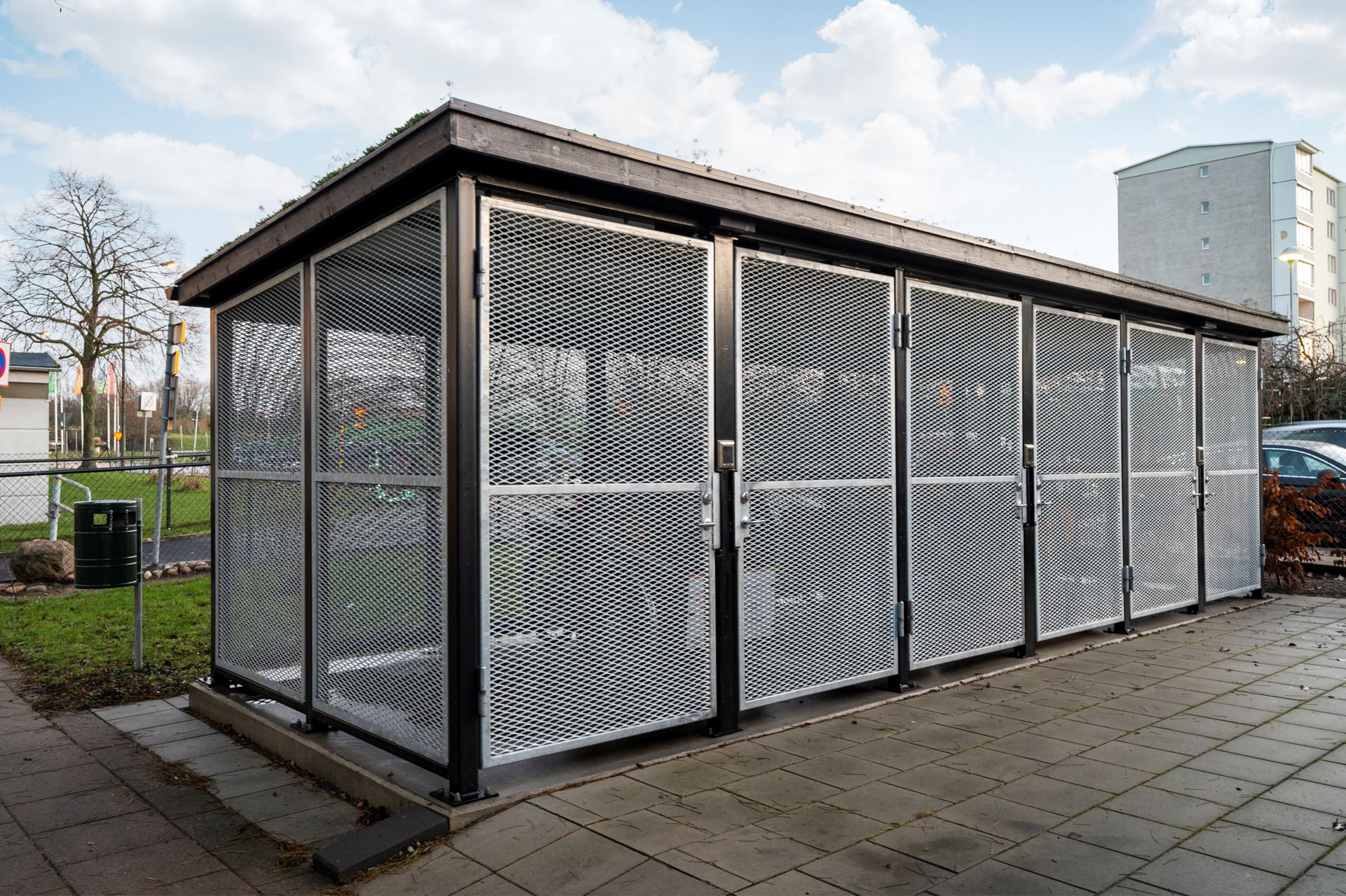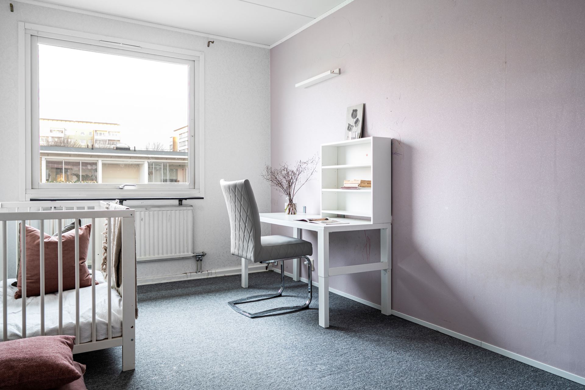 På vänster sida från hallen når vi det första sovrummet som gott och väl rymmer plats för säng, sängbord och mer därtill. Plats för garderob och ytterligare förvaring.