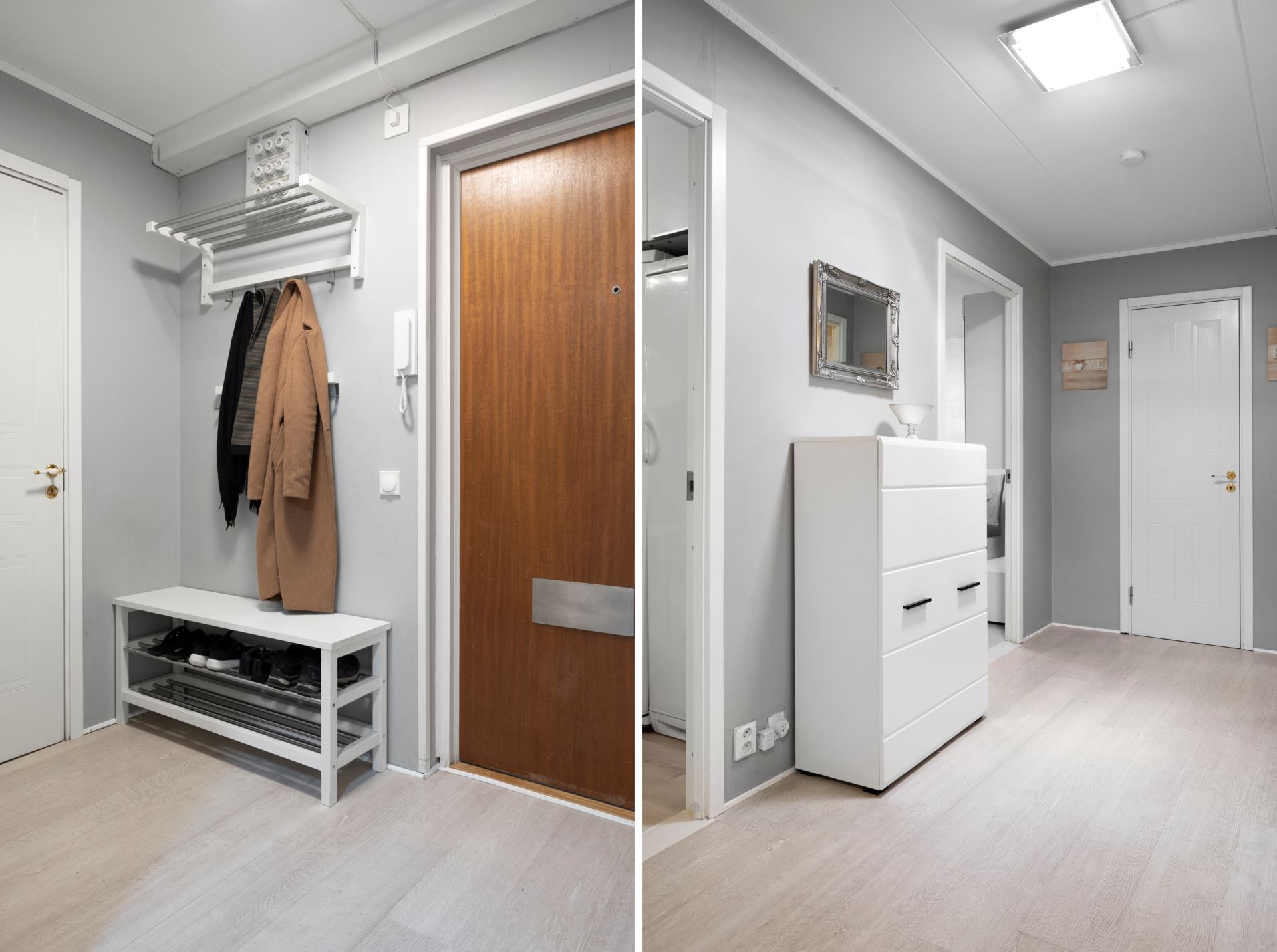 Vi välkomnas in i trivsam hallmiljö med gott om avhängningsmöjligheter på vänster sida. Fint laminat på golv, som enhetligt fortsätter i både kök och vardagsrum tillsammans med ljusa släta väggar. I hallen finns dessutom en rymlig klädkammare med plats för alla årstiders kläder och skor.