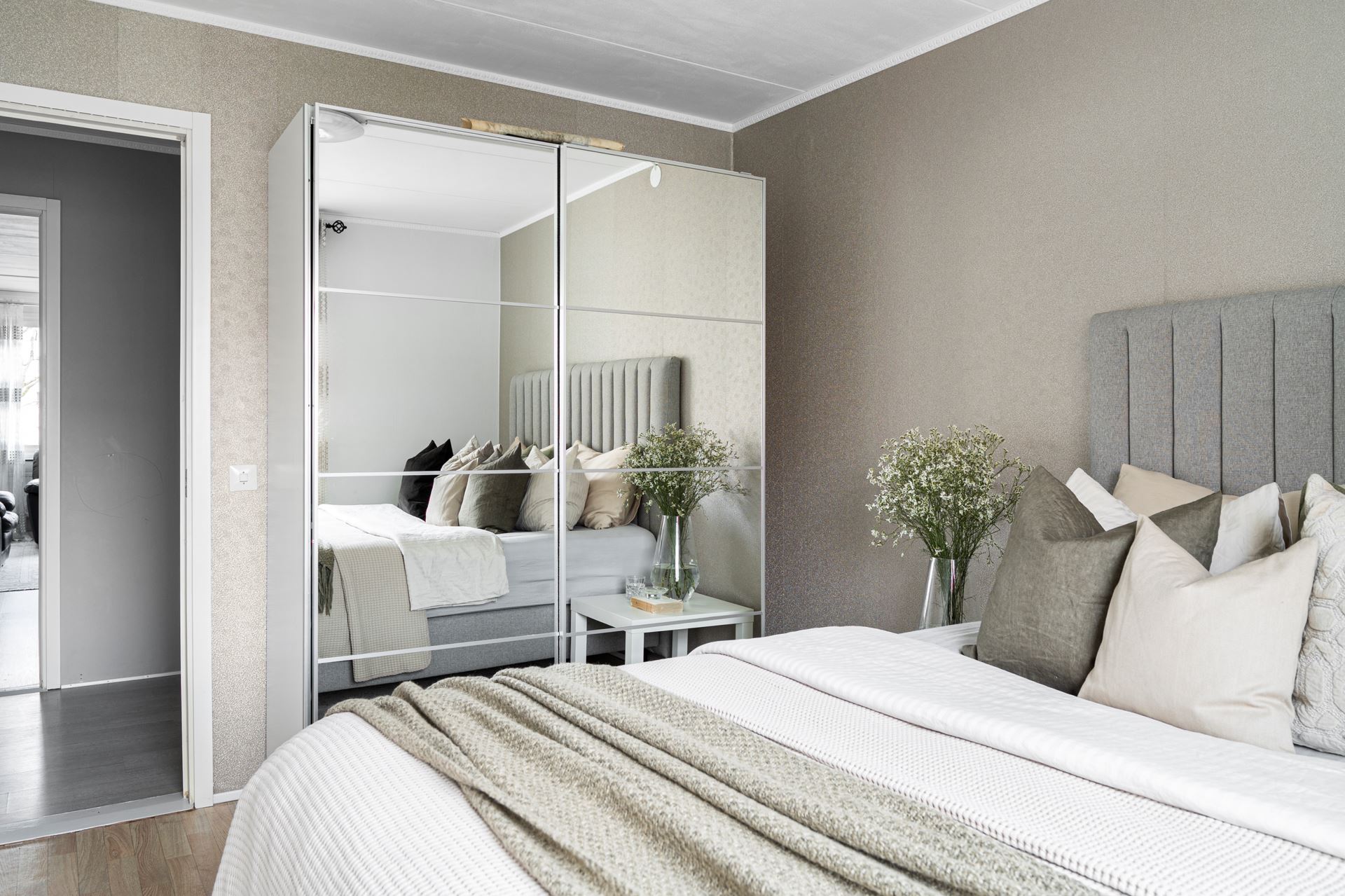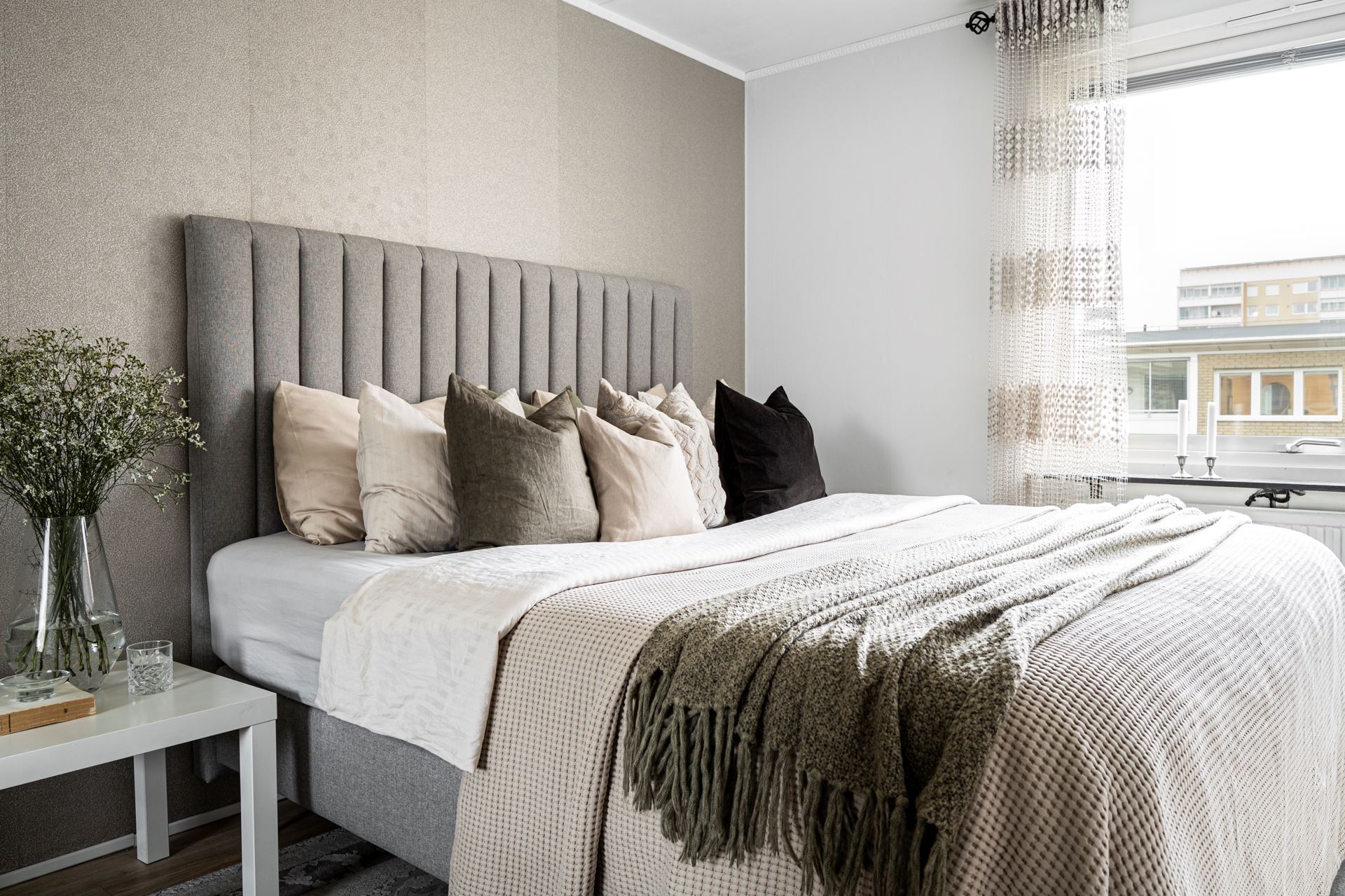 Vägg i vägg finner vi det något större sovrummet, beige tapet på väggar tillsammans med laminatgolv. Här finns plats för större dubbelsäng, sängbord och mer därtill.