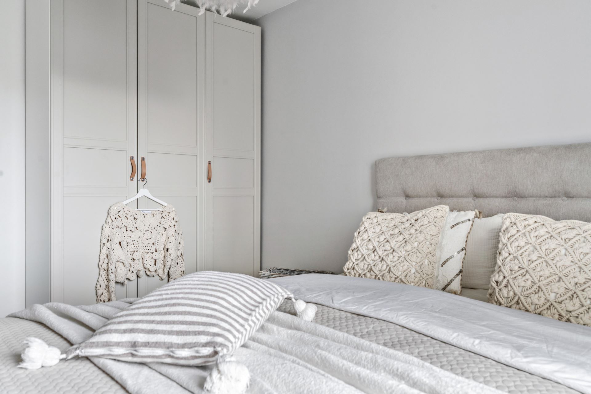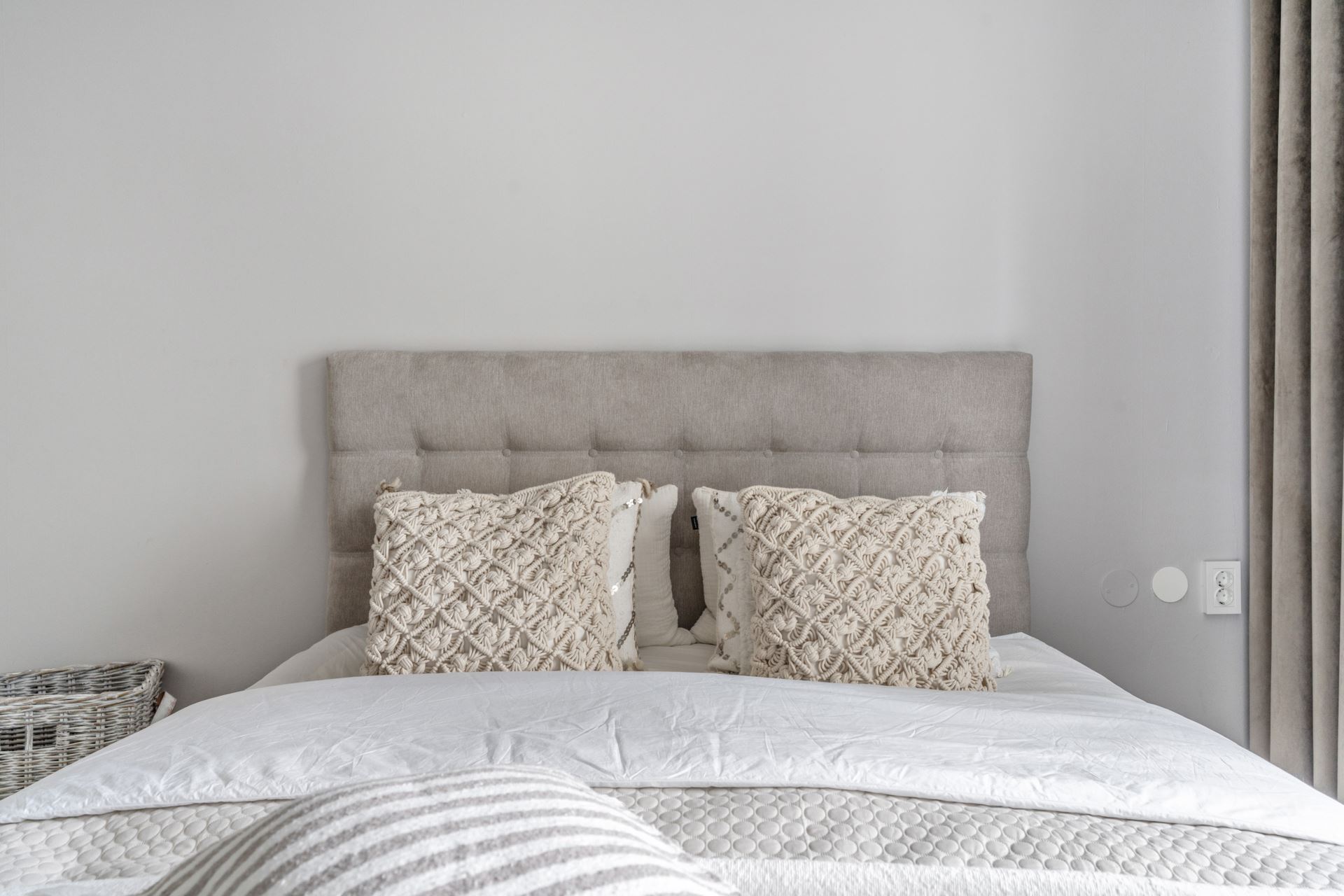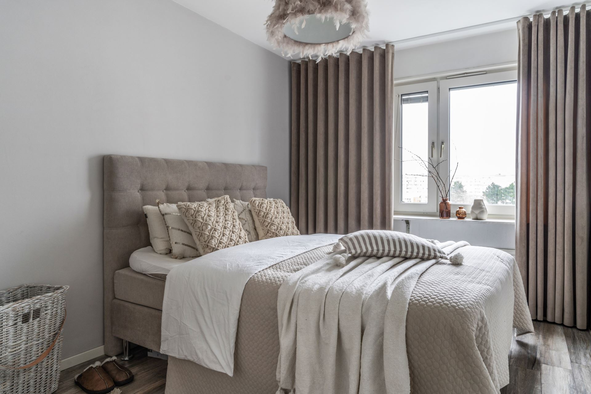 Rymligt sovrum, här ryms enkelt en dubbelsäng och sängbord. Det finns även plats till att sätta in ytterligare förvaringsmöbler efter behov. Vi får fint ljusinsläpp från större fönsterparti, detta tillsammans med snyggt laminatgolv och ljusgråa tapeter på väggarna.