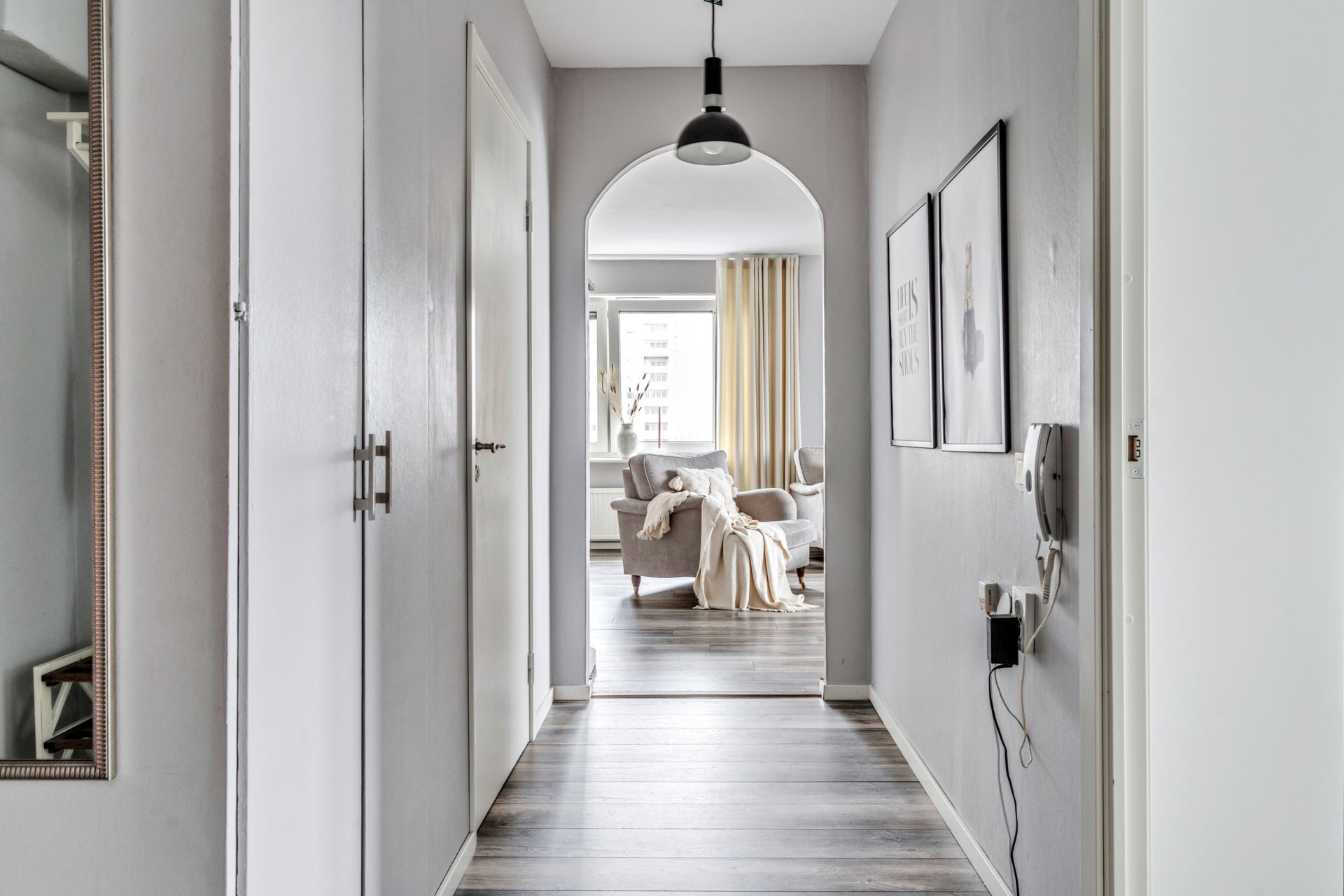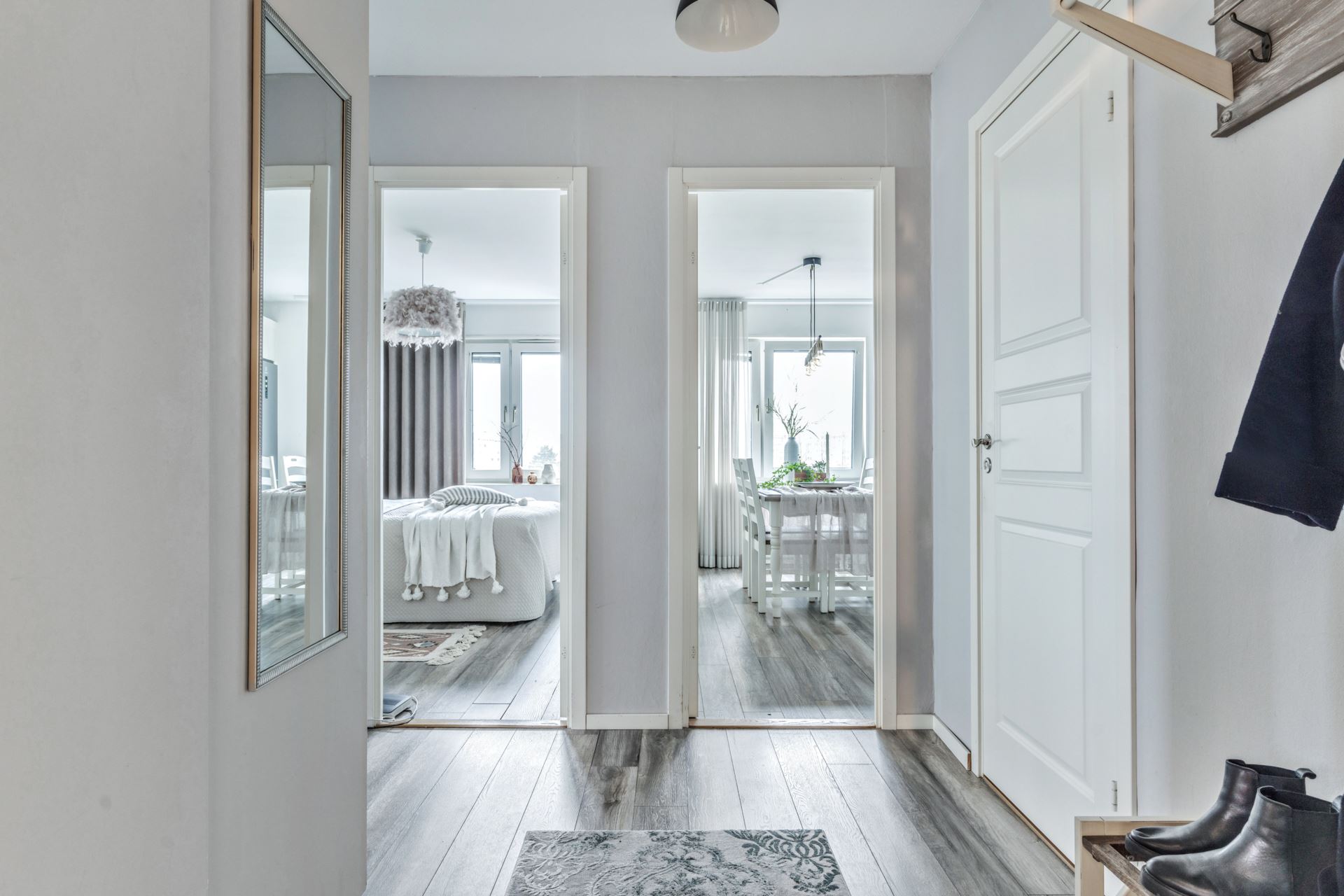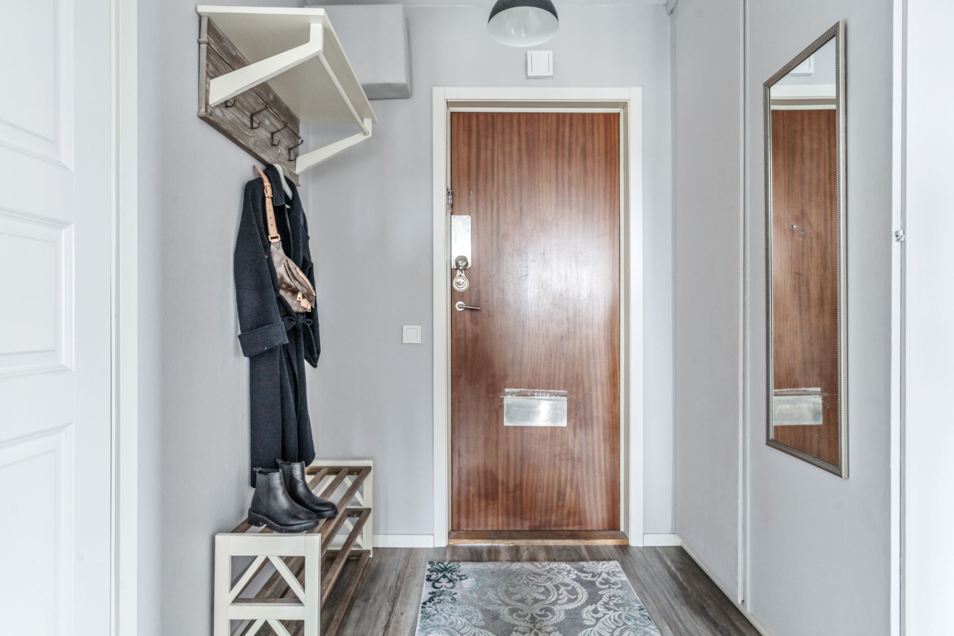 Vi tar hissen upp till sjätte våningen och välkomnas in i praktisk hall med laminatgolv på golv och ljusa tapeter på väggarna. Här finns utrymme till avhängningsmöjligheter till höger, mer förvaringsutrymme hittar vi även bakom integrerad garderob.