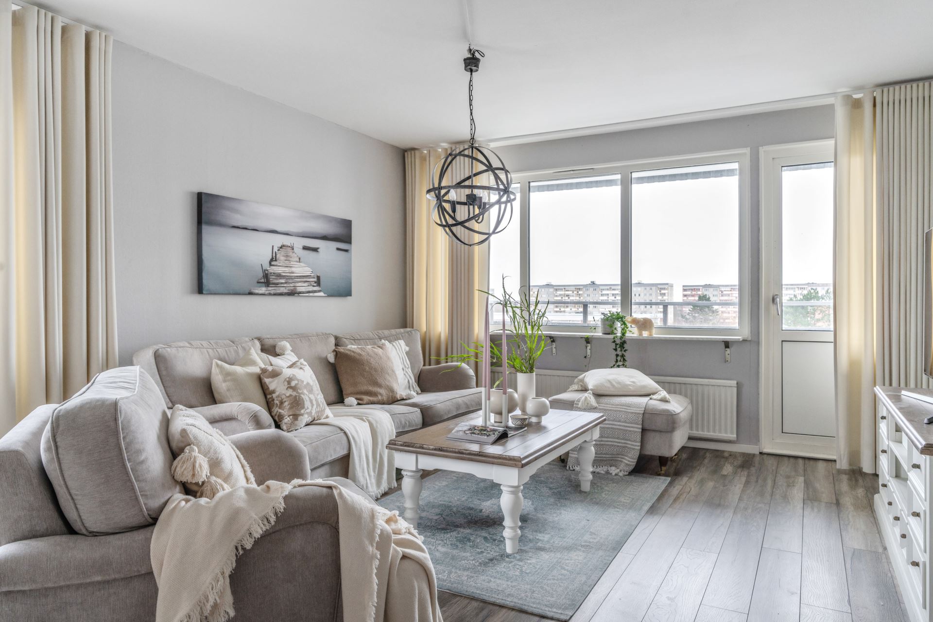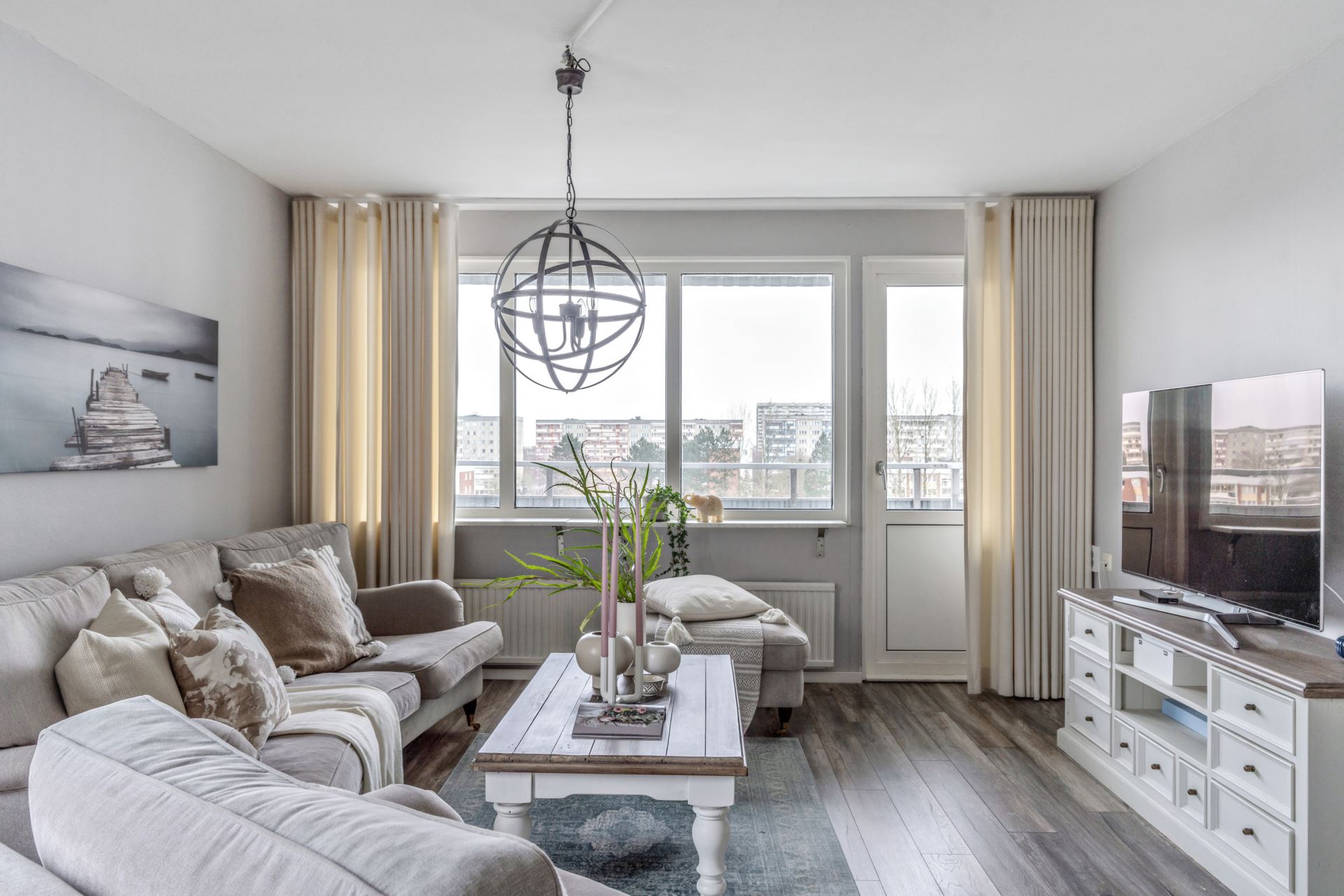 Det bjuds på ett generöst vardagsrum med plats för både soffgrupp, matbord eller kontorsdel om så önskas. I detta rum hittar vi ljust laminatgolv tillsammans med ljusa tapeter på väggar. Stort fönsterparti med härligt ljusinsläpp, även här vi hittar utgång till balkongen som ger gott om plats för utemöblering.