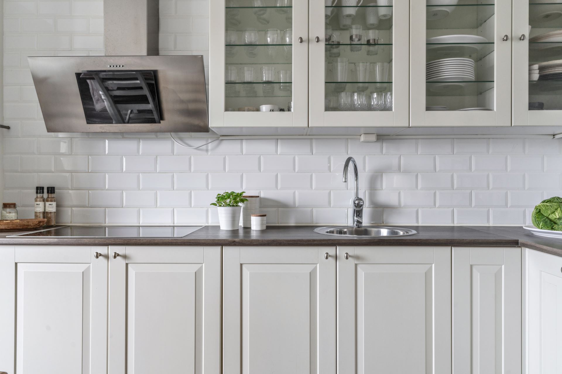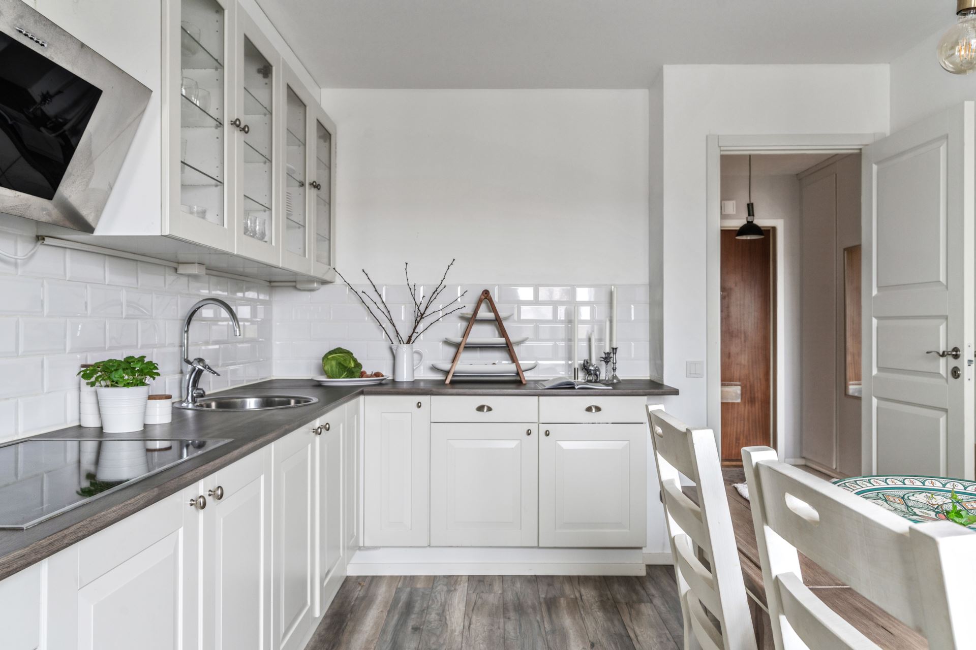 Vidare in öppnar lägenheten upp mot köket. Ett stilrent och praktiskt vinkelkök med förvaringsutrymme bakom snygga köksluckor och generösa arbetsytor i kombination med vitt kakel en träbänksskiva. Ett Marbodal kök (2017) som är utrustat med kyl och frys (Electrolux), spishäll, köksfläkt och en kombiugn. Här finns plats för större matplats mot fönsterparti som tillför extra ljusinsläpp.