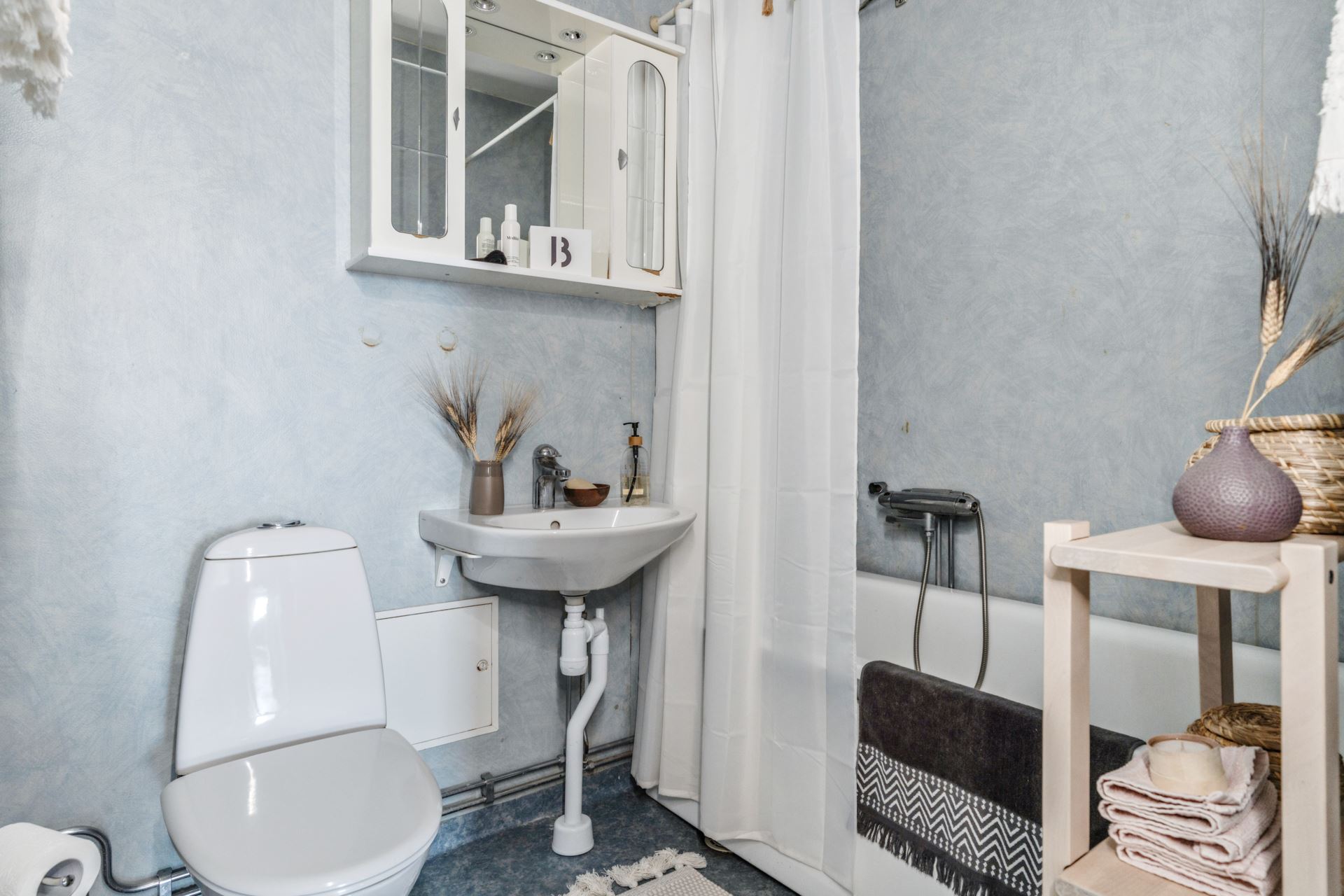 Badrum med badkar, spegelskåp och WC. Ytskikt är i original med våtrumsmatta och våtrumstapet på väggarna.