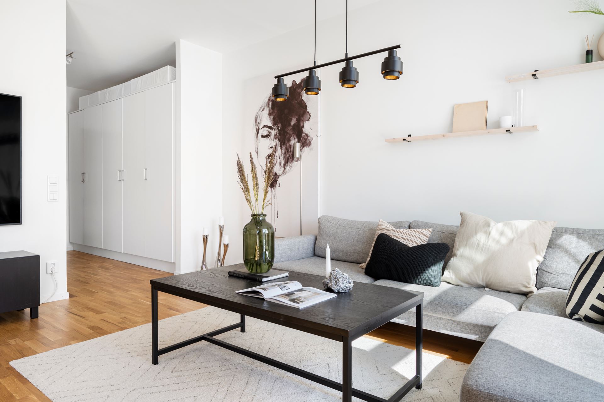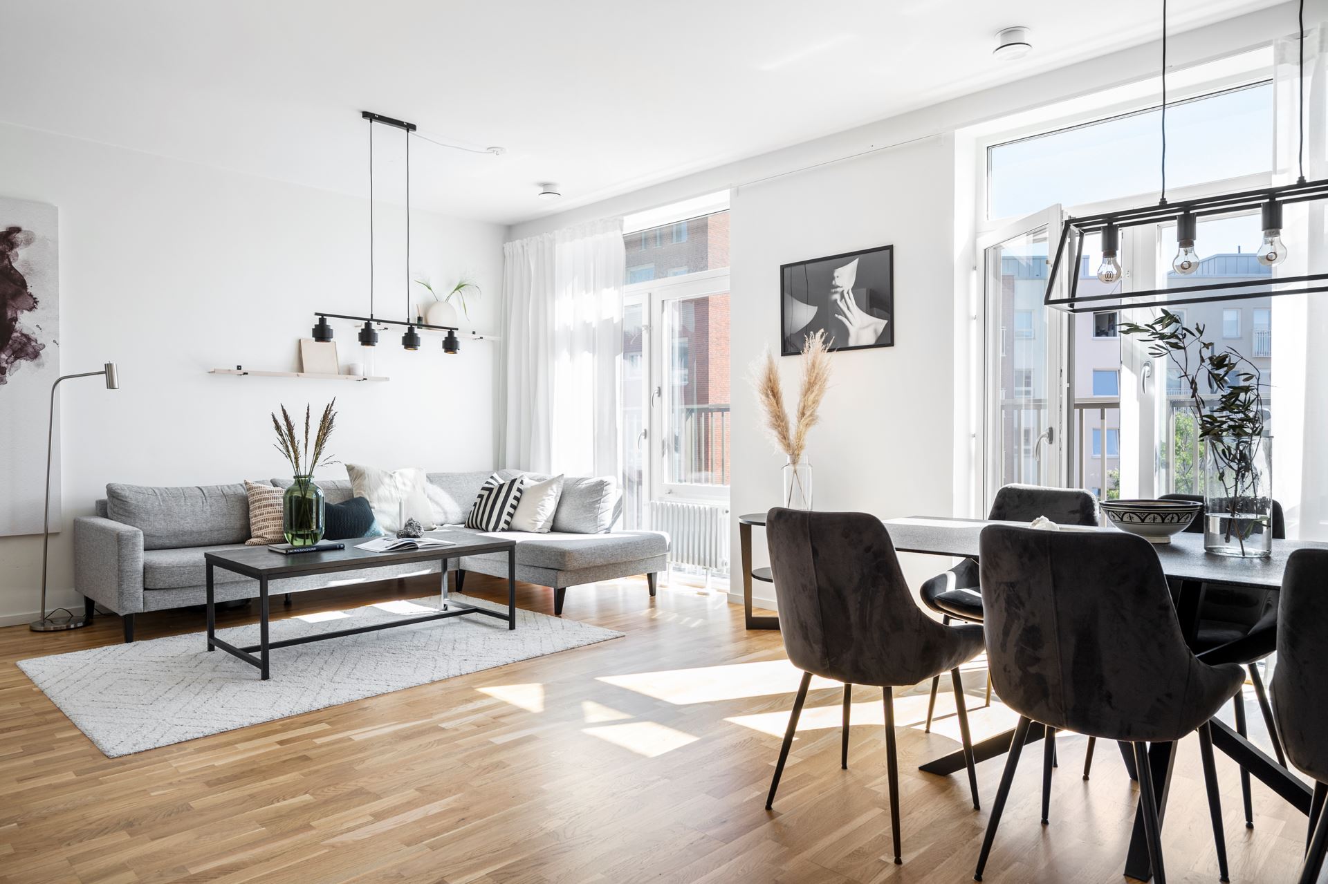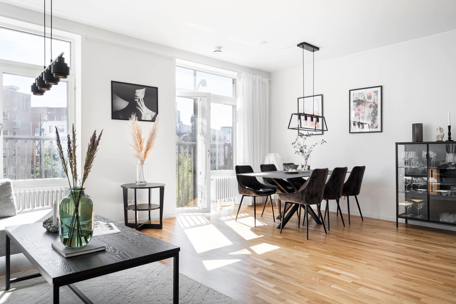 Rakt fram bjuder vardagsrummet in med ett slående ljusinsläpp ifrån två stora fönsterpartier som sträcker sig från golv till tak, liksom dubbla franska balkongdörrar. Rummet präglas av ljus och rymd tack vare väl tilltagen takhöjd om 2,7 meter. Här kan enkelt möbleras med såväl soffgrupp som ett större middagsbord utan att den luftiga känslan går förlorad.