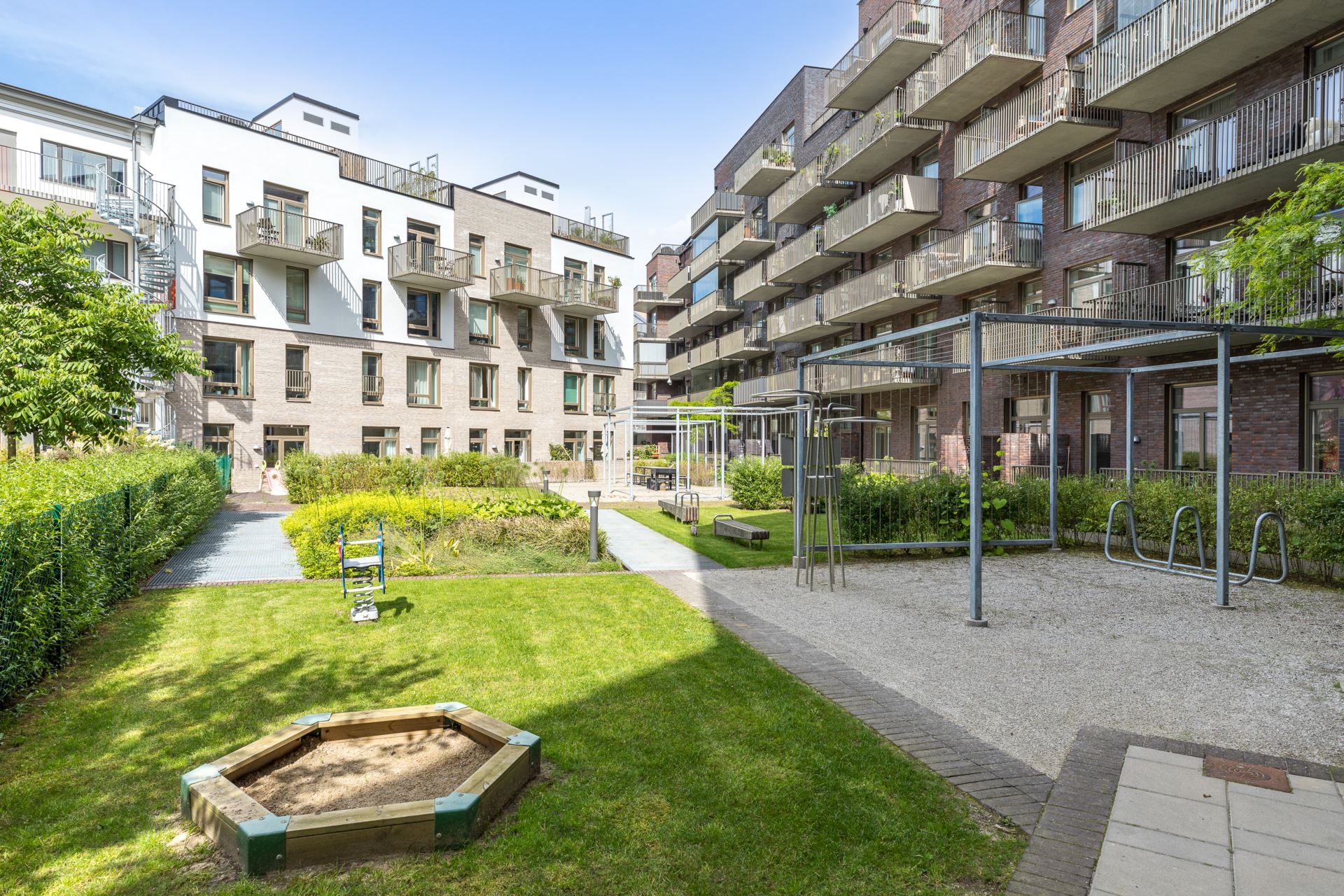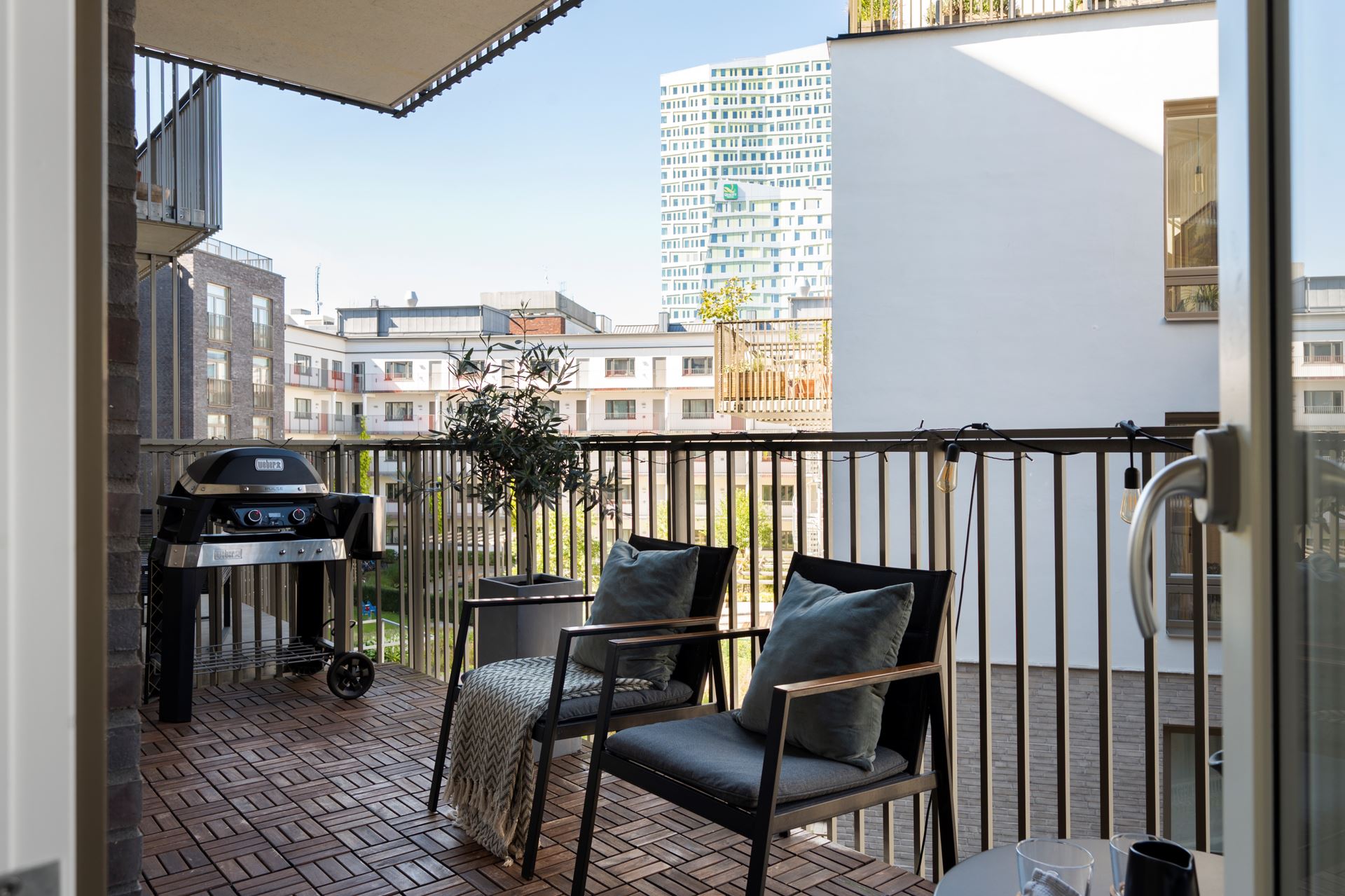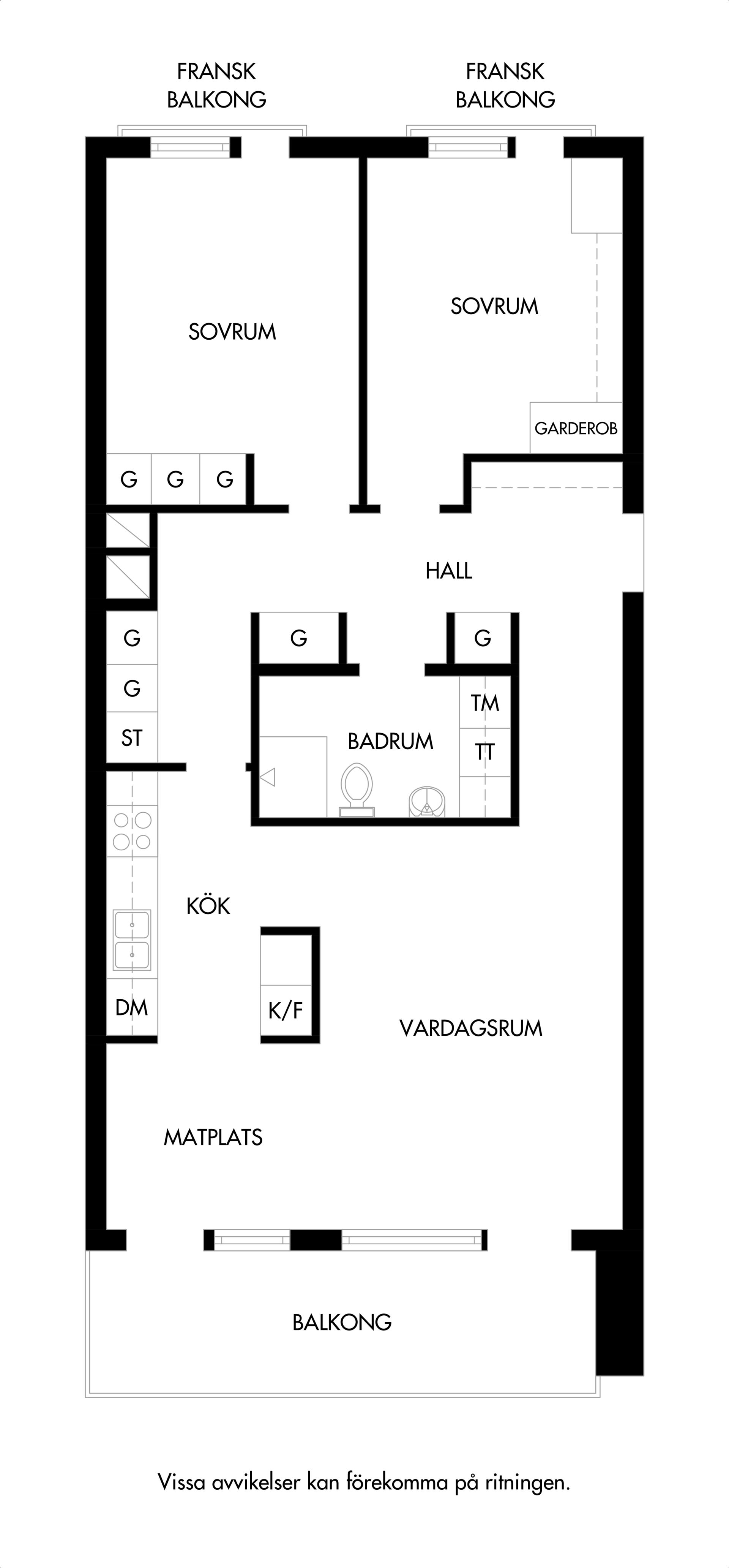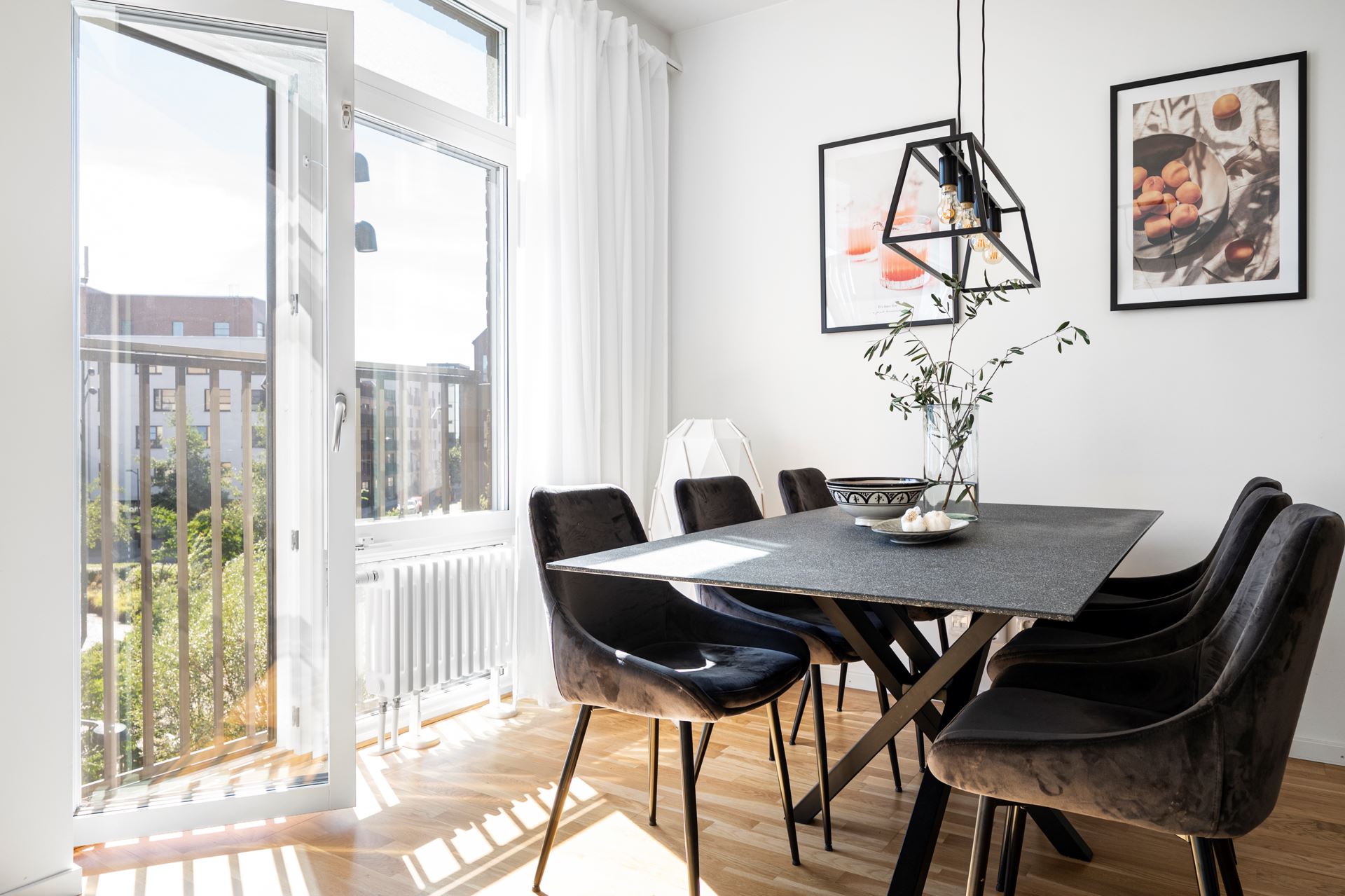 Rakt fram bjuder vardagsrummet in med ett slående ljusinsläpp ifrån två stora fönsterpartier som sträcker sig från golv till tak, liksom dubbla franska balkongdörrar. Rummet präglas av ljus och rymd tack vare väl tilltagen takhöjd om 2,7 meter. Här kan enkelt möbleras med såväl soffgrupp som ett större middagsbord utan att den luftiga känslan går förlorad.