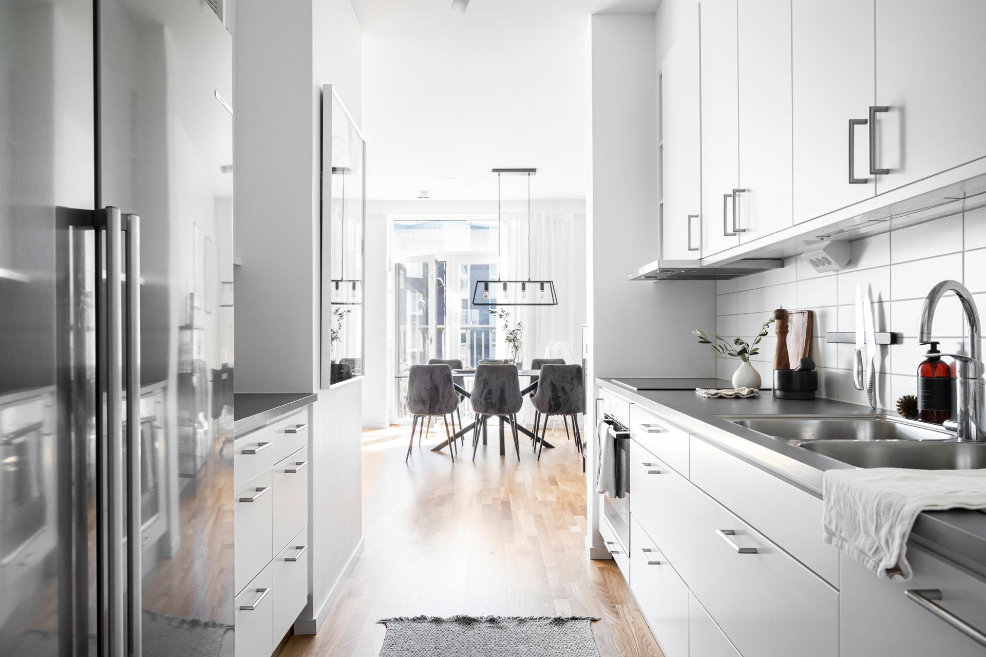 Ifrån vardagsrummet åtnjuts en trevlig kontakt med köksdelen som bjuder på vita köksluckor och skåp (Vedum) tillsammans med förvaringsmöjligheter och accentueras av matt vitt kakel ovanför grå laminatarbetsbänkar. Köksmaskinerna består av kyl och frys i fullhöjd, ugn, spishäll, fläkt (Franke), integrerad diskmaskin samt mikro. Samtlig utrustning från Bosch.