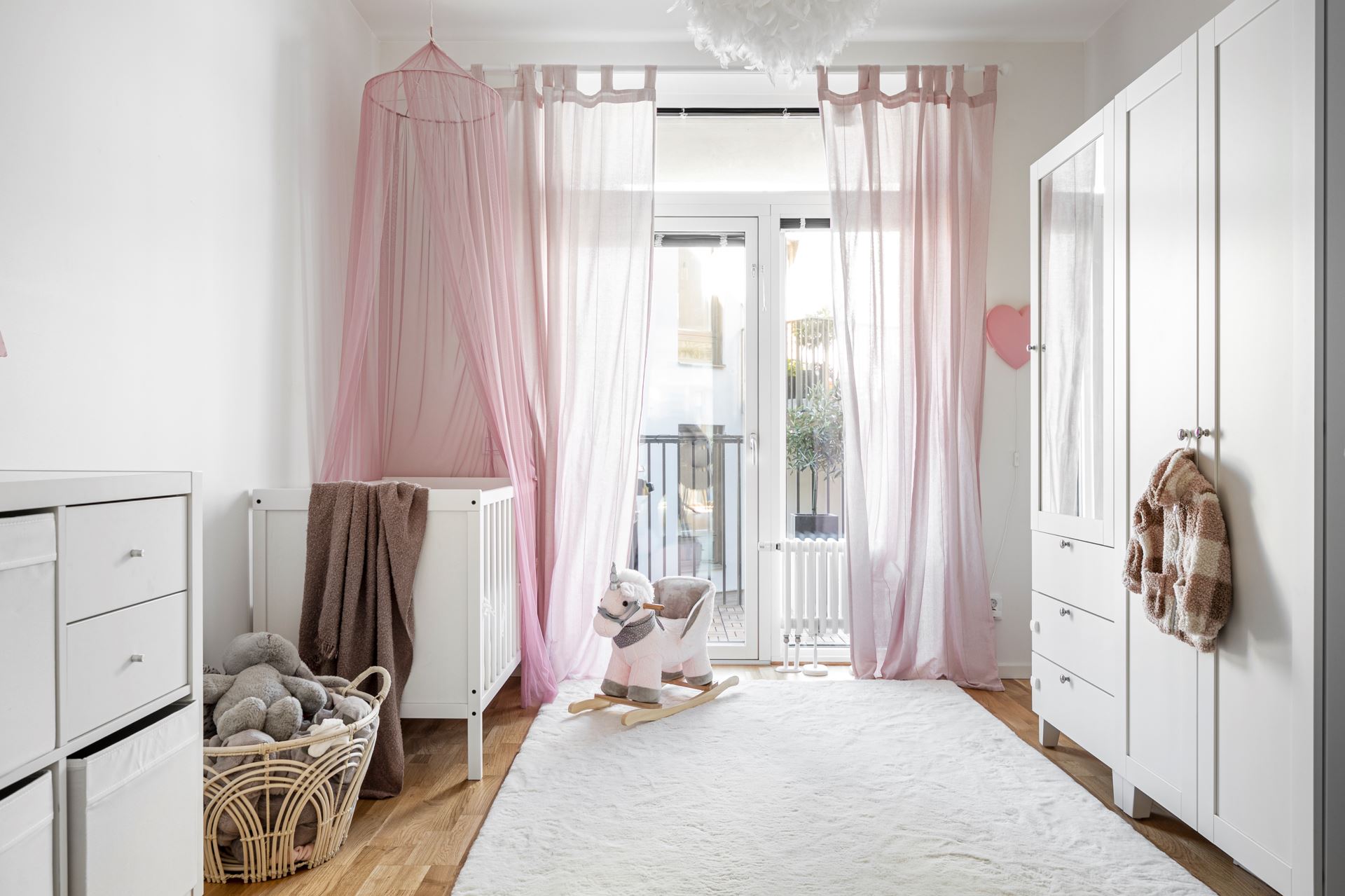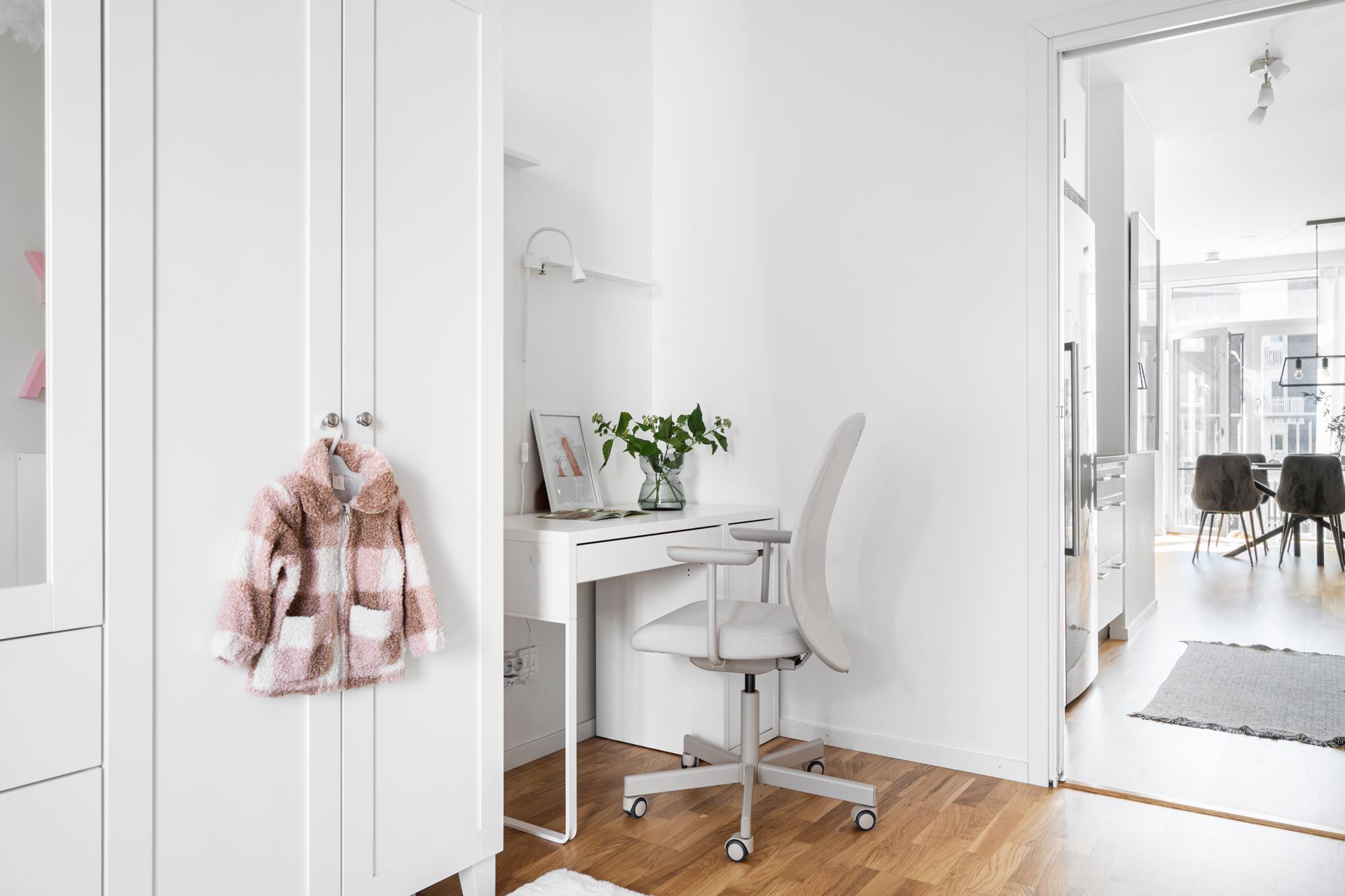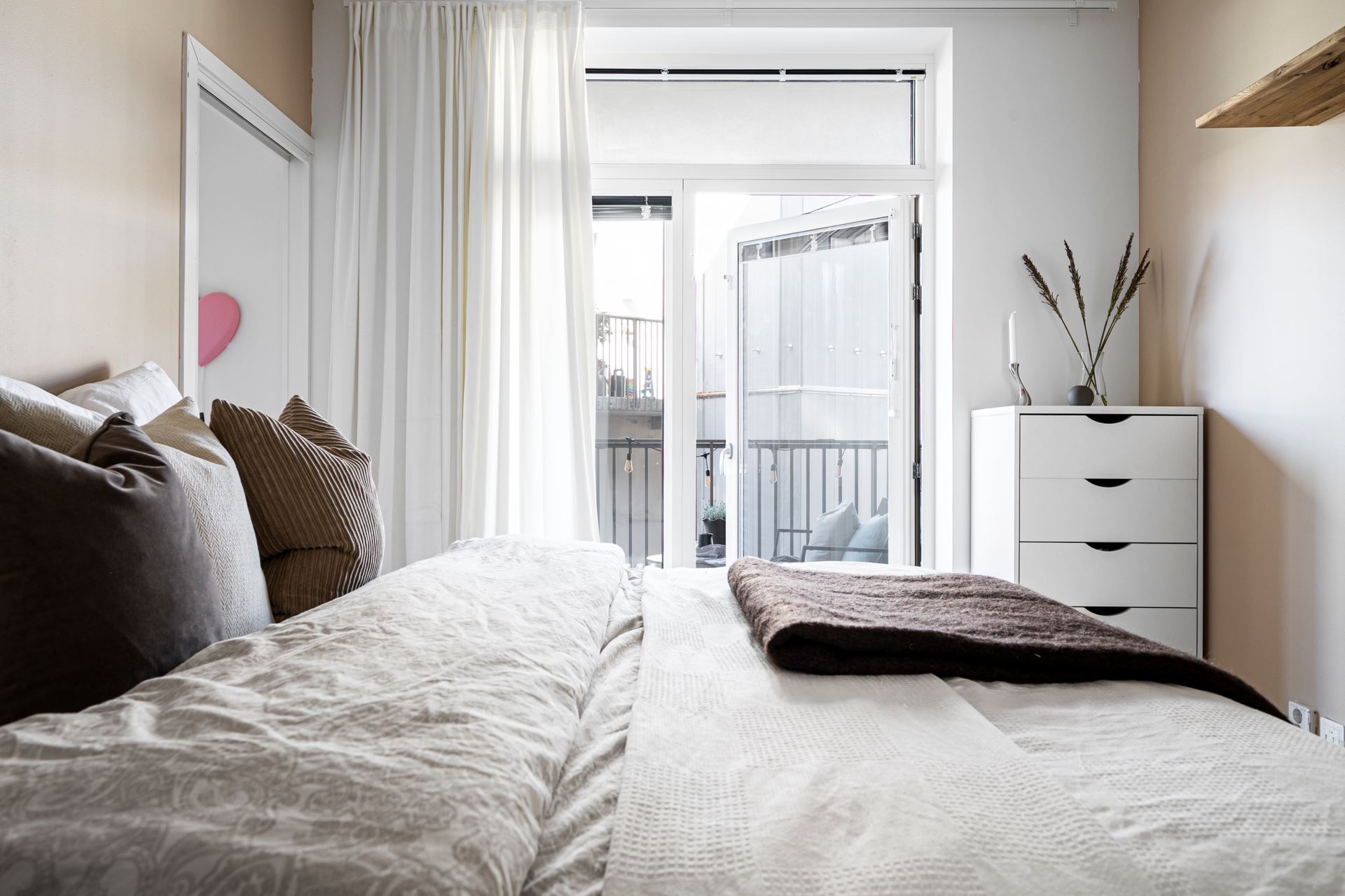 Sovrum nummer två nås från både ovan sovrum och ifrån köket. Så gott som identiskt till sin utformning och storlek och även här bjuds man på utgång till balkongen som extra bonus. Praktiska skjutdörrar mellan de båda sovrummen effektiviserar ytan på bästa vis. Från de båda sovrummen når vi bostadens balkong, belägen i attraktivt västerläge mot föreningens innergård. På balkonggolvet ligger tåligt trägolv, både snyggt och praktiskt.