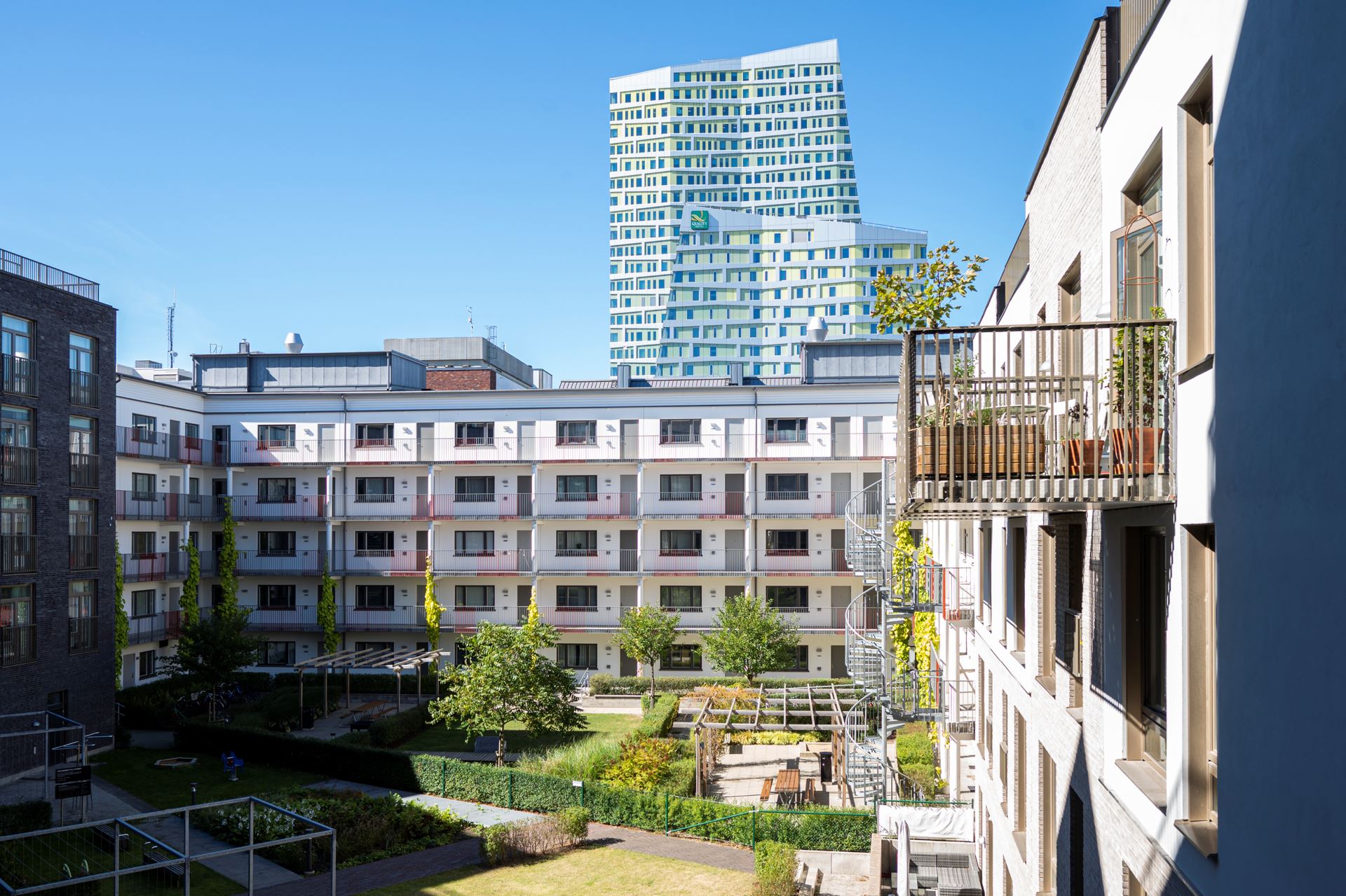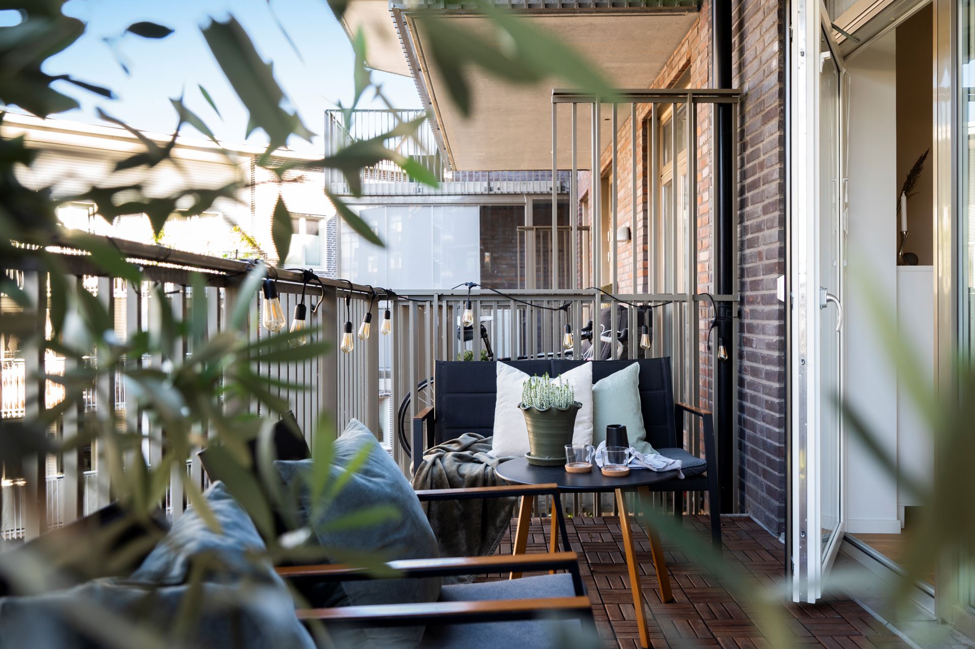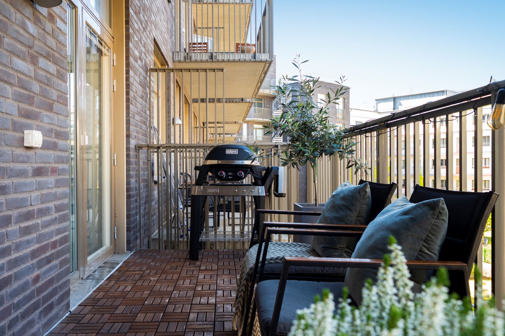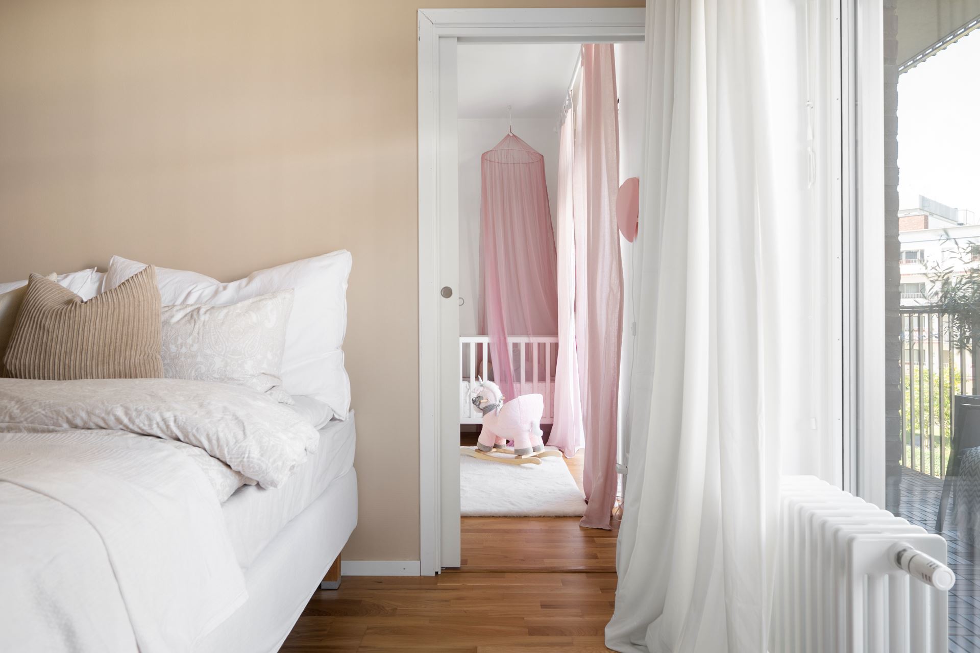 Sovrum nummer två nås från både ovan sovrum och ifrån köket. Så gott som identiskt till sin utformning och storlek och även här bjuds man på utgång till balkongen som extra bonus. Praktiska skjutdörrar mellan de båda sovrummen effektiviserar ytan på bästa vis. Från de båda sovrummen når vi bostadens balkong, belägen i attraktivt västerläge mot föreningens innergård. På balkonggolvet ligger tåligt trägolv, både snyggt och praktiskt.