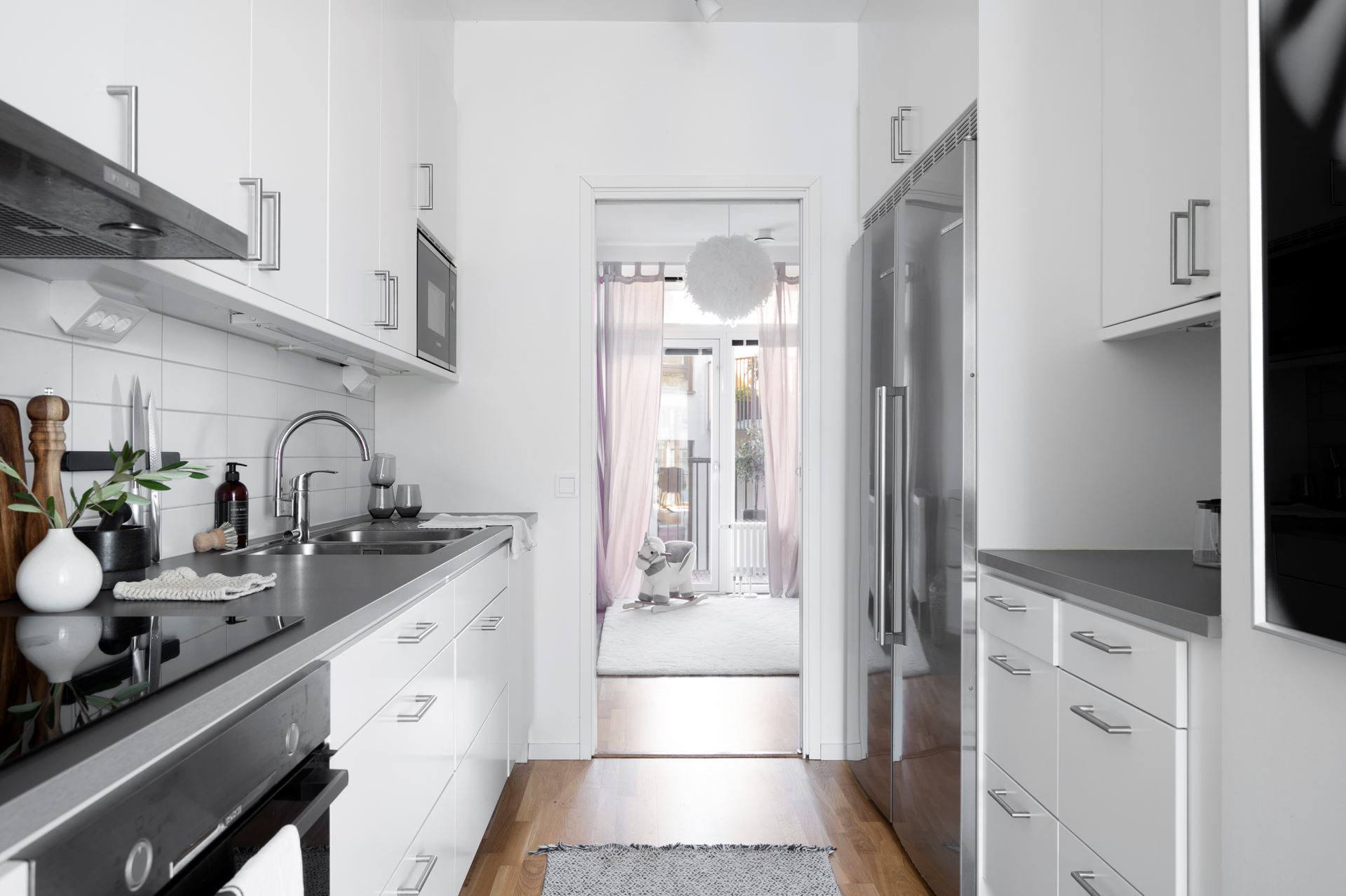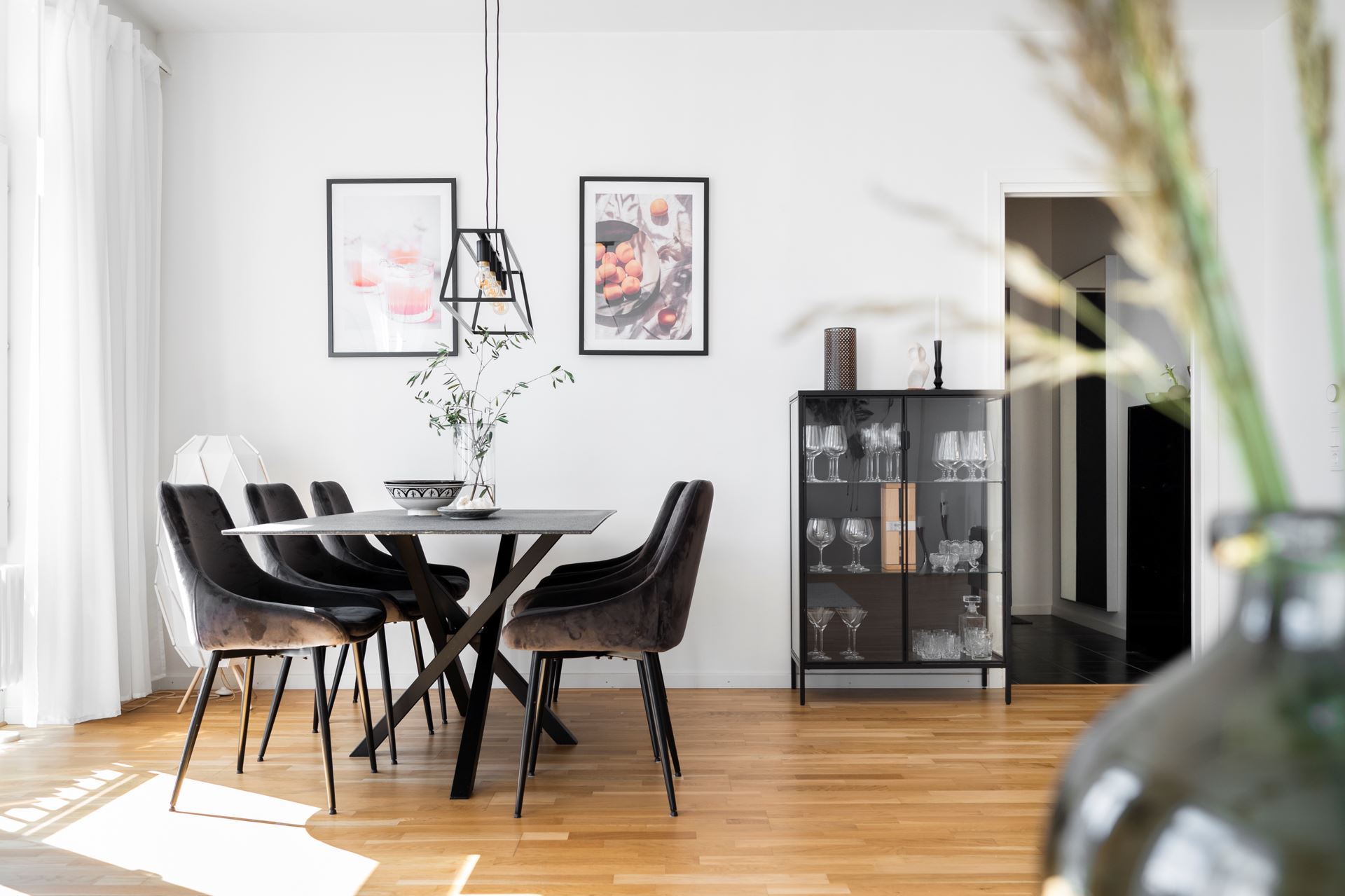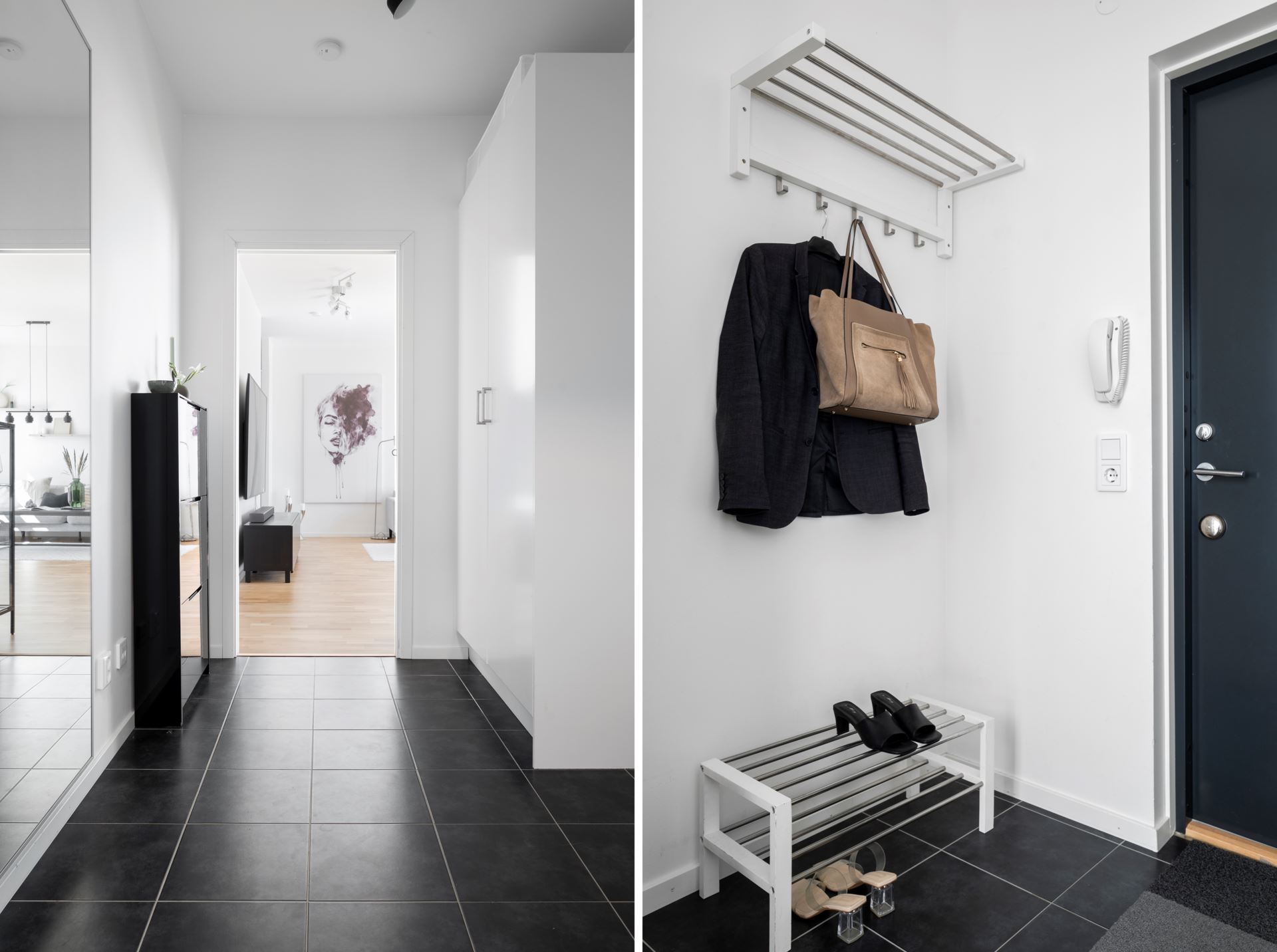 Hallen inviterar med elegant grått klinkergolv som möter släta, vitmålade väggar, vilket är ett färgval som genomsyrar större delen av bostaden och skapar en ljus och tilltalande känsla. Vacker trestavs ekparkett pryder golven på enhetligt vis. Här finns plats för avhängning av ytterkläderna och goda förvaringsmöjligheter erbjuds i vita garderober. Ett par steg in övergår klinkern i tidlös parkett som pryder golvet genom hemmets resterande delar.