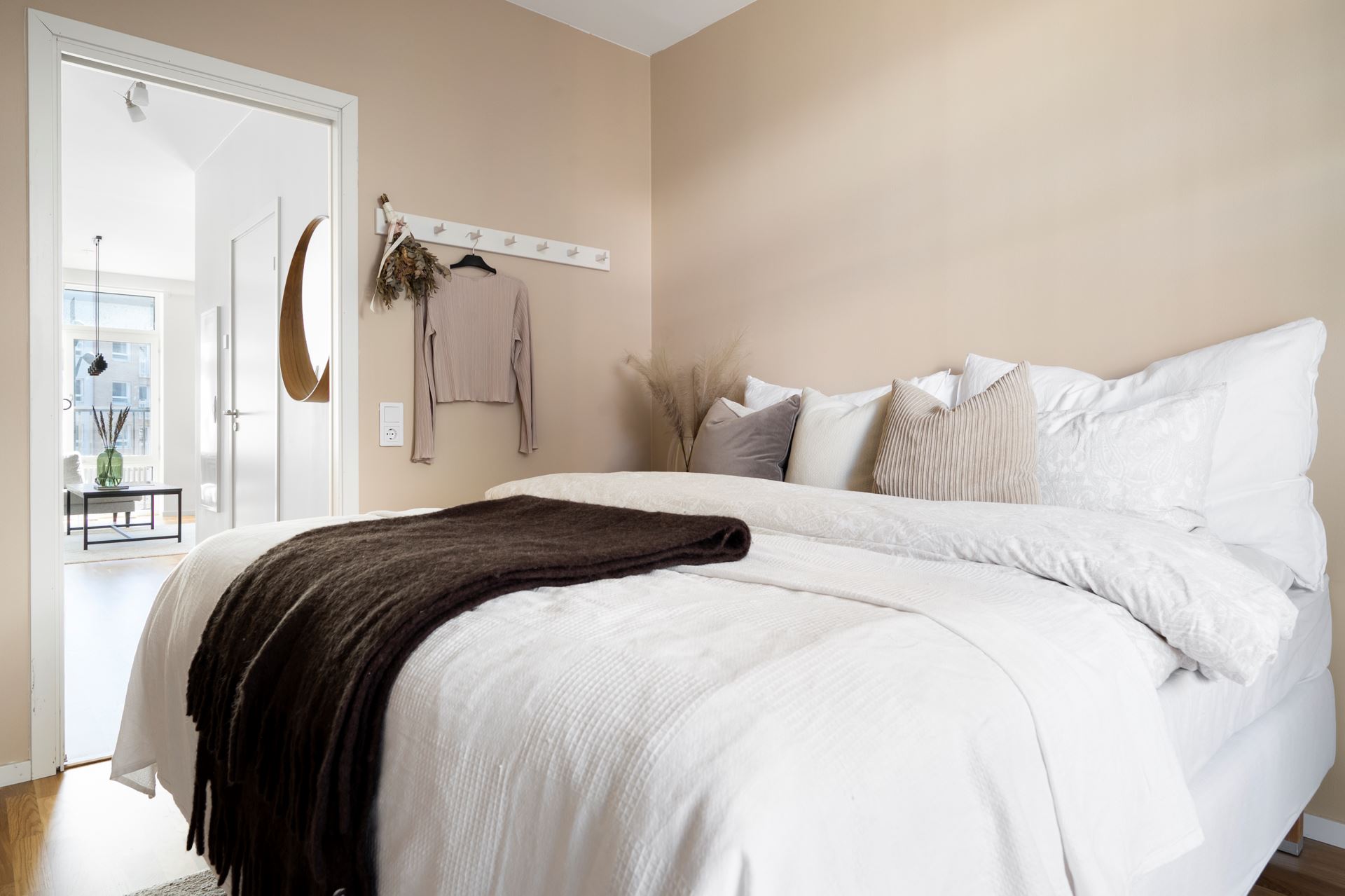 Ett behagligt sovrum som med lätthet inrymmer dubbelsäng och tillhörande möblemang. Rikligt med ljusinsläpp ifrån ett stort fönster med överliggande ljus och helglasad balkongdörr mot balkongens tilltalande miljö. Släta ljusa väggar och på golvet vilar vacker ekparkett. Rummet nås ifrån en passage mot vardagsrummet, där flertalet garderober erbjuder förvaring av säsongernas plagg.
