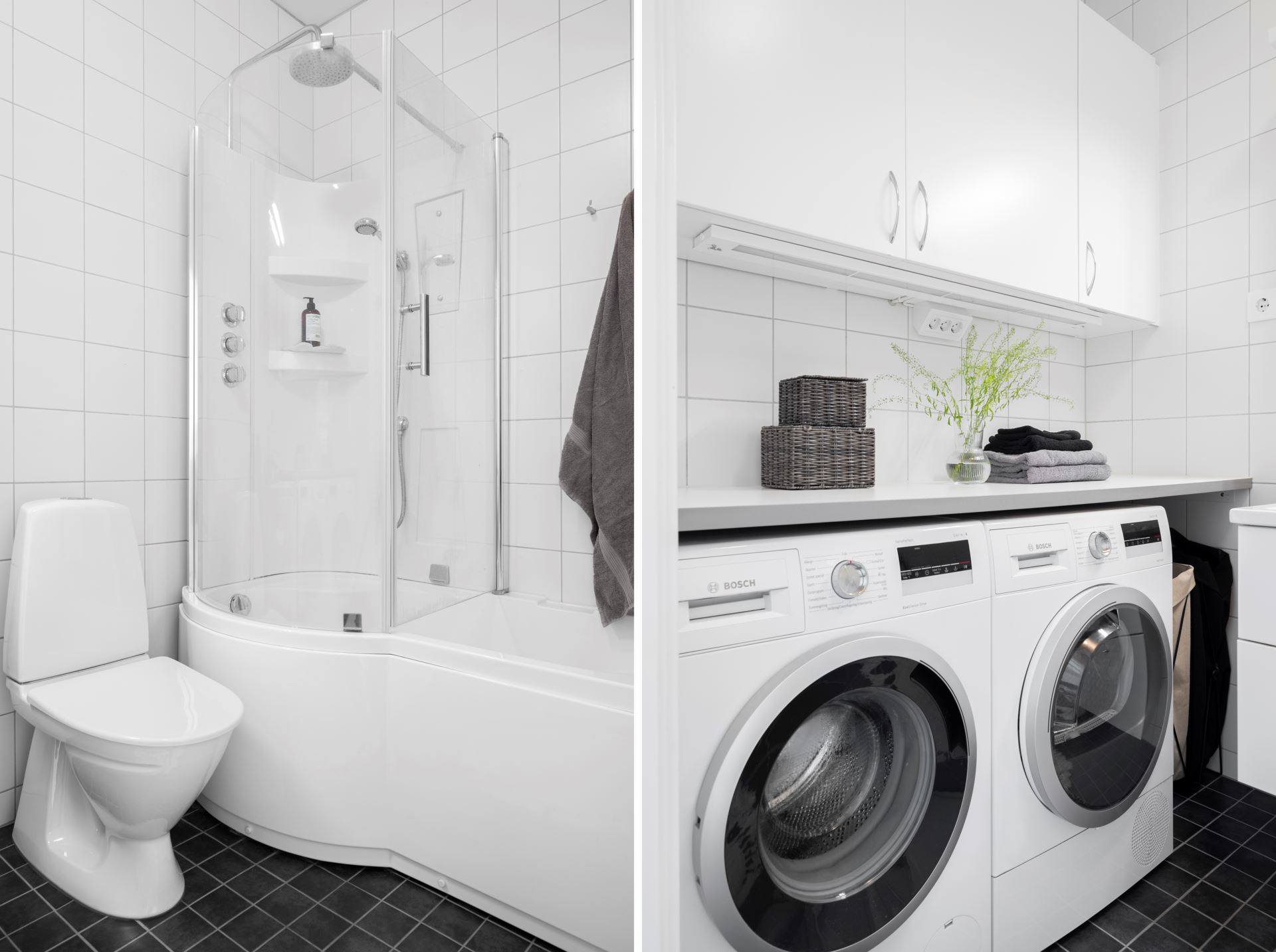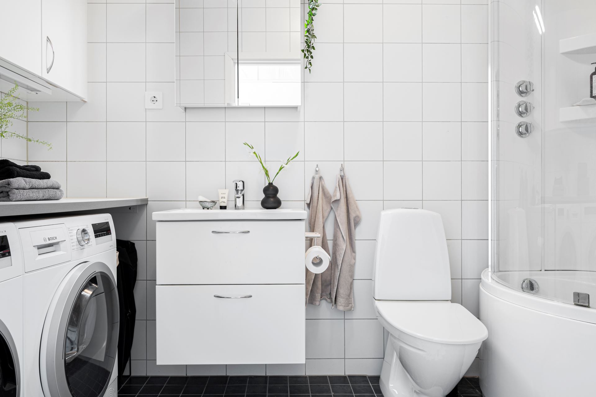 Stilsäkert helkaklat badrum med grått klinkergolv och vitkaklade väggar. Kombidusch med badkar (duschdörrarna i original finns i källarförrådet) handfat med vit kommod, wc samt badrumsskåp med spegel och belysning. Egna tvätt- och torkmöjligheter därtill för högsta komfort med tvättmaskin och torktumlare samt arbetsbänk i laminat ovanför, liksom vita vägghängda skåp med infälld belysning.