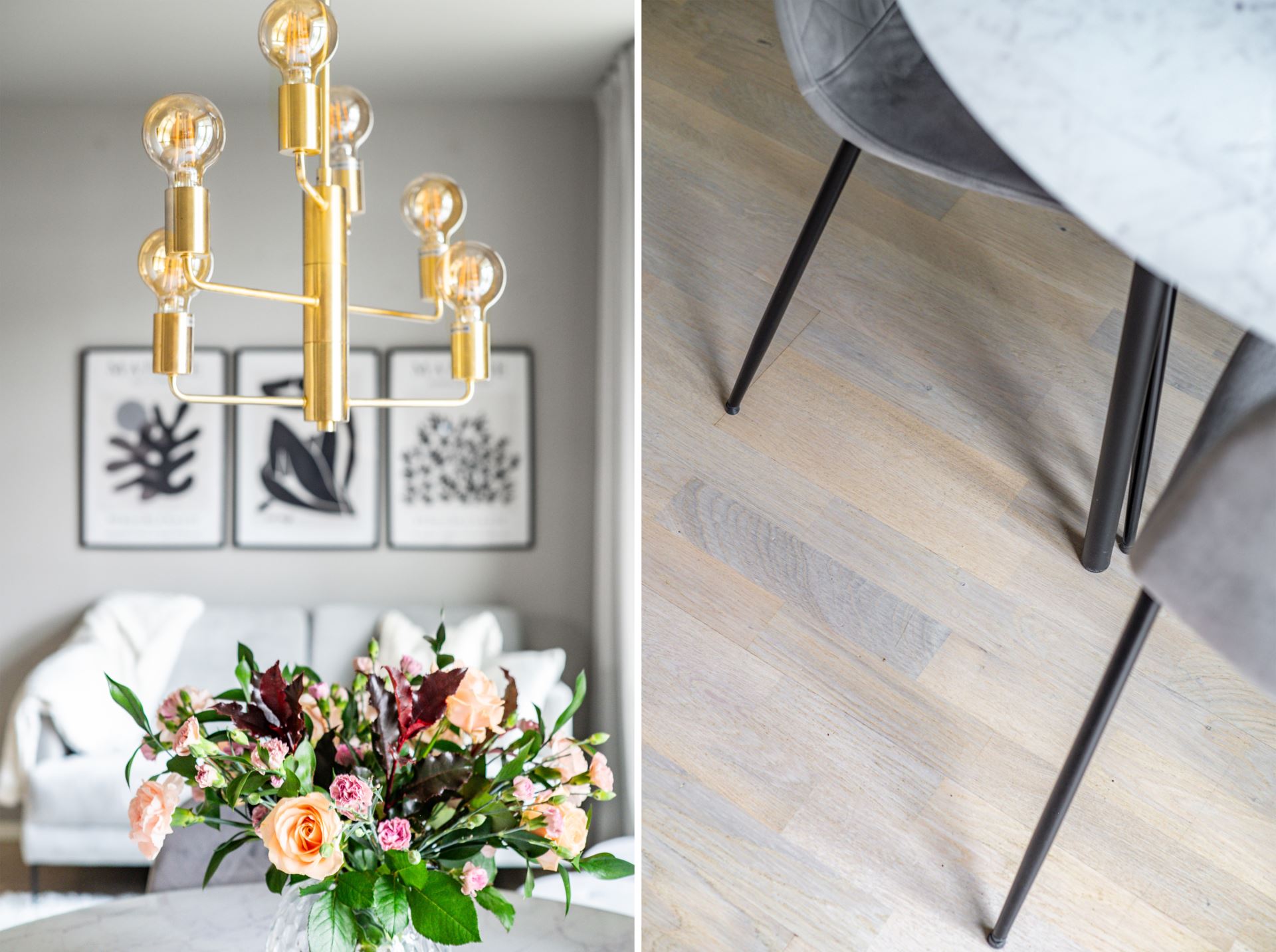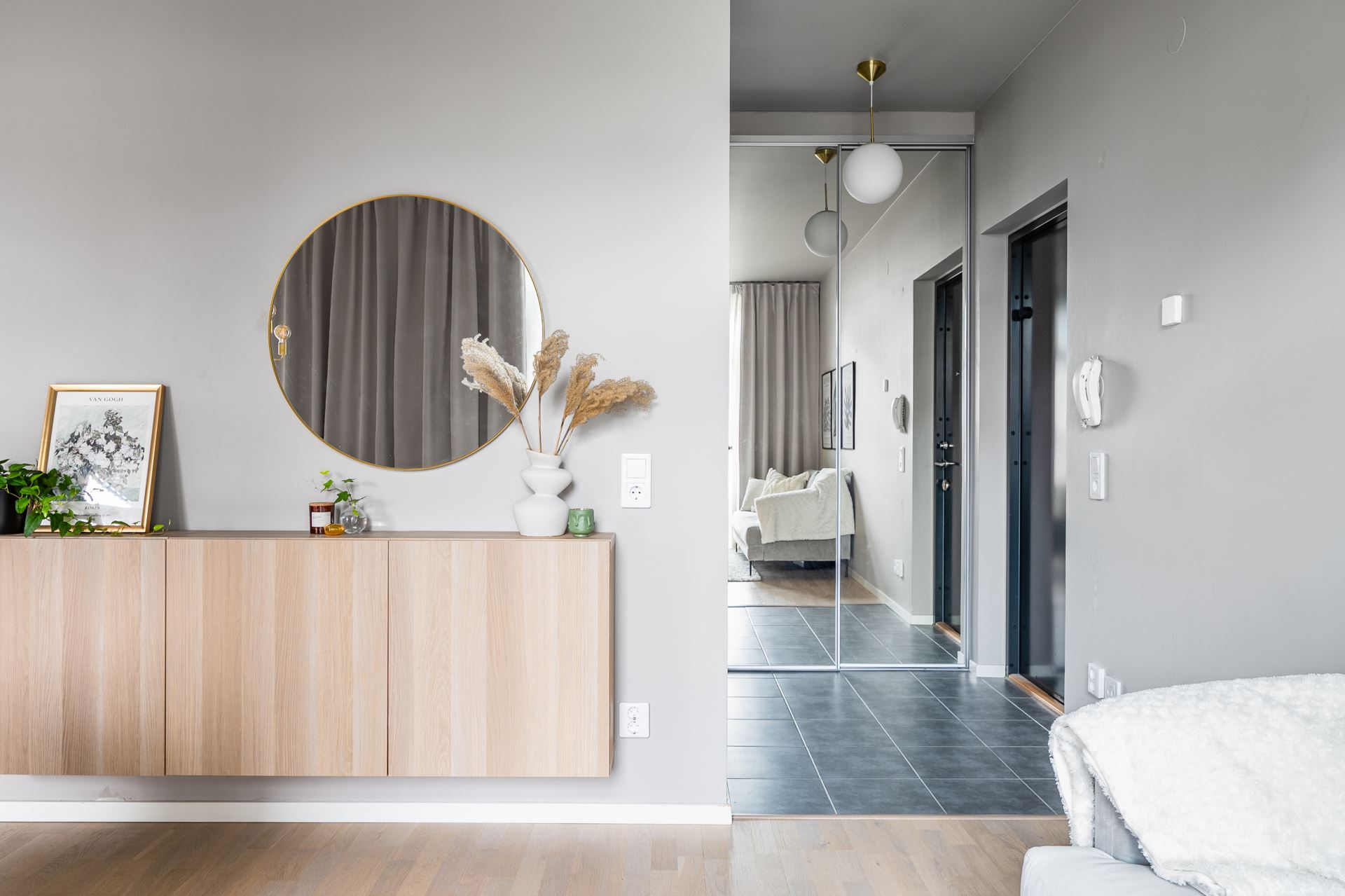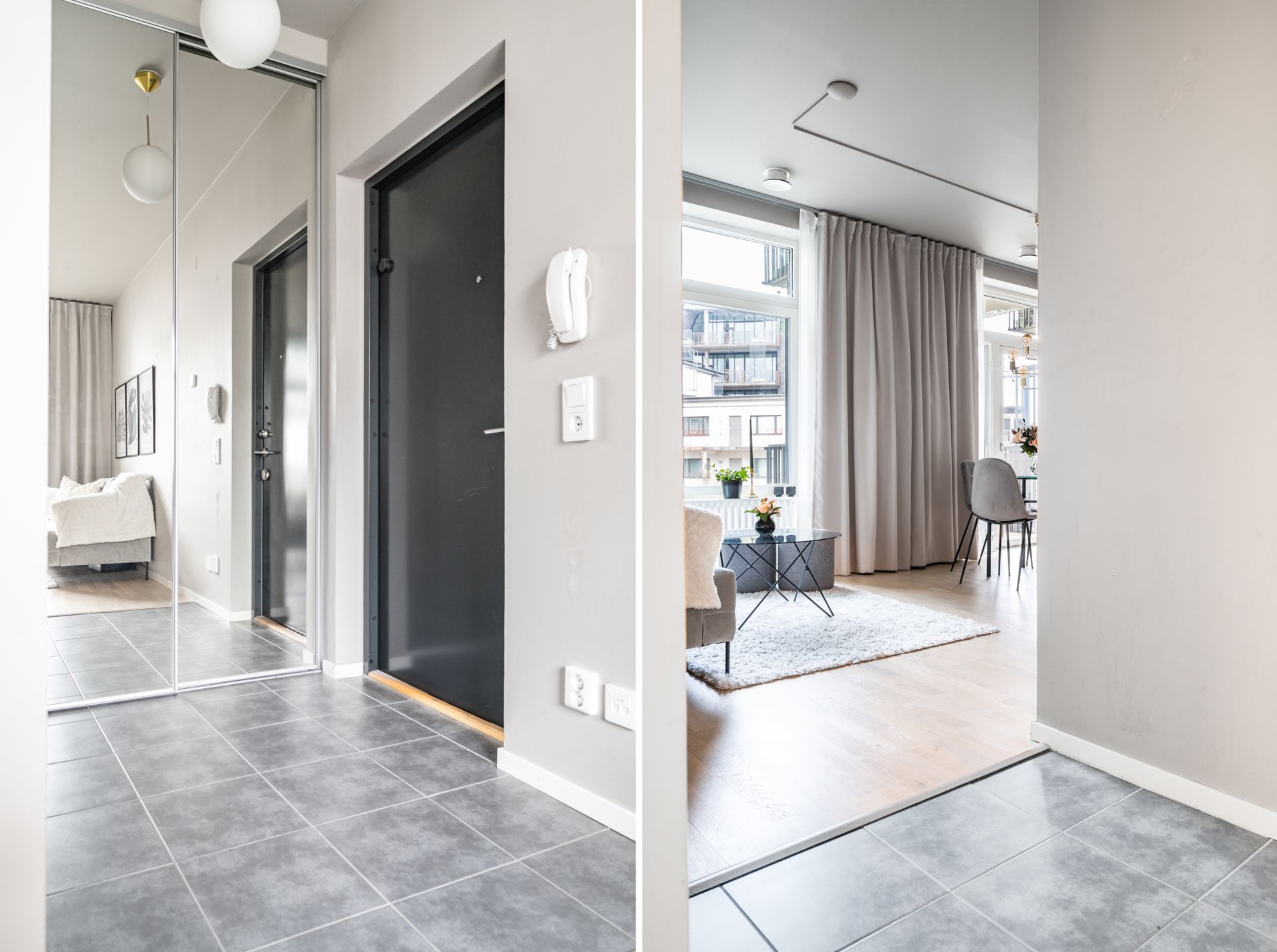 Vi tar hissen från markplan upp till tredje våningen där vi välkomnas in i detta stilsäkra hem med ytterst välplanerade kvadratmeter. Hallen bjuder på stora mörka klinkers vid entrén och ytterligare förvaring nås på höger hand bakom spegelbeklädd skjutdörrsgarderob. Dessutom plats för mindre hallmöbel och avhängningsmöjligheter.
