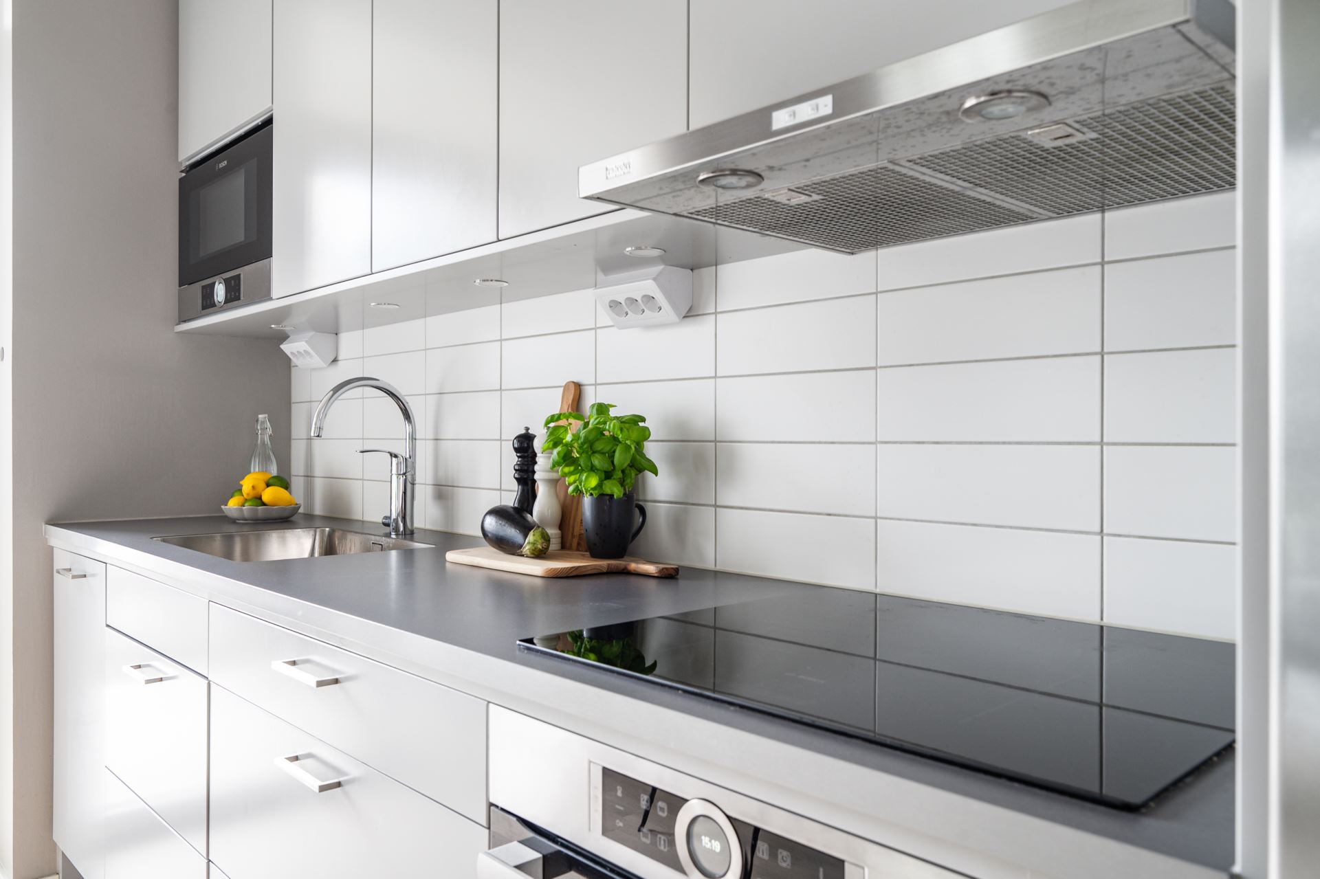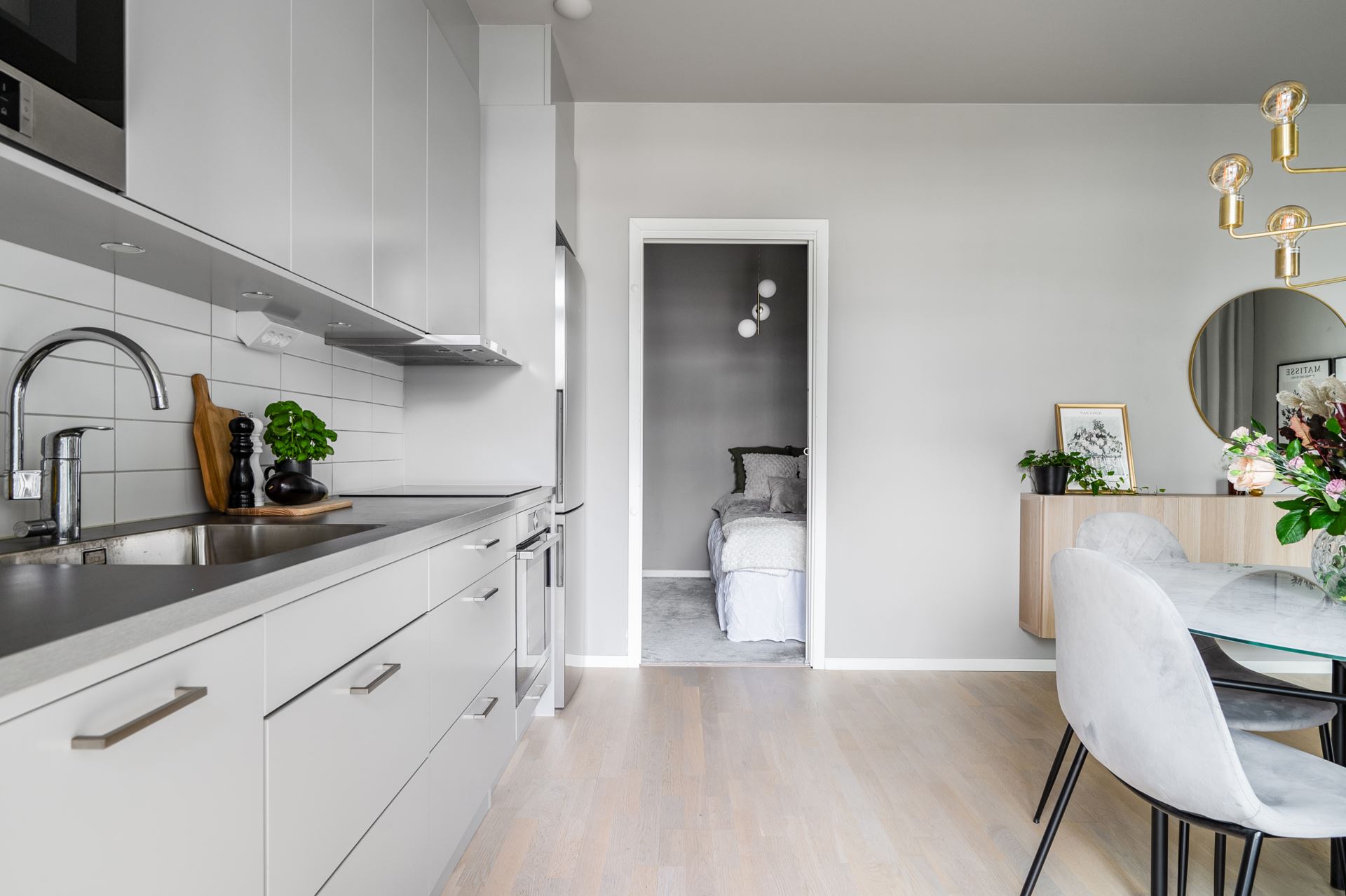 Kök och vardagsrum i samma toner med gråa köksluckor som kombineras med vitt kakel och bänkskiva i laminat. Köket bjuder på utmärkta arbetsytor som så väl förvaringsmöjligheter. Köket är utrustat med delad kyl och frys, spishäll, ugn, mikro, diskmaskin och fläkt.