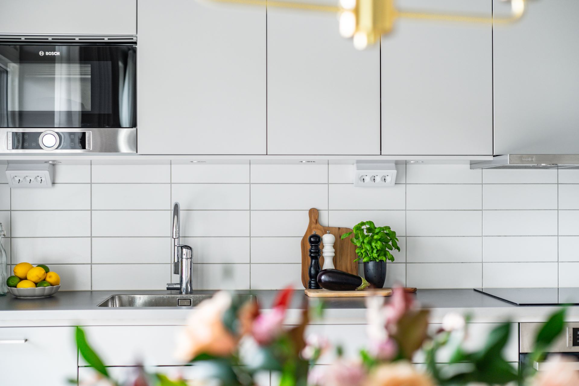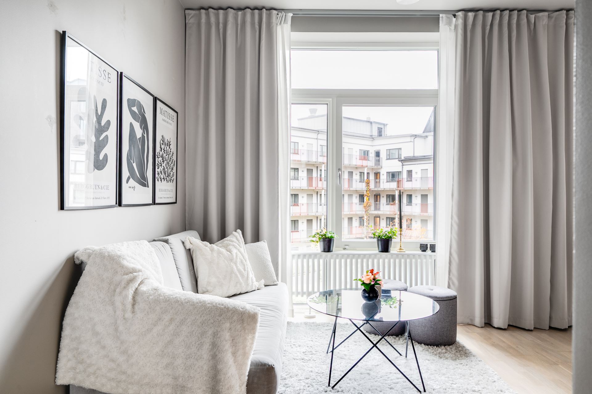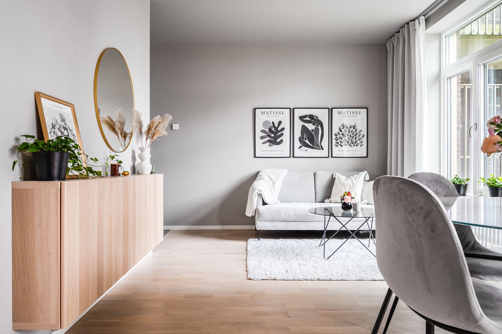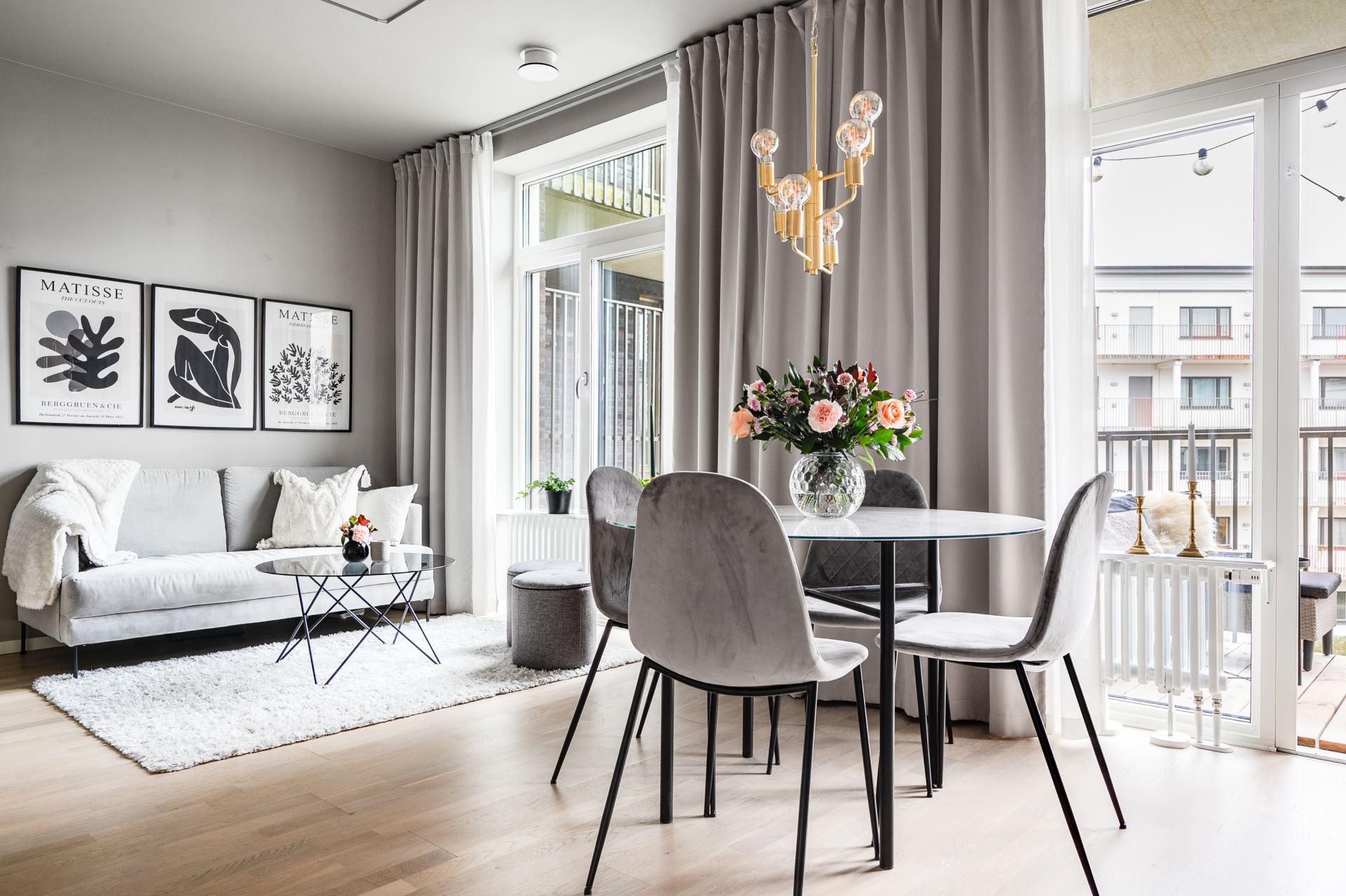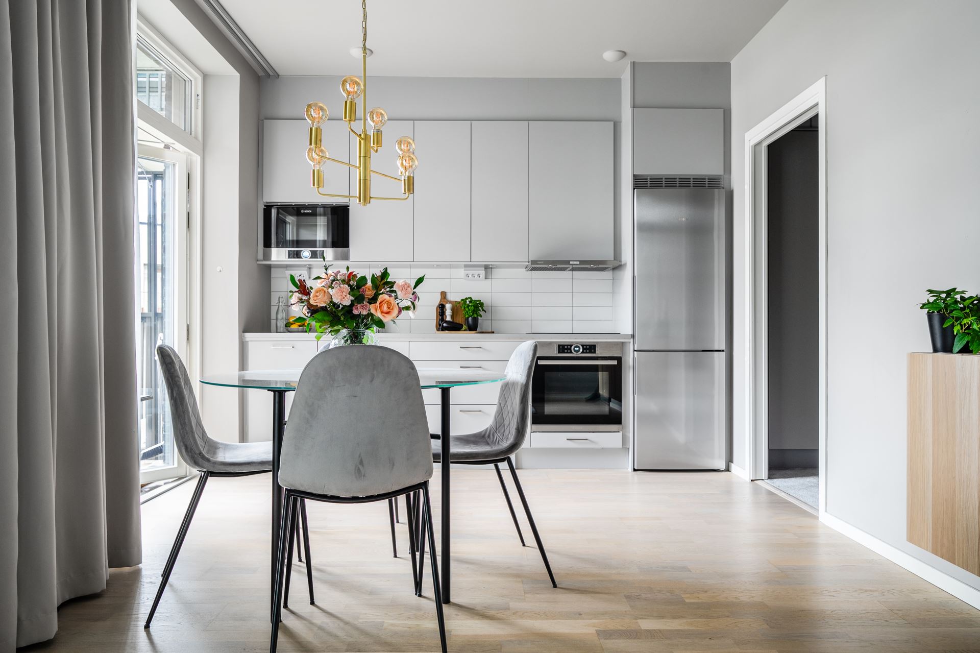 Vidare öppnar lägenheten upp med kök och vardagsrum i öppen planlösning, plats för matbord och soffgrupp. Enastående takhöjd tillsammans med stora fönsterpartier skänker fint ljusinsläpp till hela lägenheten. Här är detaljerna minutiöst utvalda, sobert gråa väggar ackompanjeras med tak i samma enhetliga färg och smakfull vitpigmenterad ekparkett på golv. Härifrån når vi dessutom den sköna balkongen, lugnt belägen mot föreningen gård, i västerläge. Enkel att möblera på bästa vis och perfekt att avnjuta av kommande sommarkvällar på!
