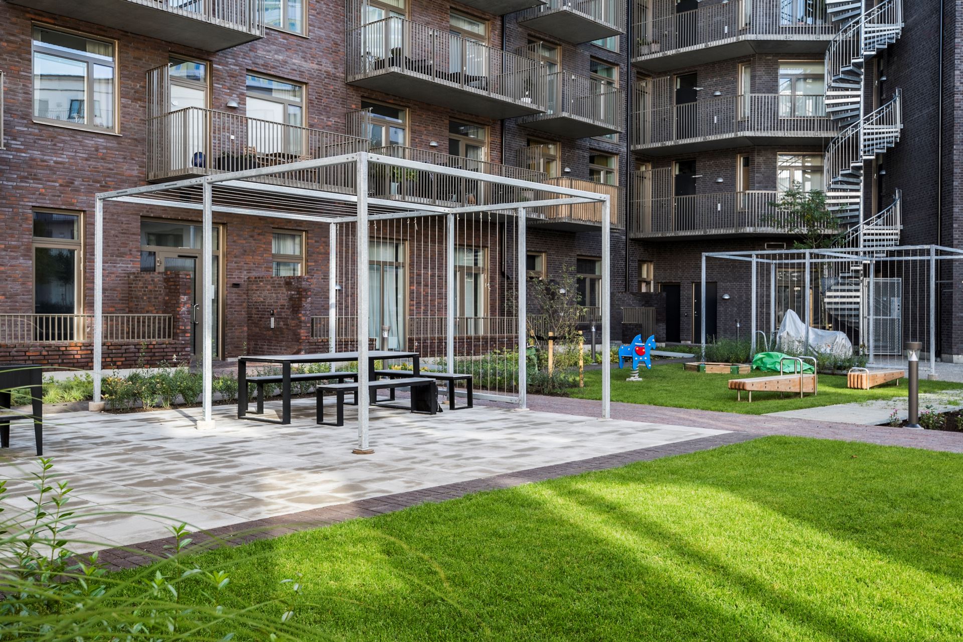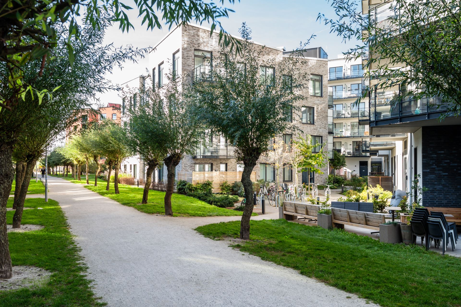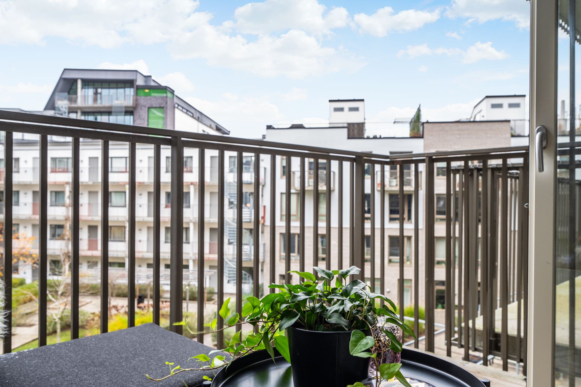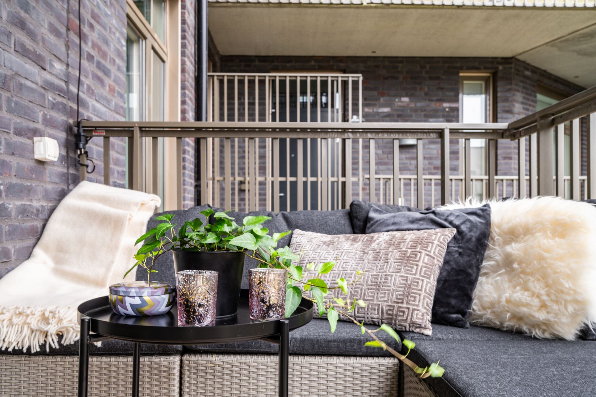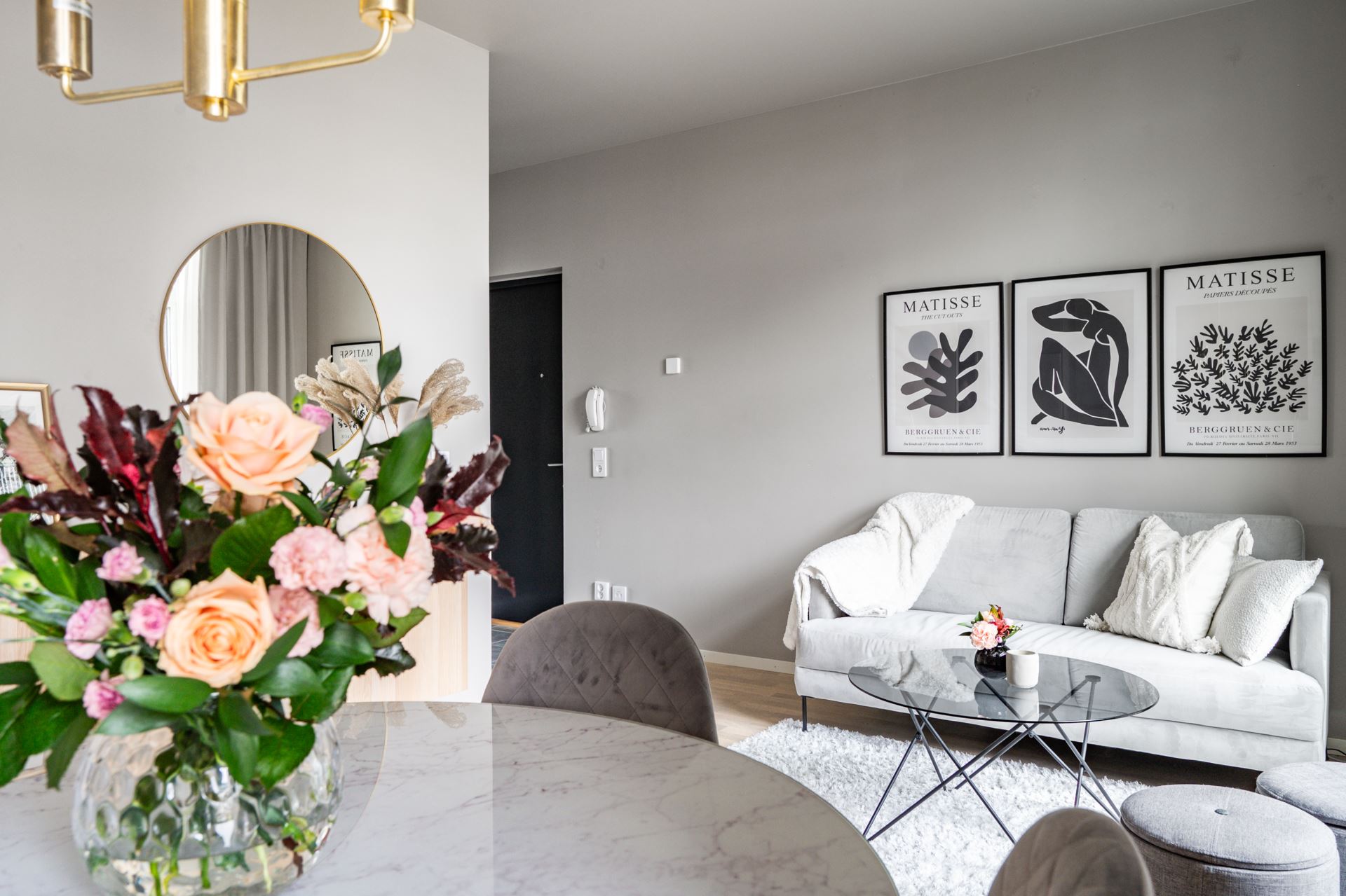 Vidare öppnar lägenheten upp med kök och vardagsrum i öppen planlösning, plats för matbord och soffgrupp. Enastående takhöjd tillsammans med stora fönsterpartier skänker fint ljusinsläpp till hela lägenheten. Här är detaljerna minutiöst utvalda, sobert gråa väggar ackompanjeras med tak i samma enhetliga färg och smakfull vitpigmenterad ekparkett på golv. Härifrån når vi dessutom den sköna balkongen, lugnt belägen mot föreningen gård, i västerläge. Enkel att möblera på bästa vis och perfekt att avnjuta av kommande sommarkvällar på!