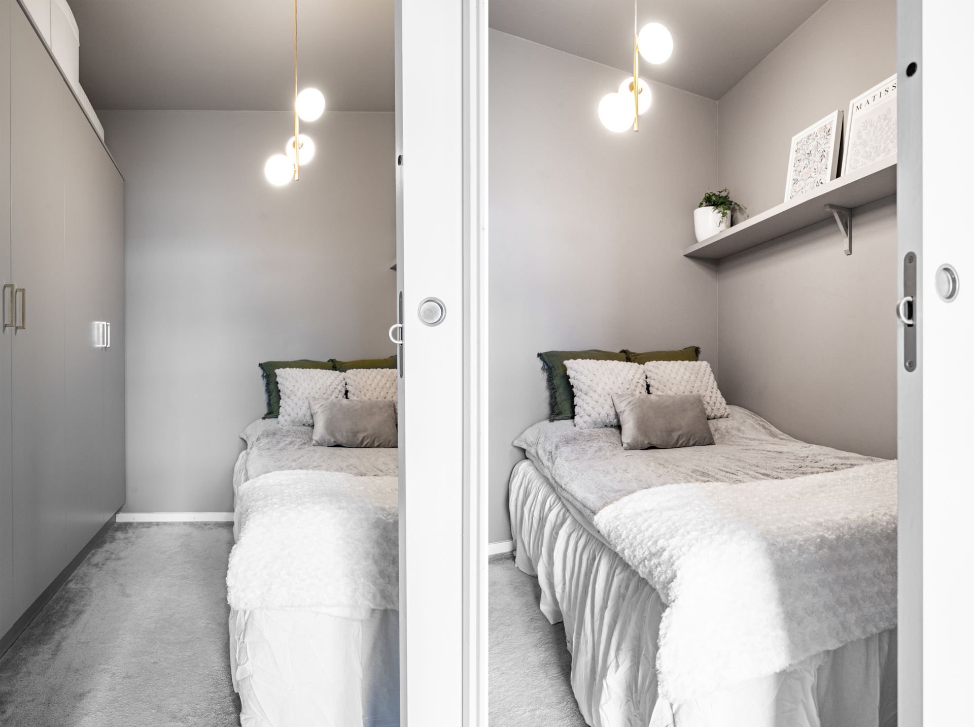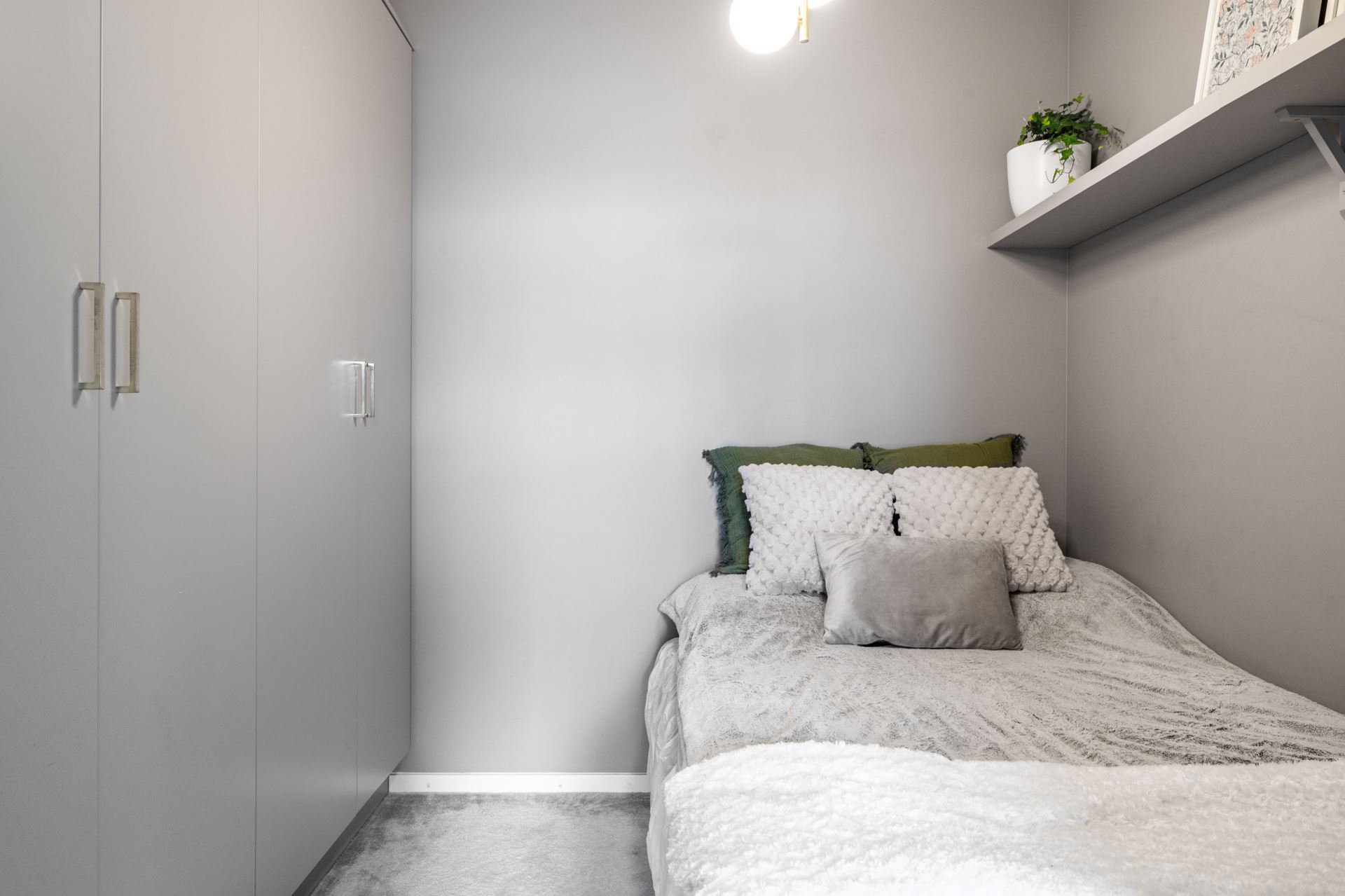 Bakom praktisk skjutdörr finner vi sovdelen som går i grått liksom resterande av lägenheten, samt med trivsam heltäckningsmatta på golv. Här finns plats för säng, sängbord och ytterligare förvaring får vi dessutom bakom de inbyggda garderoberna på vänster sida.