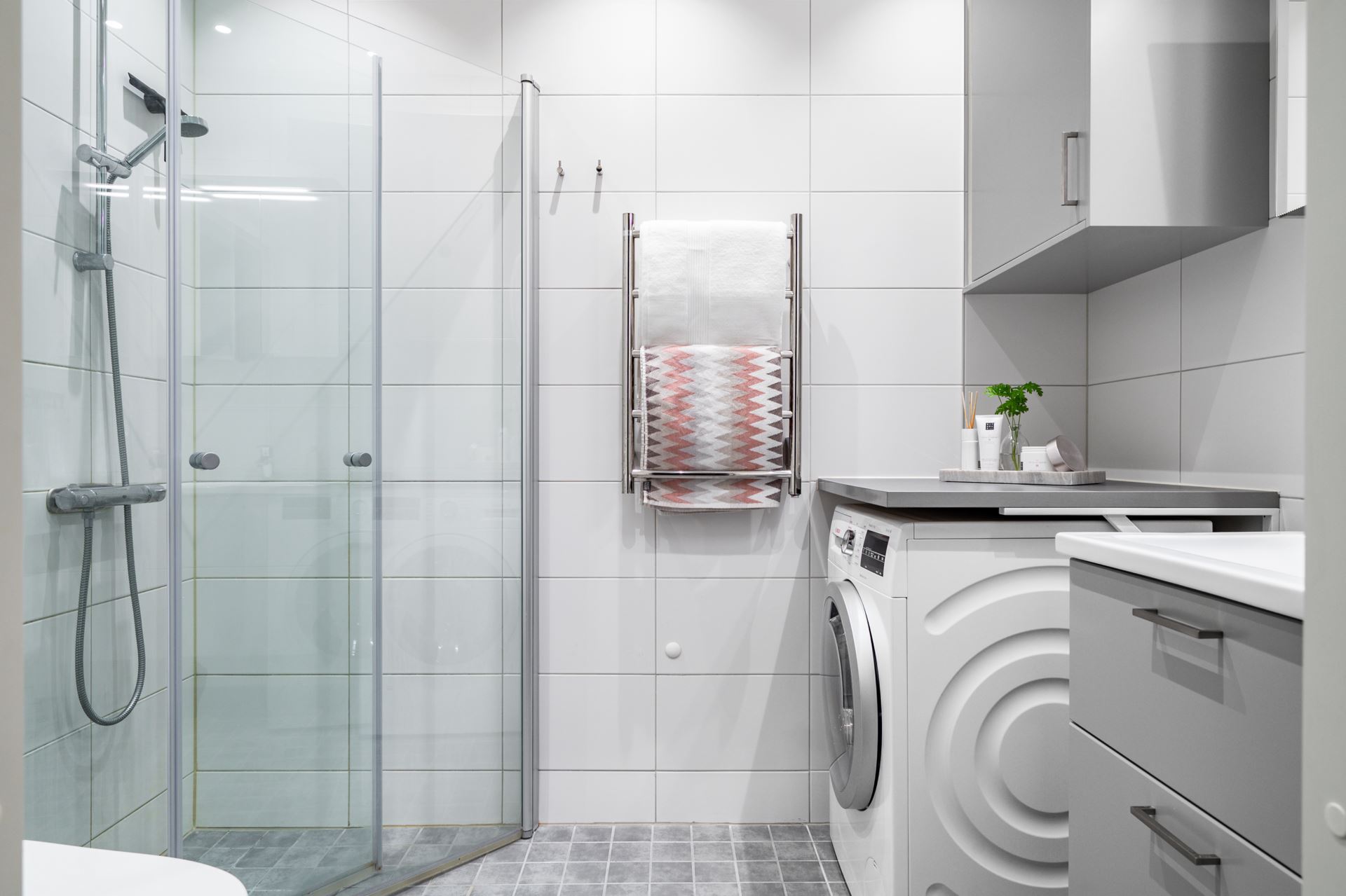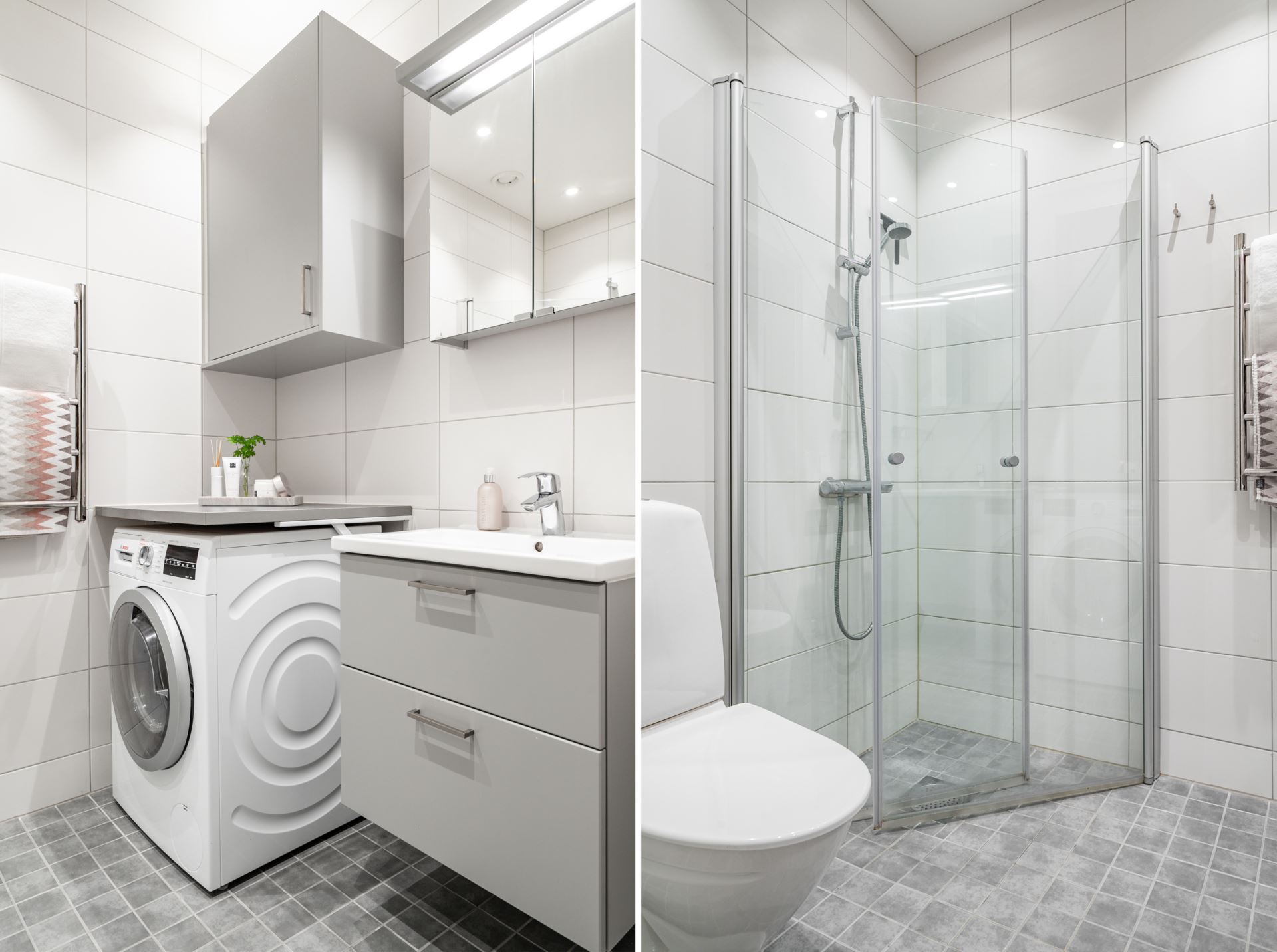 Helkaklad badrumsmiljö som vi når rakt framifrån hallen. Vitt kakel på väggarna tillsammans med gråa klinkers på golv. Badrummet är utrustat med wc, dusch bakom glasvägg, handdukstork, handfat med kommod, spegelskåp, samt kombimaskin för tvätt,- och tork. Bänkskiva ovanför samt ytterligare förvaringsskåp.