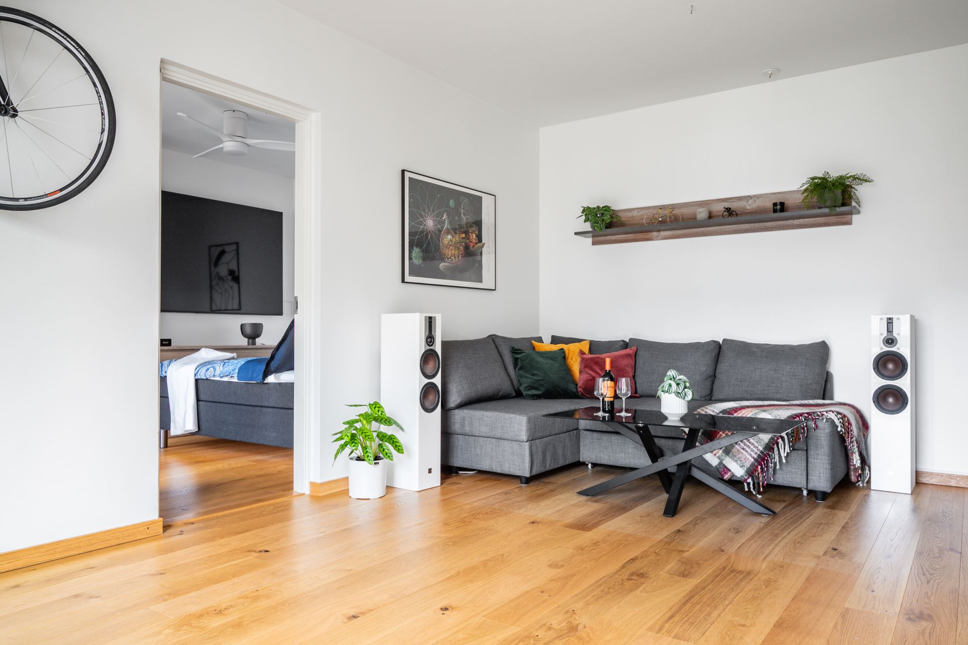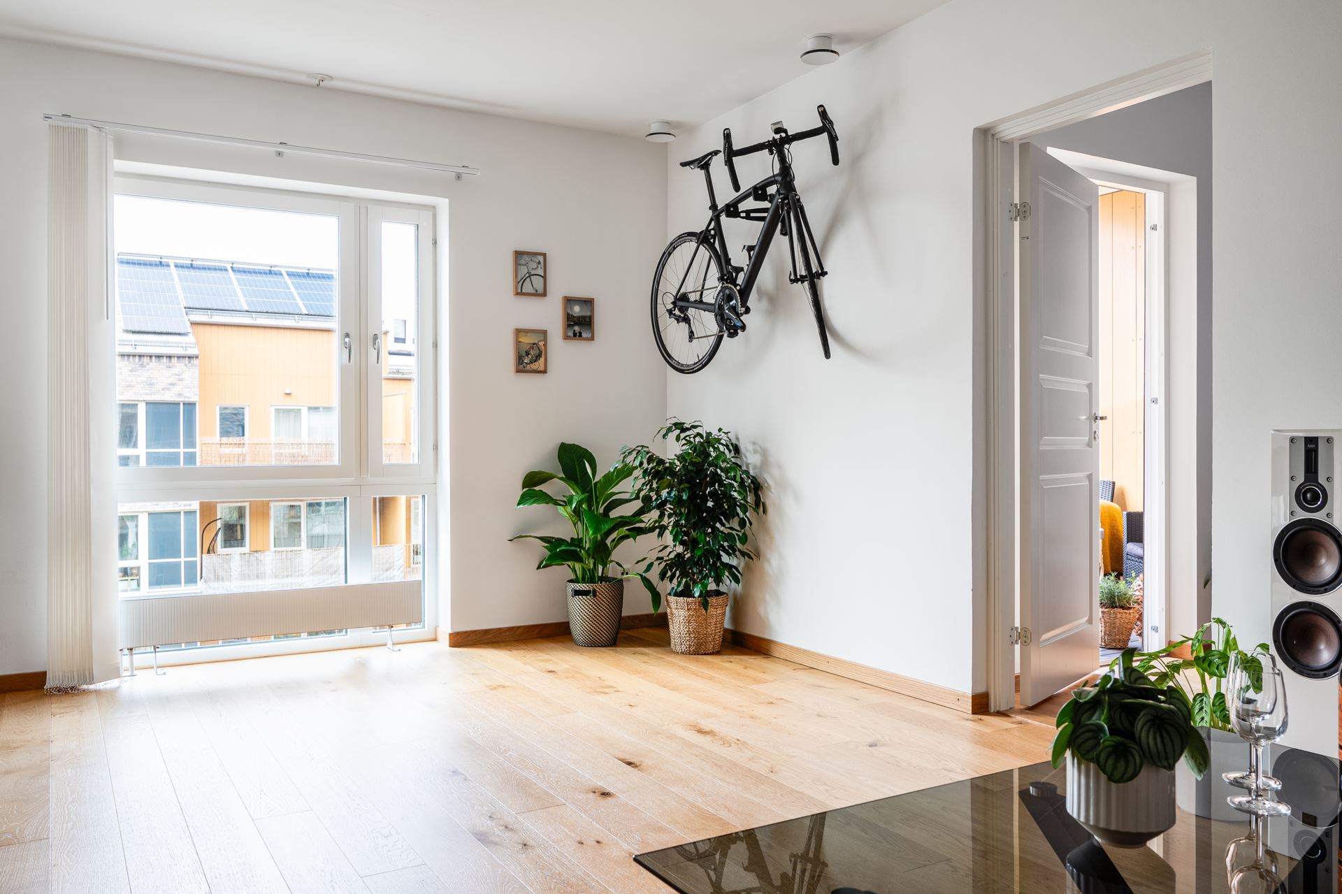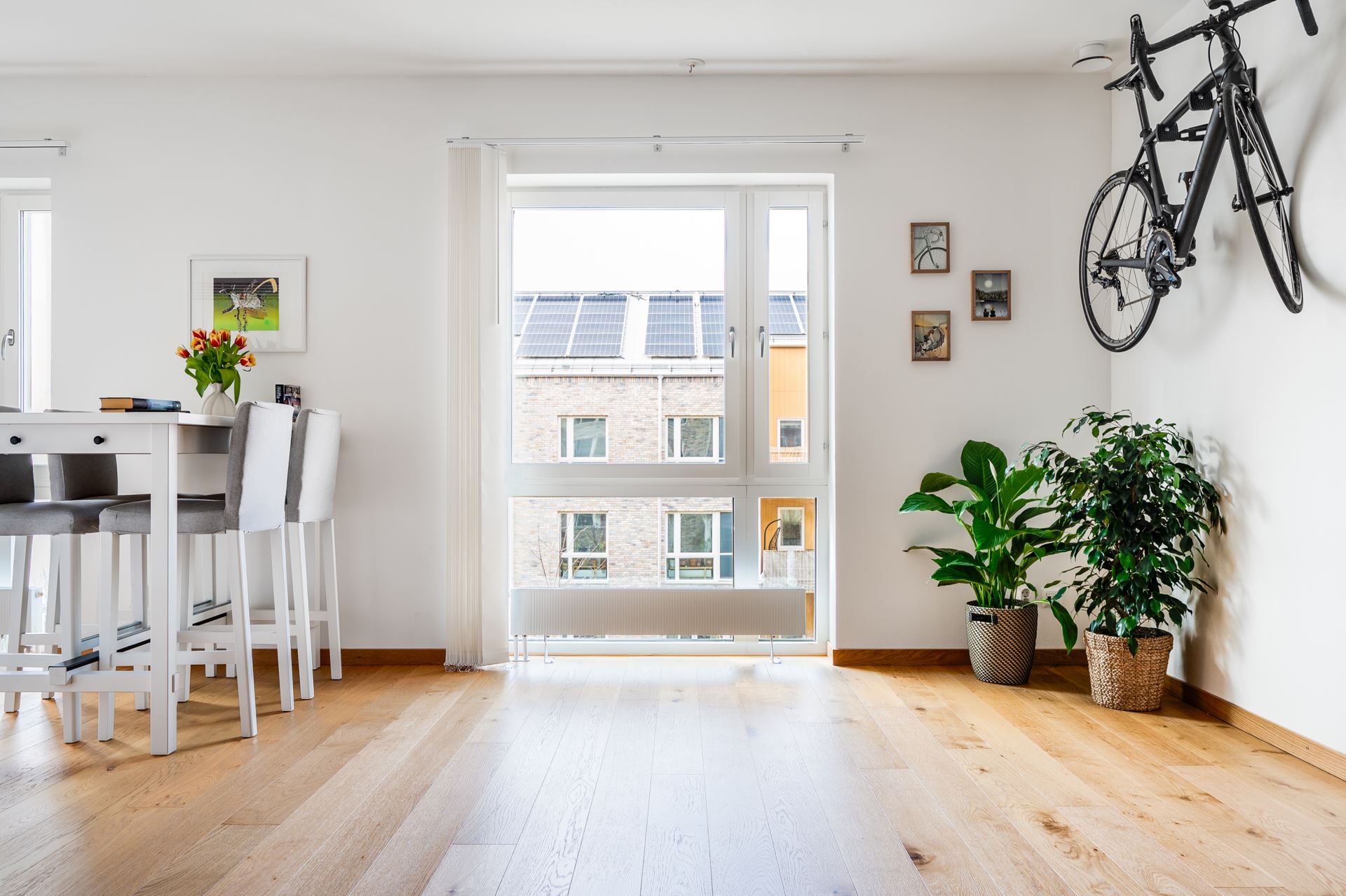Vidare stiger vi in i vardagsrummet, ljust och trevligt tack vare stora fönsterpartier. Utmärkt med plats för att kunna möblera med både soffgrupp och matplats mellan kök och vardagsrum. Släta vita väggar tillsammans med enstavsparkett är genomgående för hela lägenheten.