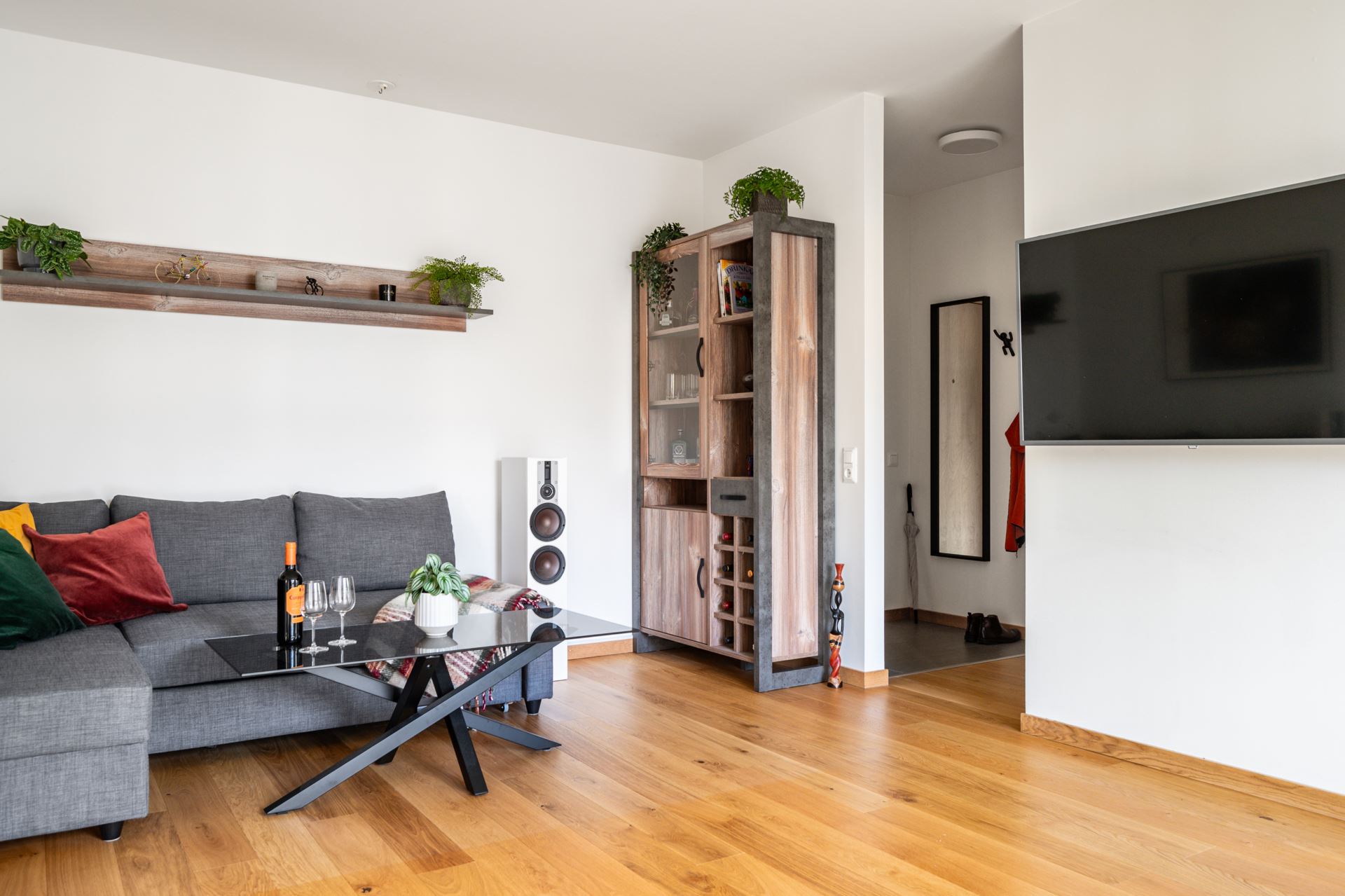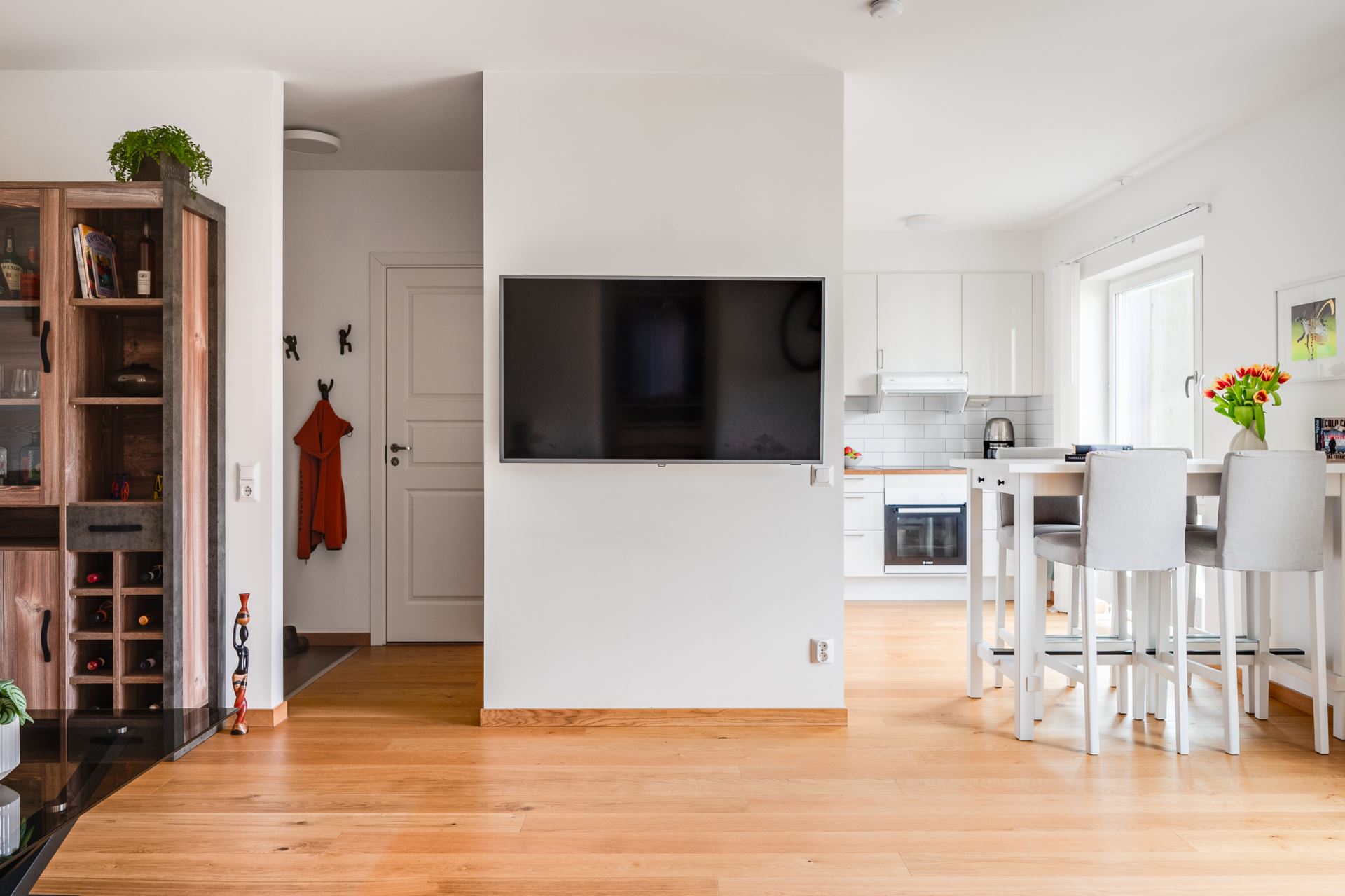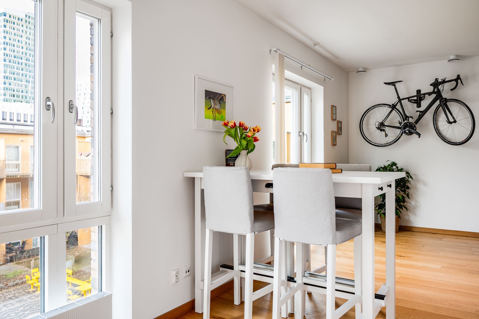 Vidare stiger vi in i vardagsrummet, ljust och trevligt tack vare stora fönsterpartier. Utmärkt med plats för att kunna möblera med både soffgrupp och matplats mellan kök och vardagsrum. Släta vita väggar tillsammans med enstavsparkett är genomgående för hela lägenheten.