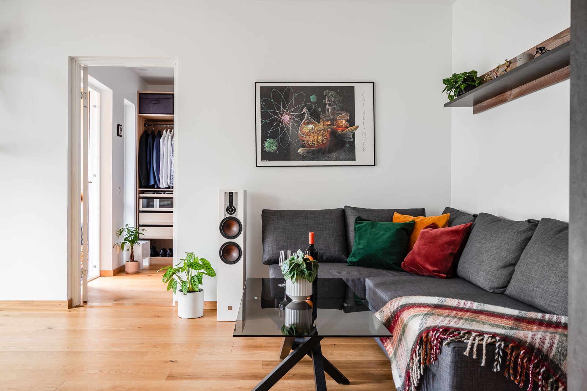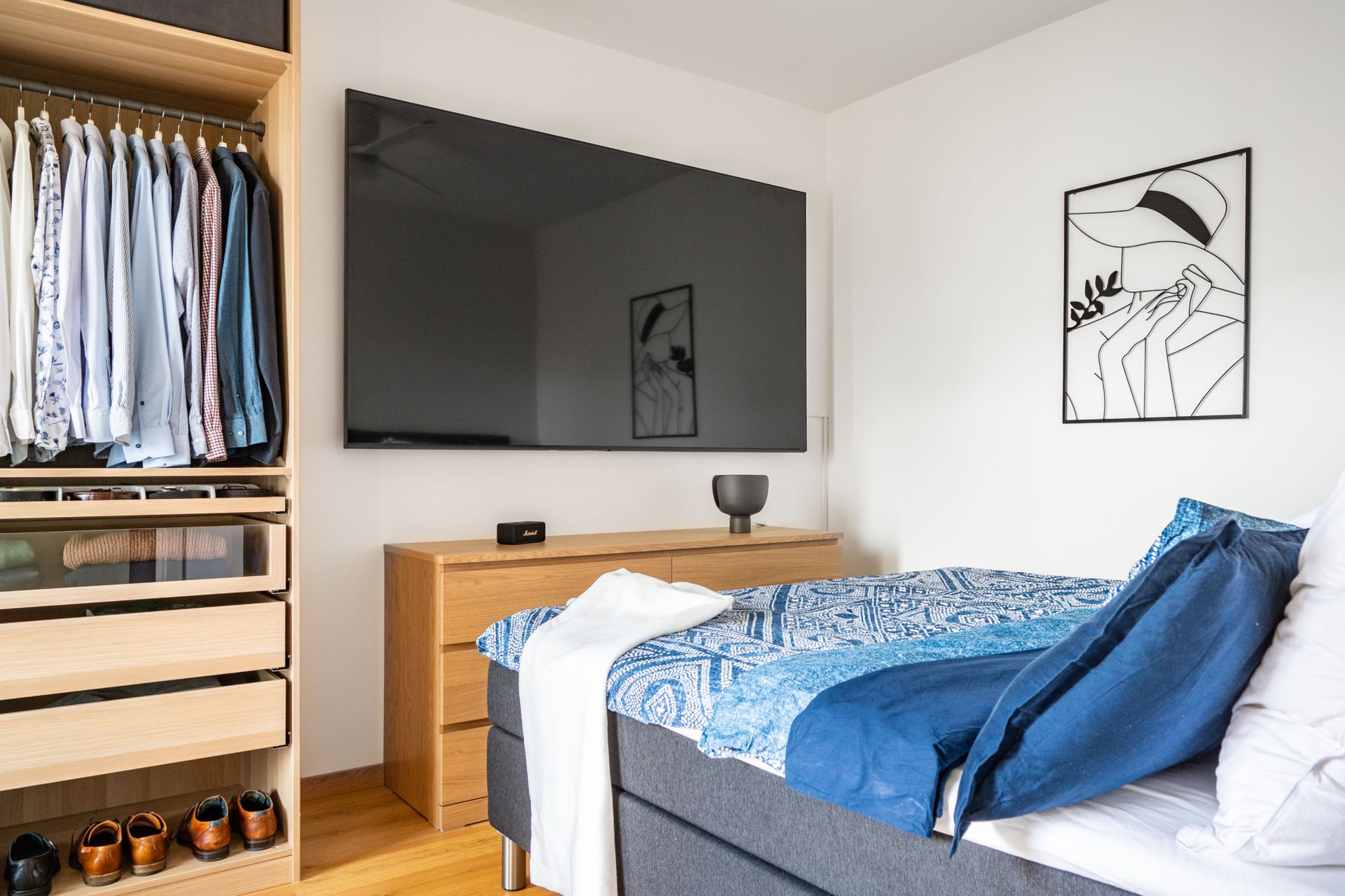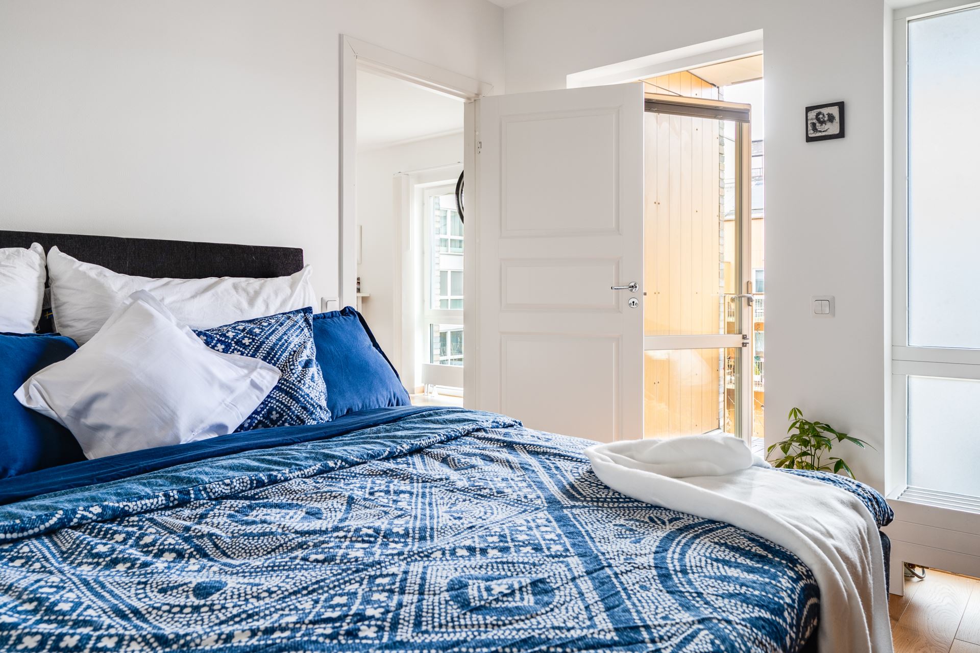 Vägg i vägg med vardagsrummet finner vi sovrummet. Här finns plats för större dubbelsäng, sängbord och ytterligare förvaringsmöbel. Tack vare garderoberna i sovrummet får vi dessutom extra mycket förvaringsutrymme även här. Från sovrummet nås vidare den sköna balkongen, belägen på lugnt läge mot gården och i väster. Enkelt att möblera på bästa vis och ström finns också utdraget till balkongen.