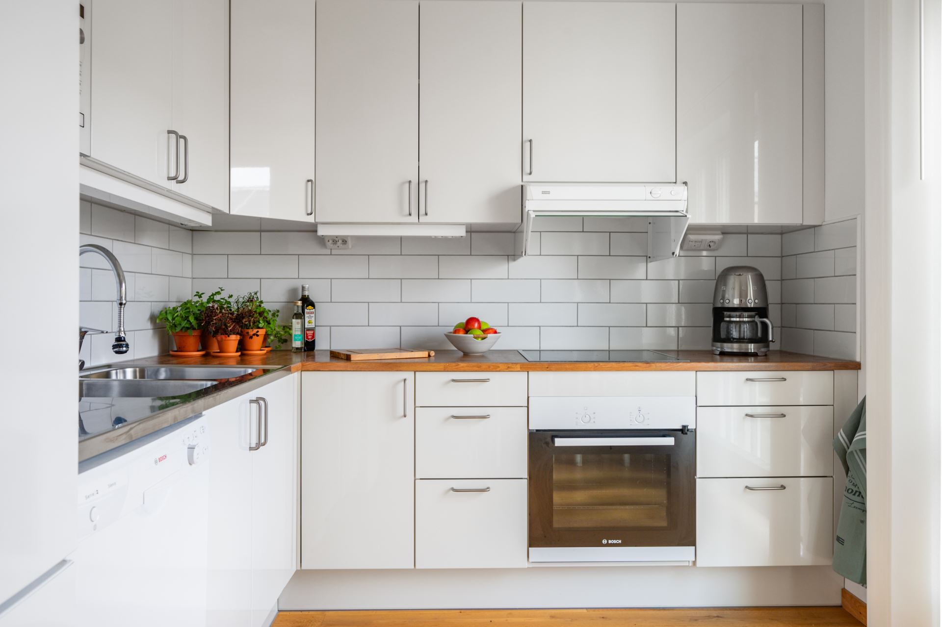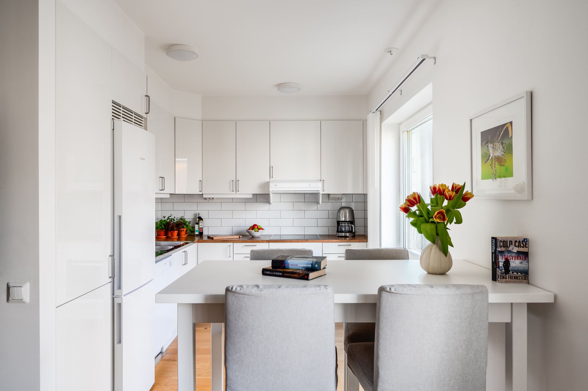 Praktiskt vinkelkök i anslutning till vardagsrummet. Smakfullt vita köksluckor som kombineras med vitt kakel och bänkskivor. Köket är utrustat med kyl och frys (Bosch, 2017), spishäll (Bosch), mikro (Bosch) och fläkt (Franke). Köket bjuder på utmärkta arbetsytor och förvaringsmöjligheter. Städskåp finns dessutom i köket.