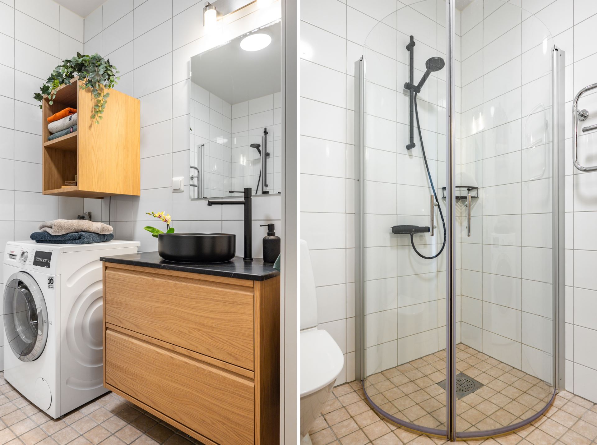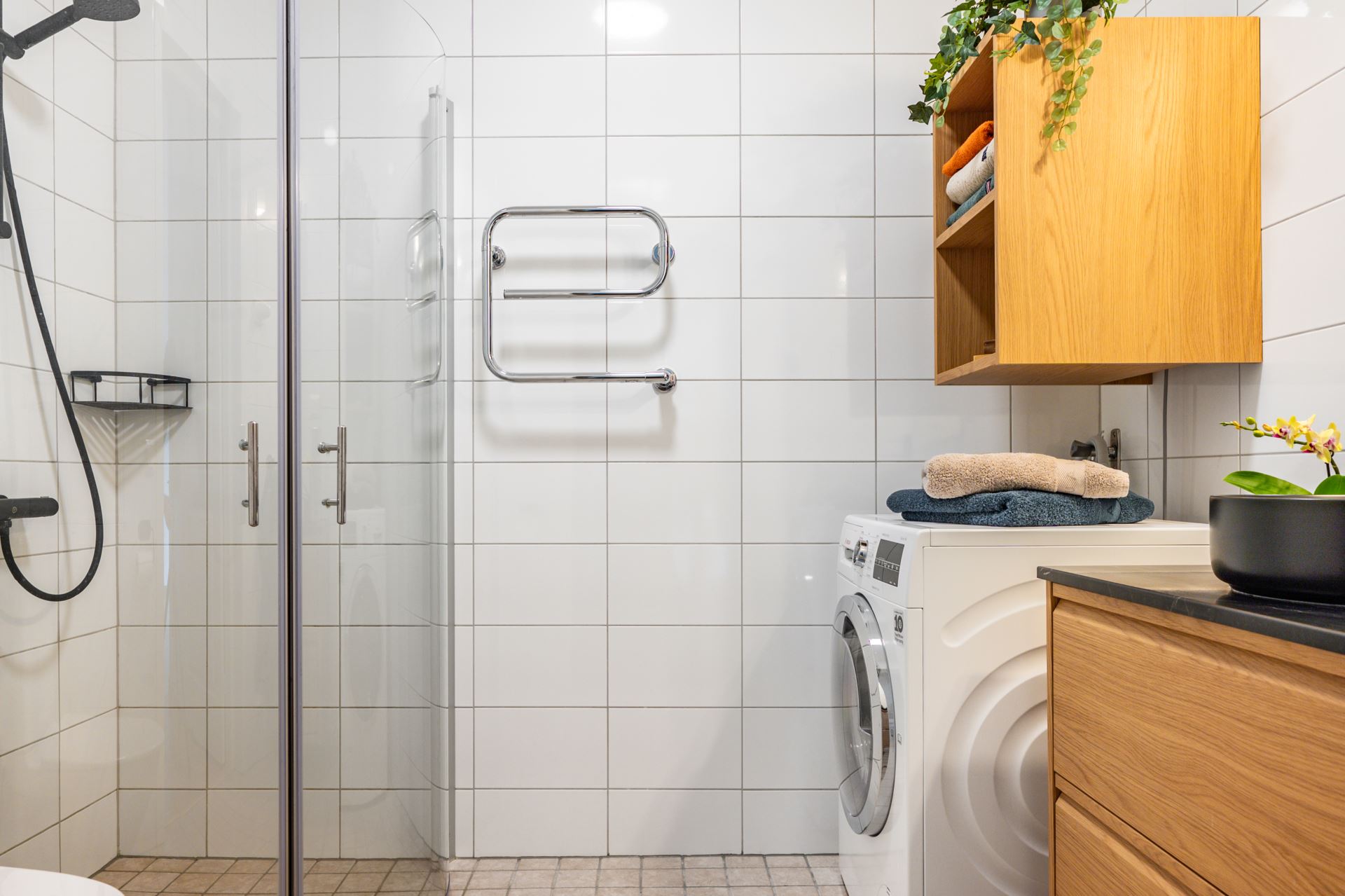 Helkaklat badrum i sobert stilrena materialval och med golvvärme. Vitt kakel på väggar kombineras med klinkers i beige ton på golv. Badrummet är utrustats med dusch bakom glasvägg, handfat med kommod (2024), wc, spegel. Tvätt,- och torkmöjligheter i kombimaskin (Bosch). Ytterligare skåpsförvaring (2024) och arbetsytor ovanför kombimaskinen.