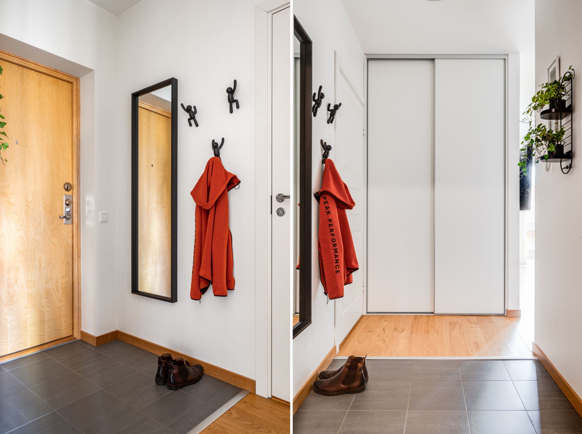 Vi tar hissen till tredje våningen och välkomnas in i trivsam hallmiljö med gråa klinkers på golv, både snyggt och praktiskt. Avhängningsmöjligheter finner vi på vänster sida. Rakt framför oss finns extra förvaringsutrymme bakom skjutdörrsgarderob.