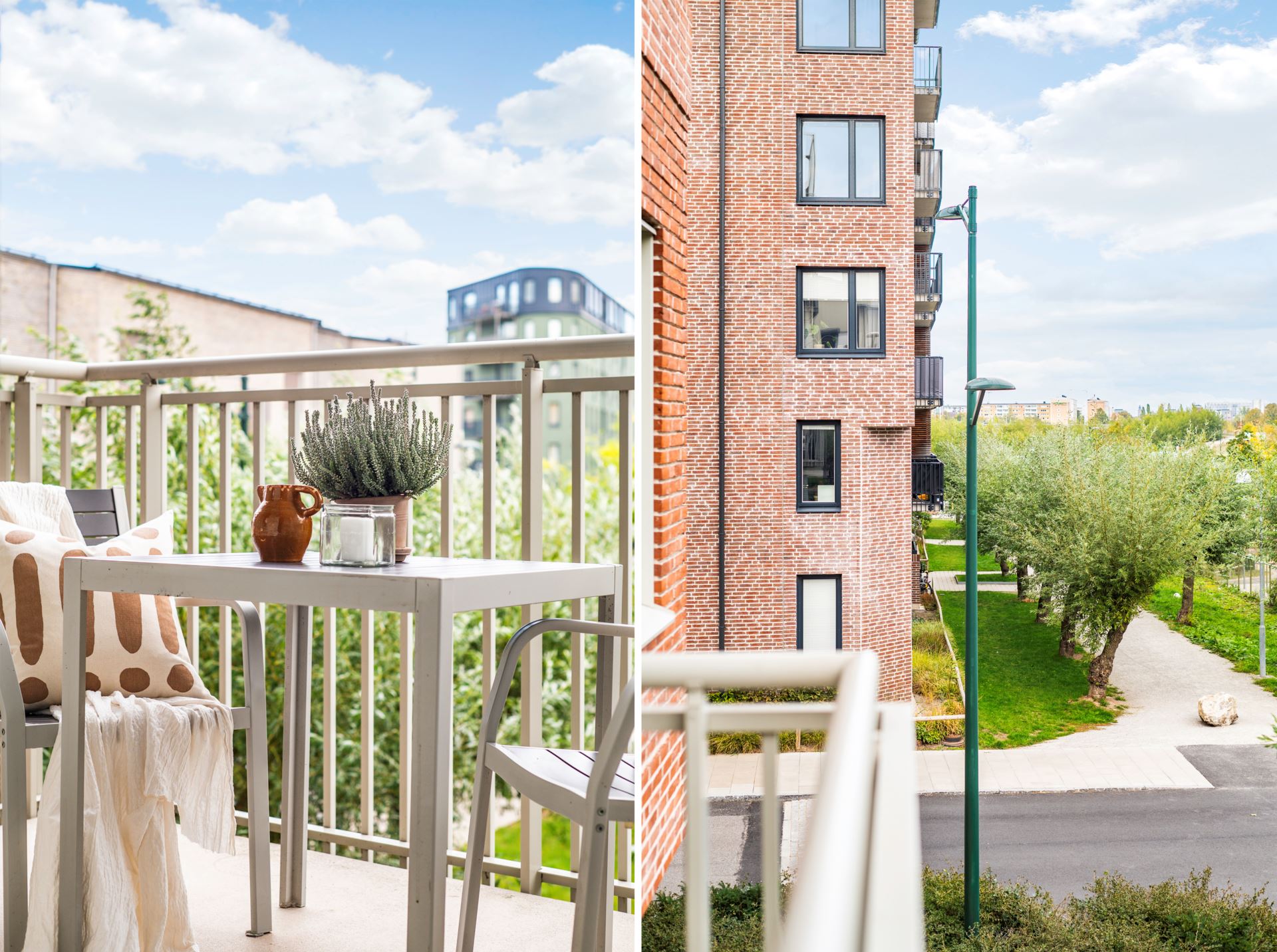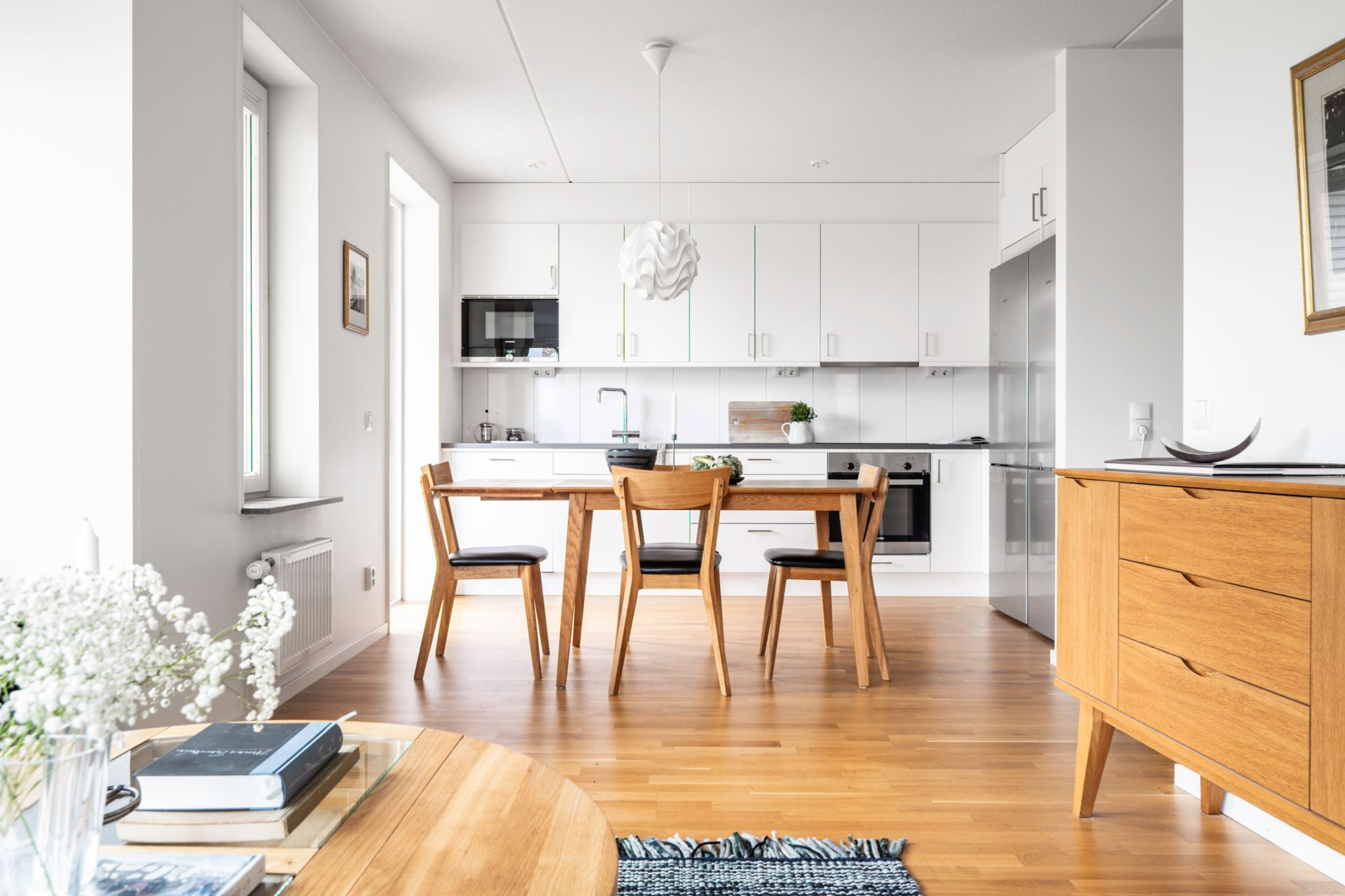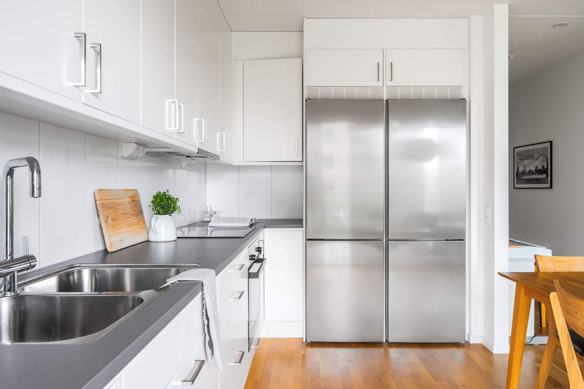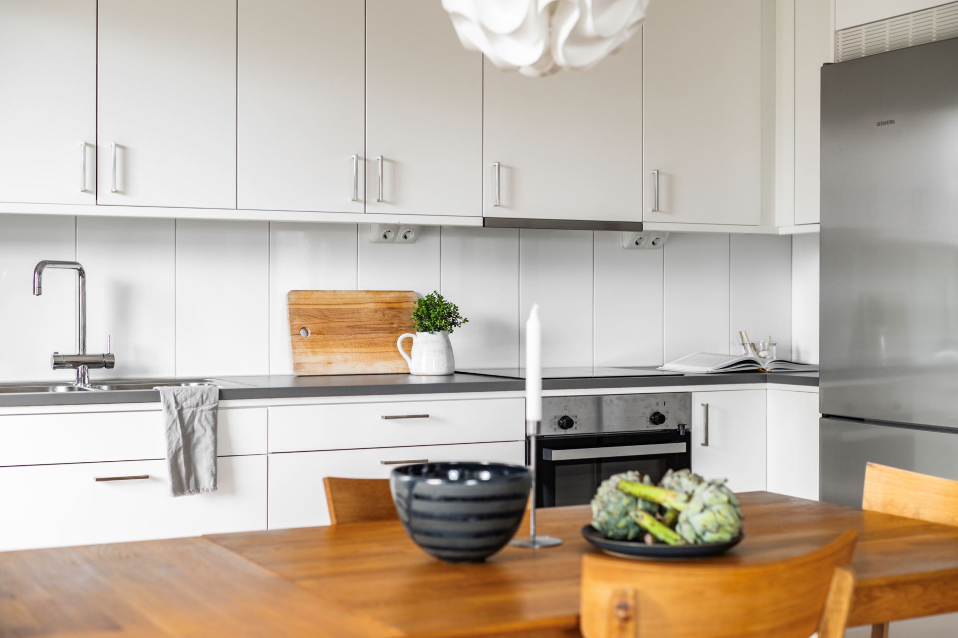 Smakfullt vinkelkök med vita köksluckor (Vedum) samspelar på ypperligt vis med vitt kakel och bänkskiva i laminat. Gott om plats för både arbetsytor och förvaringsmöjligheter bakom skåp och lådor. Köket är utrustat med spishäll, kyl och frys i fullhöjd, diskmaskin och fläkt (Franke). Samtlig utrustning från Siemens. Från köket når vi den sköna balkongen som är rymlig till storleken.