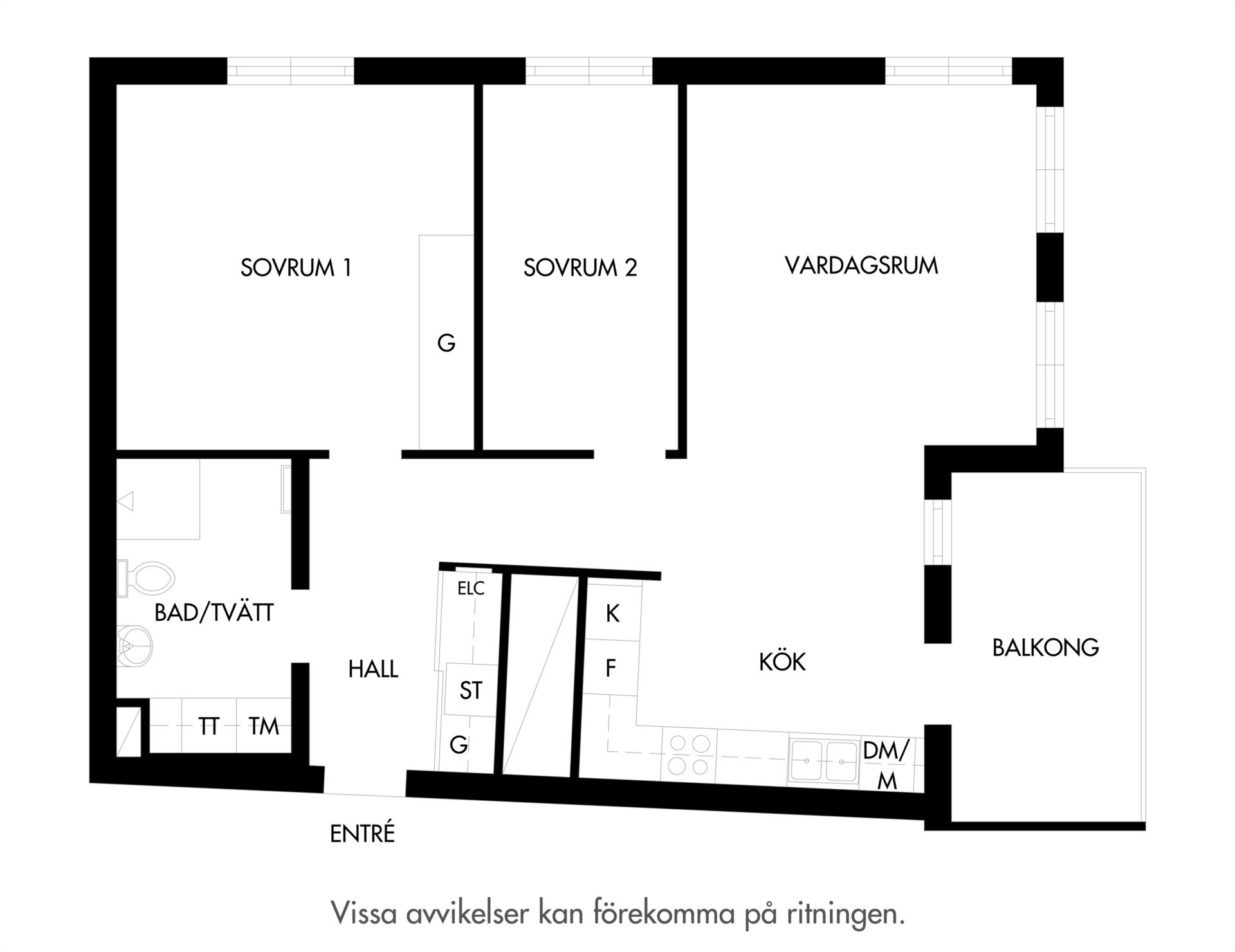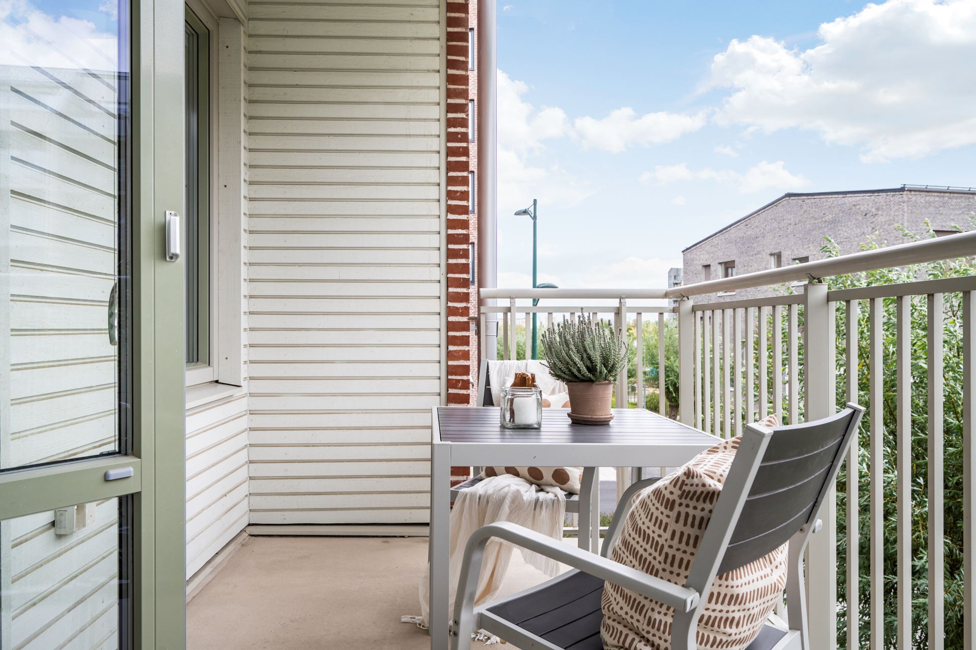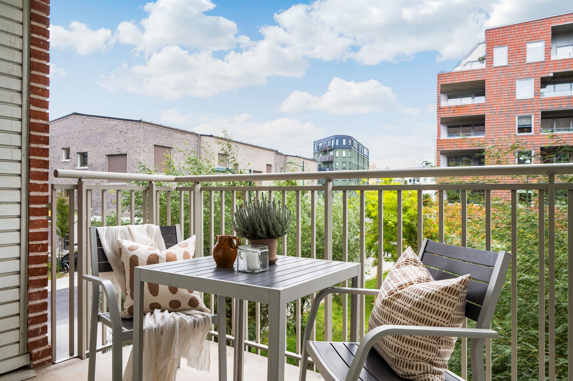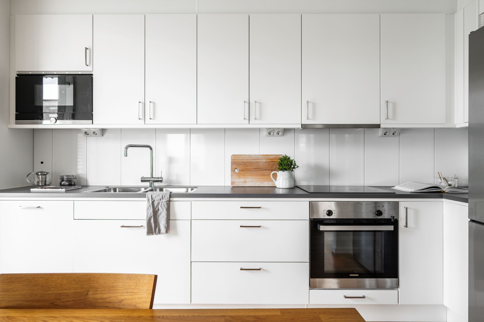Smakfullt vinkelkök med vita köksluckor (Vedum) samspelar på ypperligt vis med vitt kakel och bänkskiva i laminat. Gott om plats för både arbetsytor och förvaringsmöjligheter bakom skåp och lådor. Köket är utrustat med spishäll, kyl och frys i fullhöjd, diskmaskin och fläkt (Franke). Samtlig utrustning från Siemens. Från köket når vi den sköna balkongen som är rymlig till storleken.