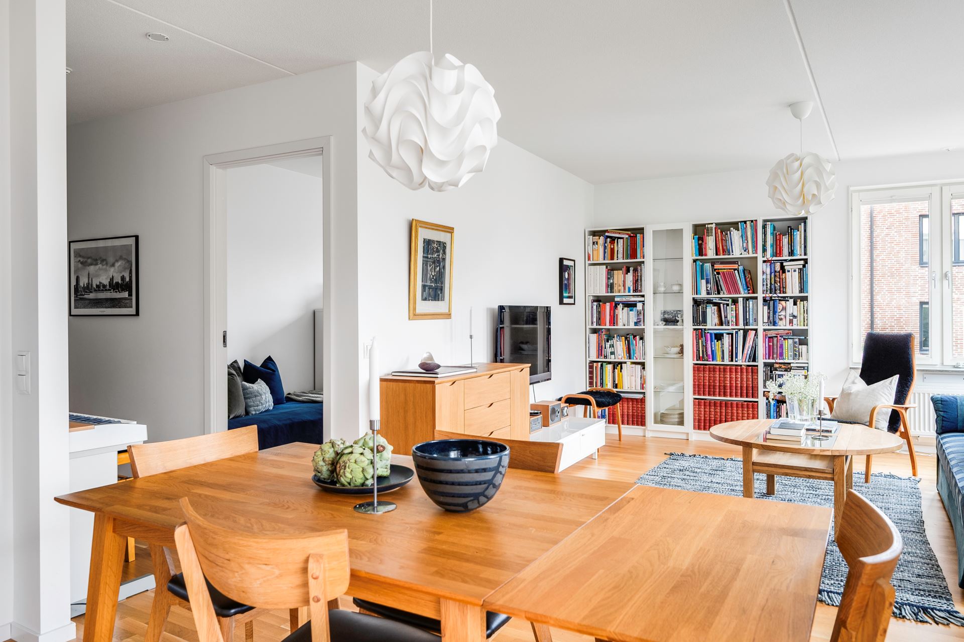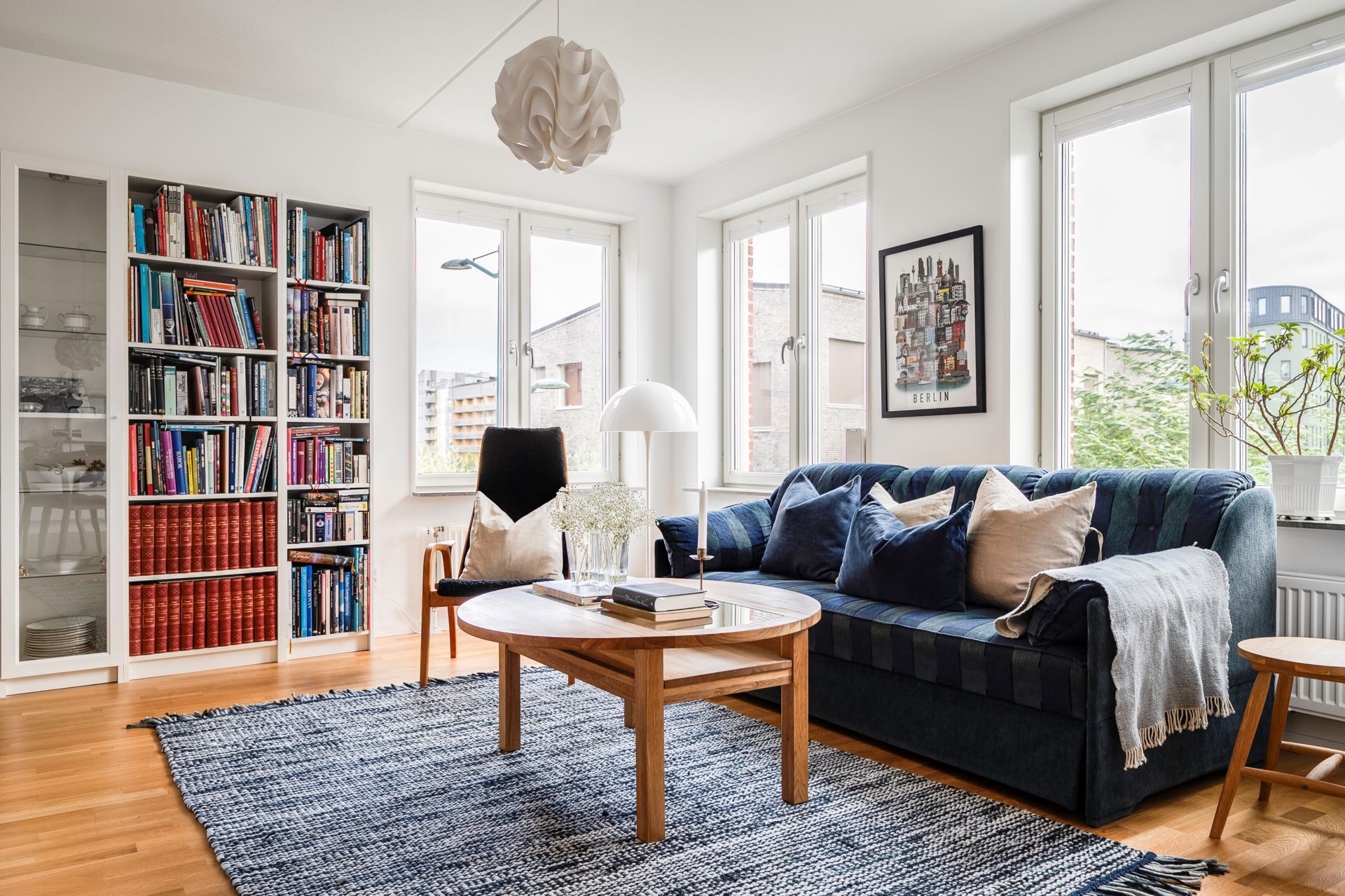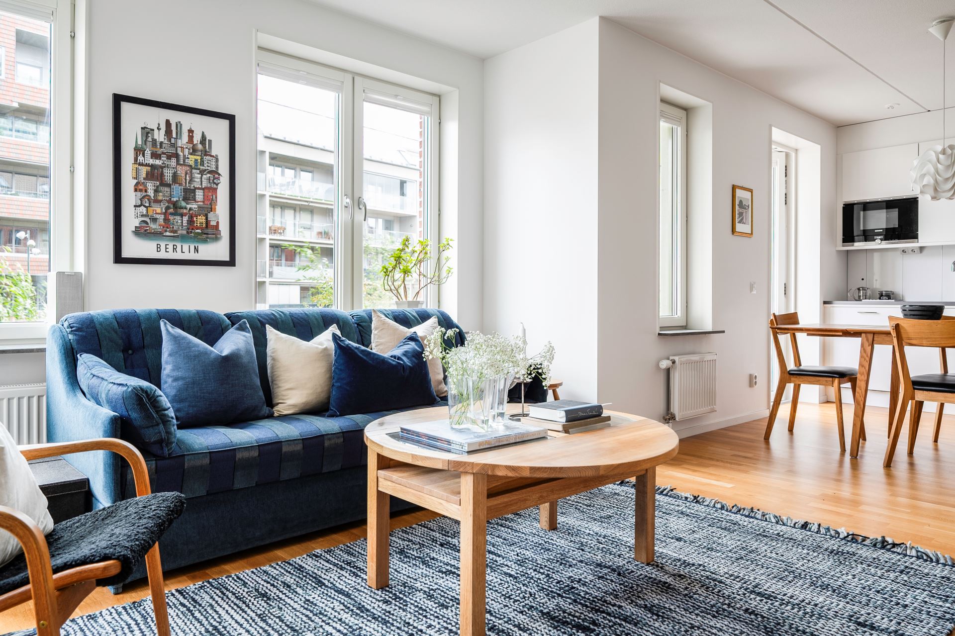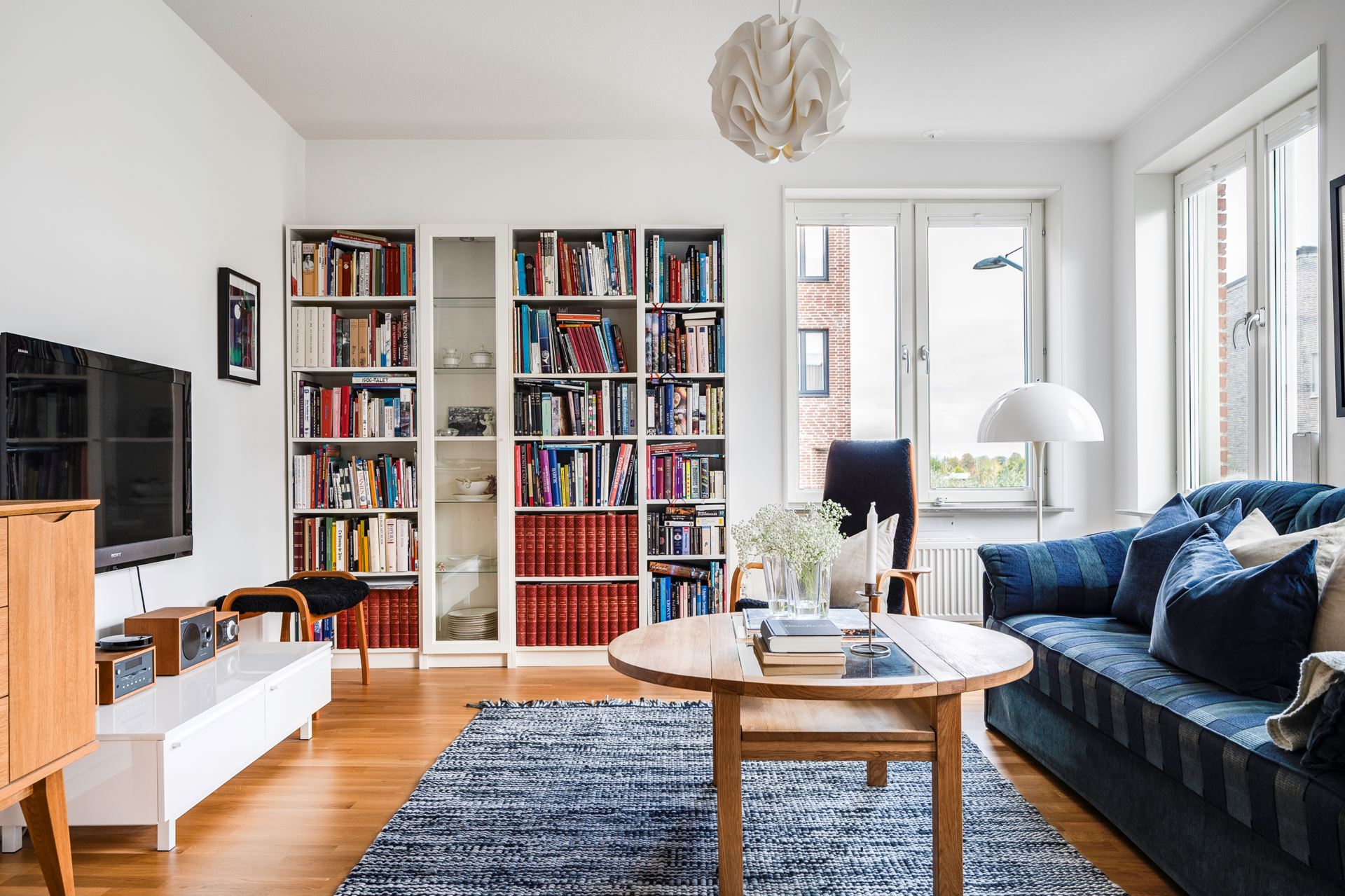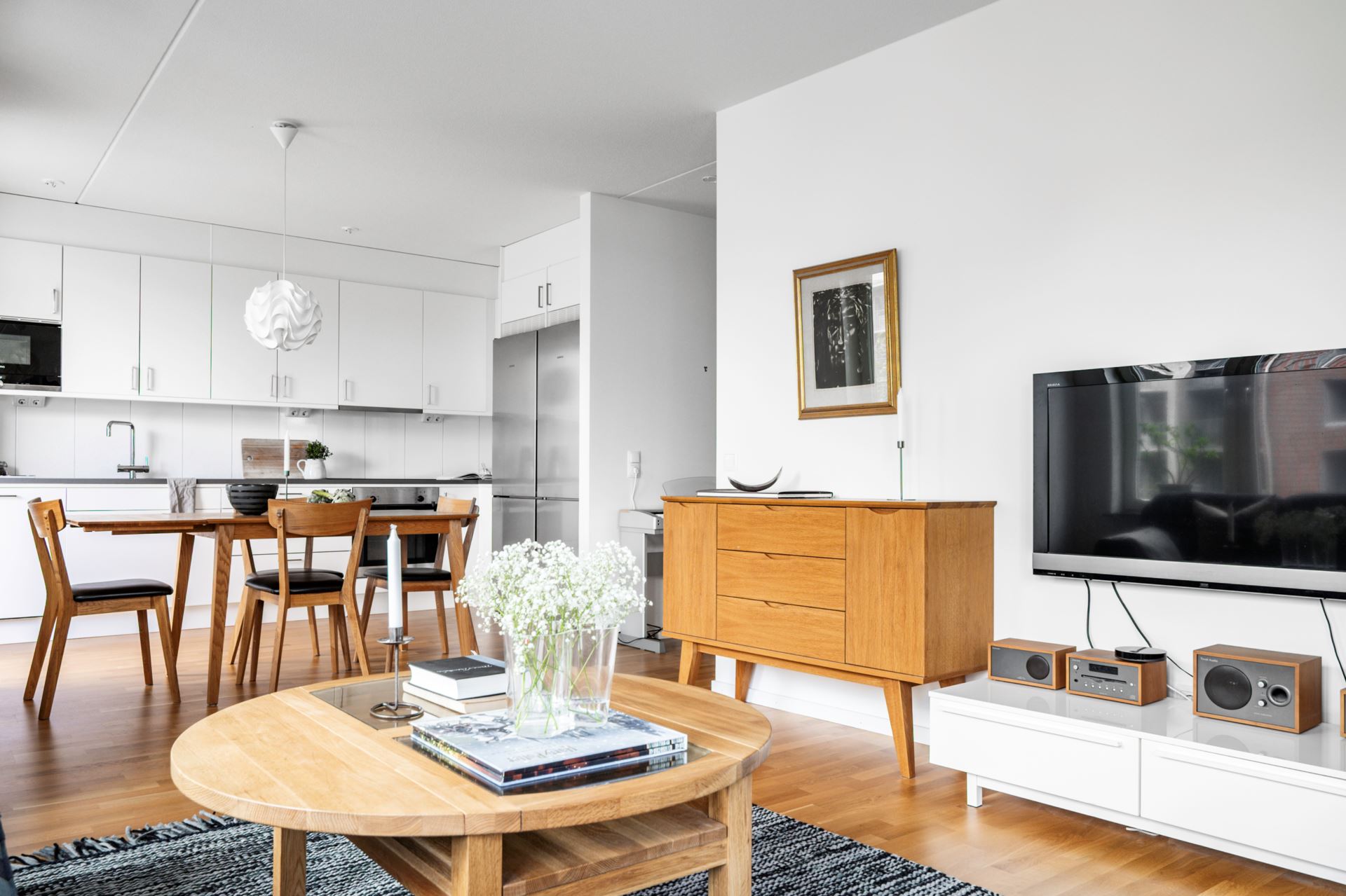 Vardagsrummet bjuder på utmärkta sällskapsytor och underbart ljusflöde tack vare fönster i två väderstreck. Här ryms plats för större soffgrupp samt matbord mot köksdelen.