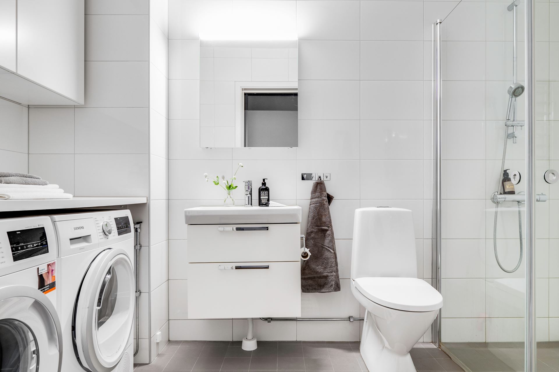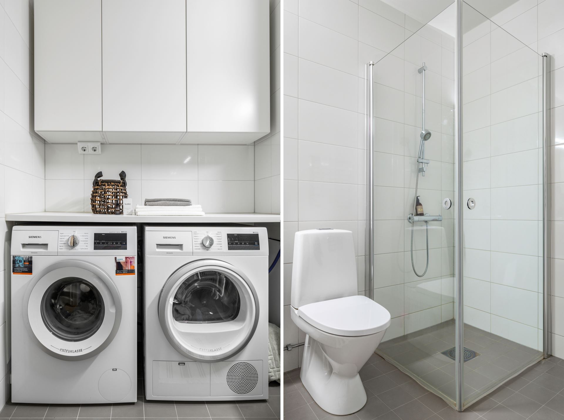 Helkaklat badrum med vitt kakel på väggarna som kombineras med gråa klinkers på golv. Badrummet är utrustat med wc, dusch bakom glasvägg, handfat med kommod. Tvättmaskin och torktumlare (Siemens) med avlastningsyta och förvaring ovan tvätt,- och tork.