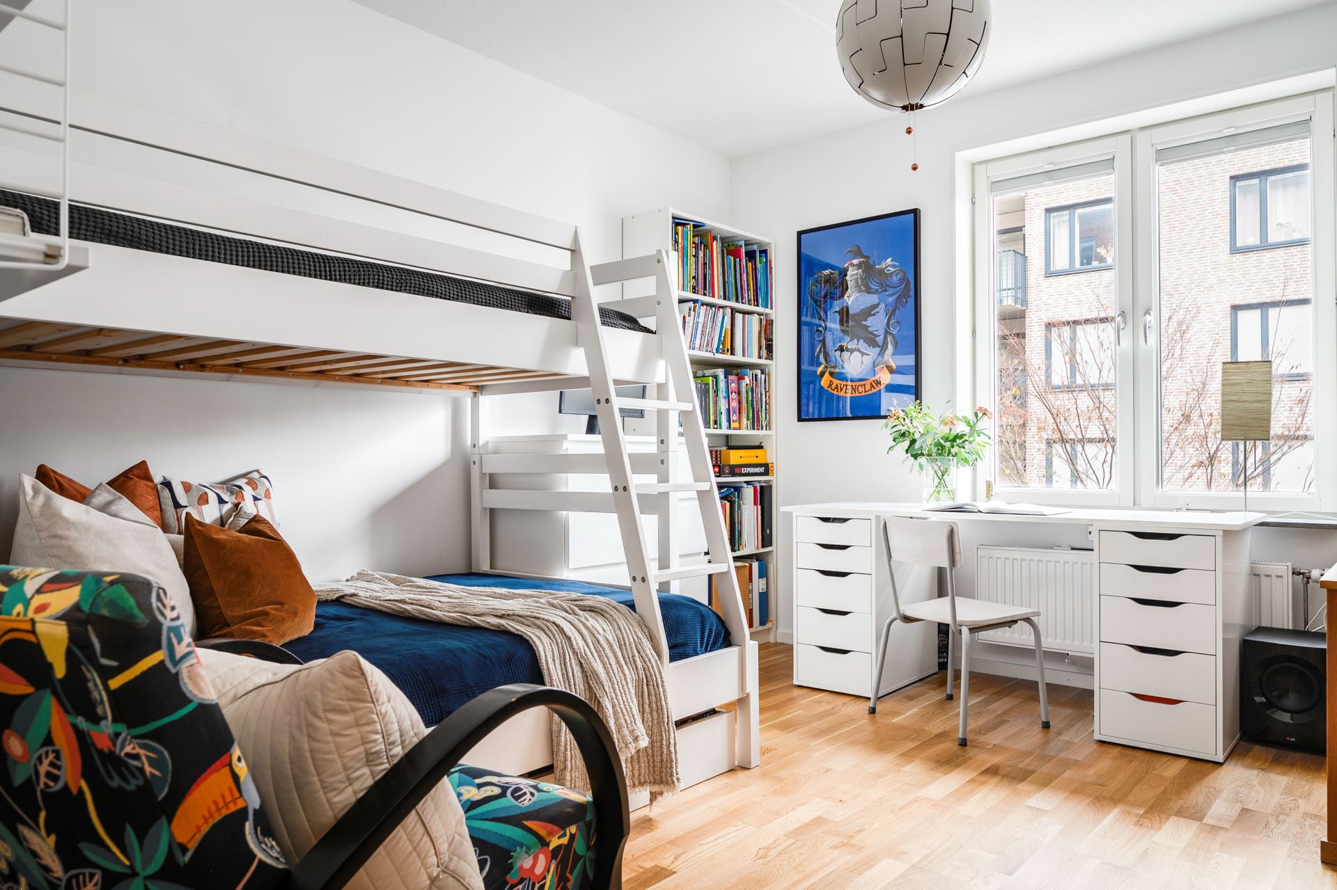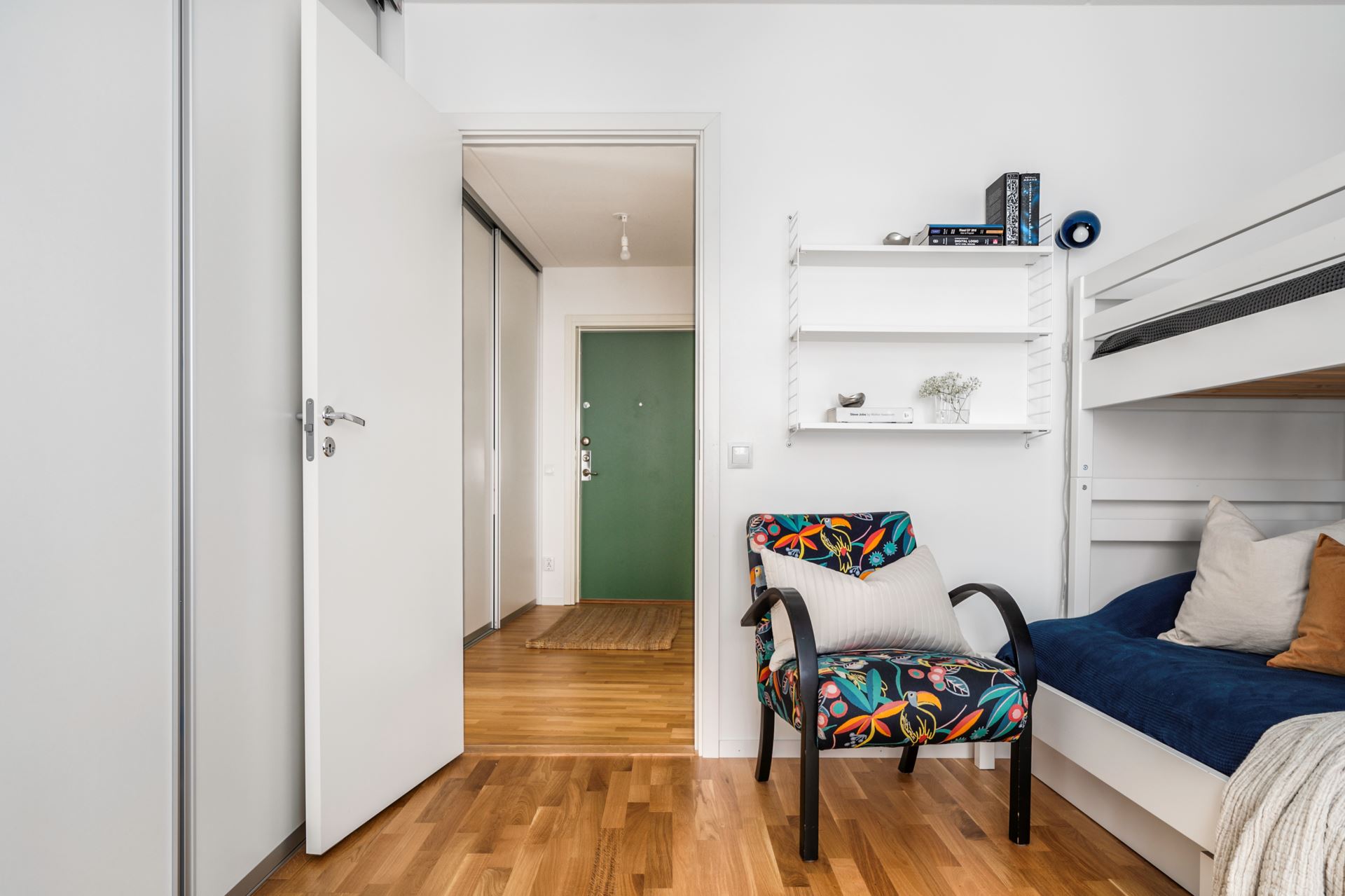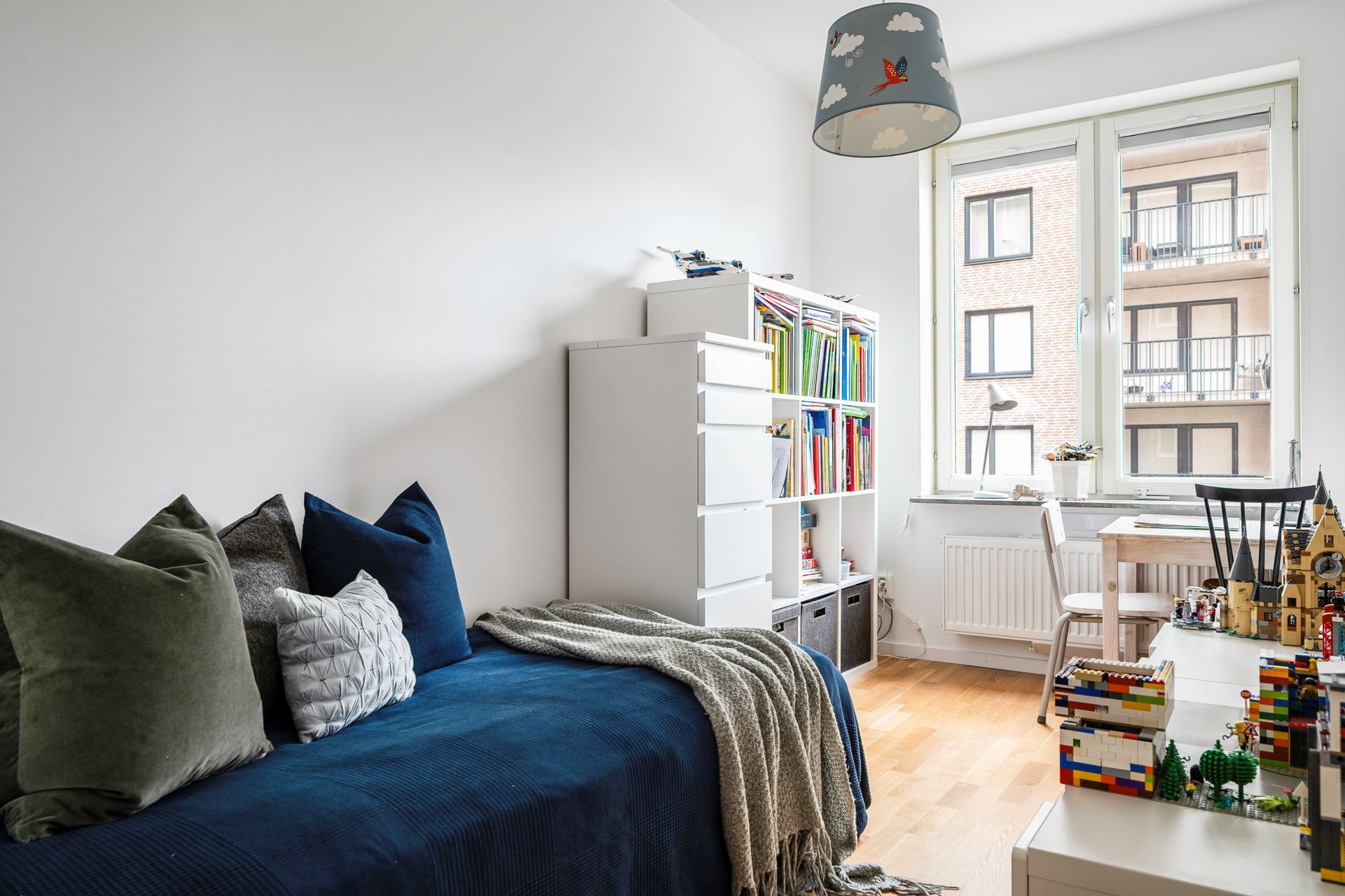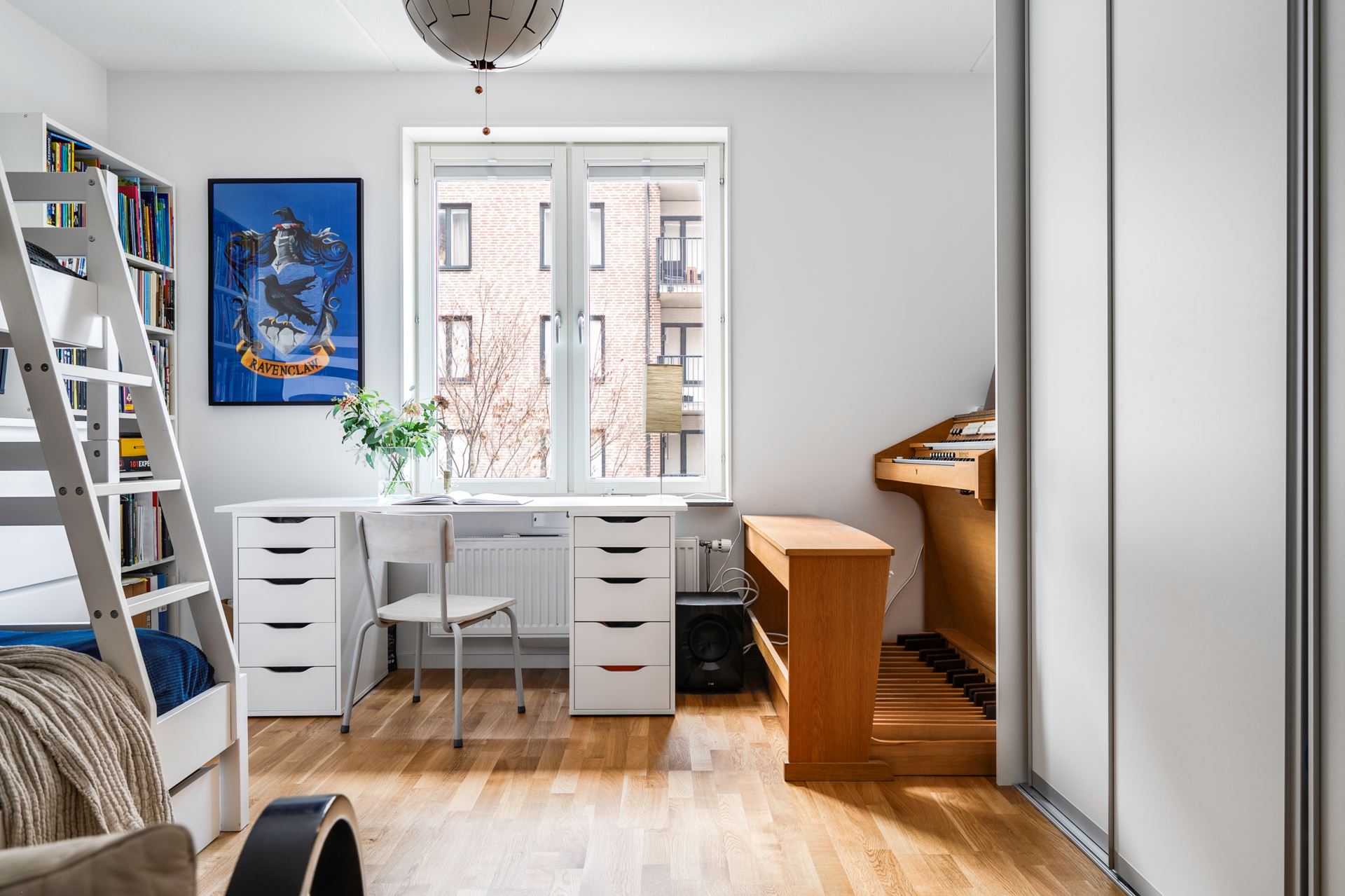 Vägg i vägg når vi det andra sovrummet som bjuder på välplanerade kvadratmeter. Perfekt som barnrum, gästrum eller varför inte kontor. Ekparkett på golv tillsammans med släta vita väggar liksom resterande av lägenheten.