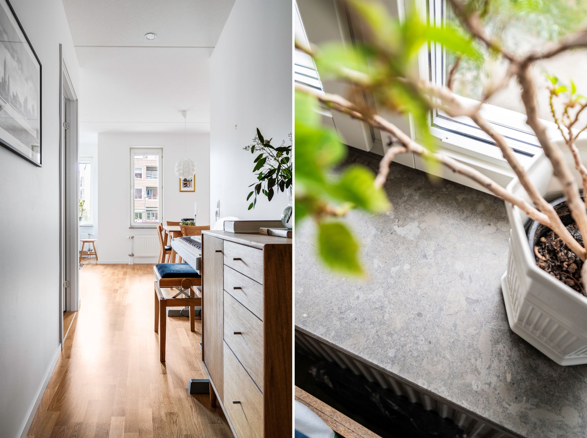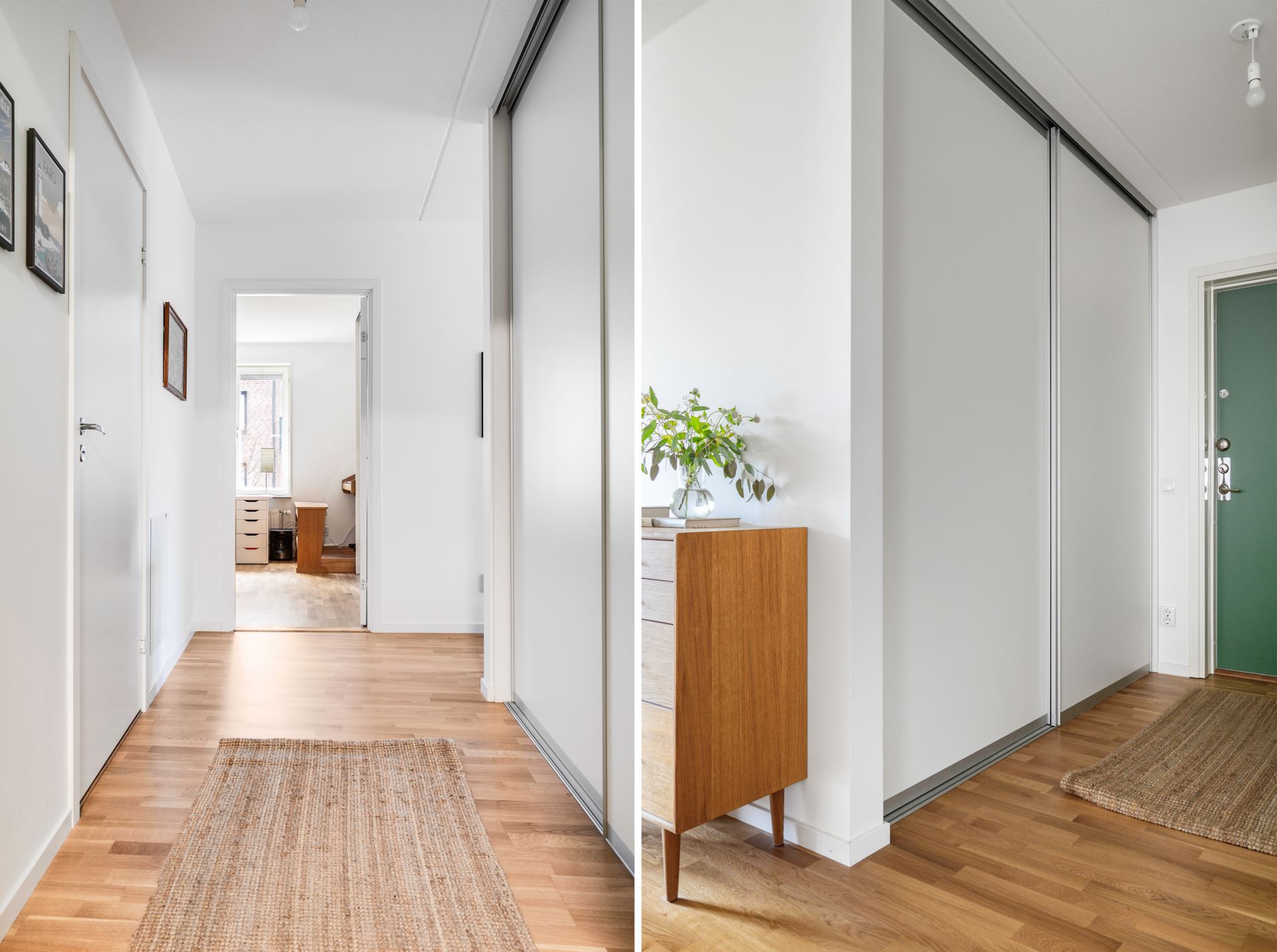 Vi tar hissen upp till andra våningen där vi välkomnas in i trivsam hallmiljö utmärkta förvaringsmöjligheter bakom skjutdörrsgarderob på höger sida. Smakfull ekparkett på golv kombineras med släta vita väggar, vilket är genomgående för hela lägenheten.