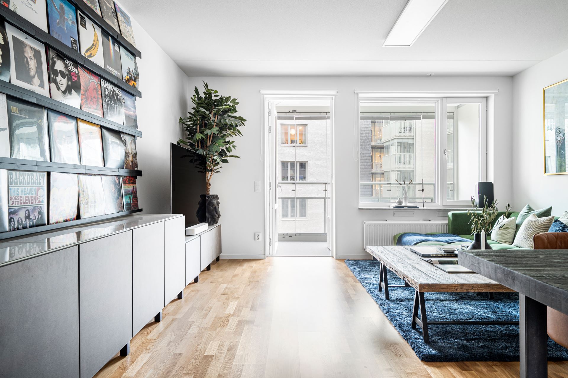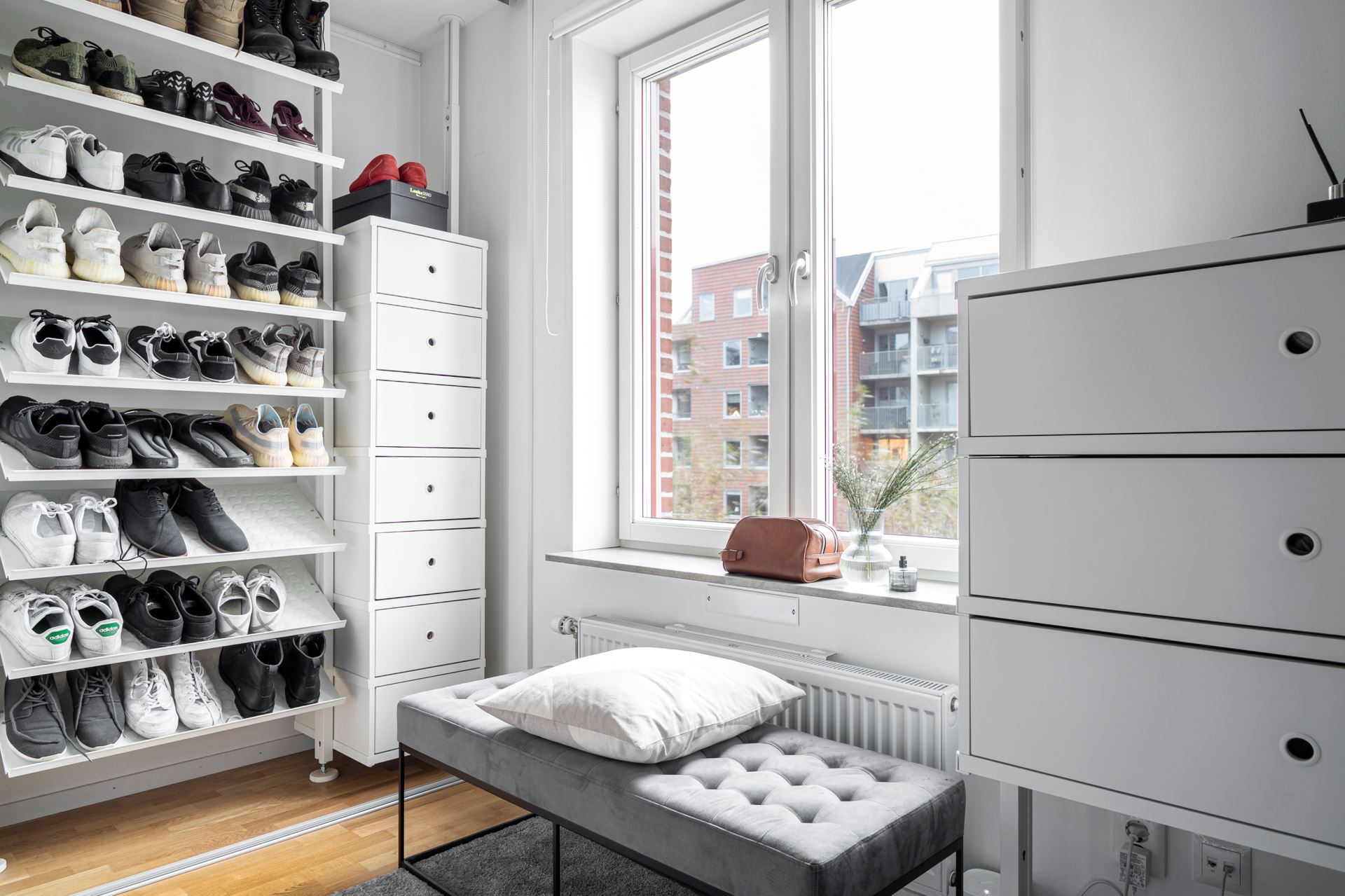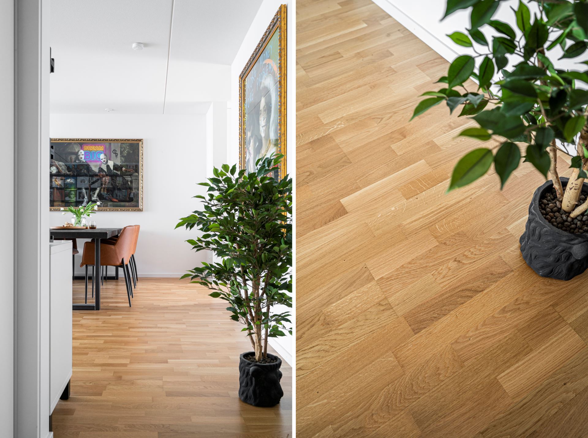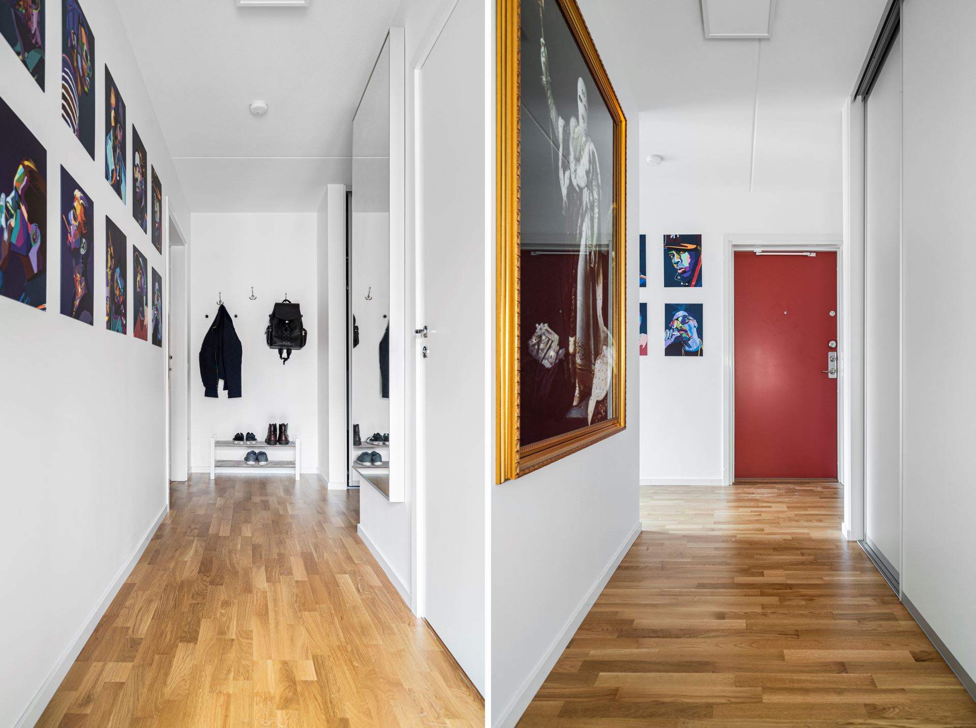 Vi tar hissen till tredje våningen där vi välkomnas vi in i den rymliga hallen som bjuder på gott om plats för avhängning på vänster sida. Ytterligare plats till förvaring får vi bakom skjutdörrsgarderober. Ekparkett på golv och kombineras med sobert vita väggar som är genomgående för hela lägenheten.