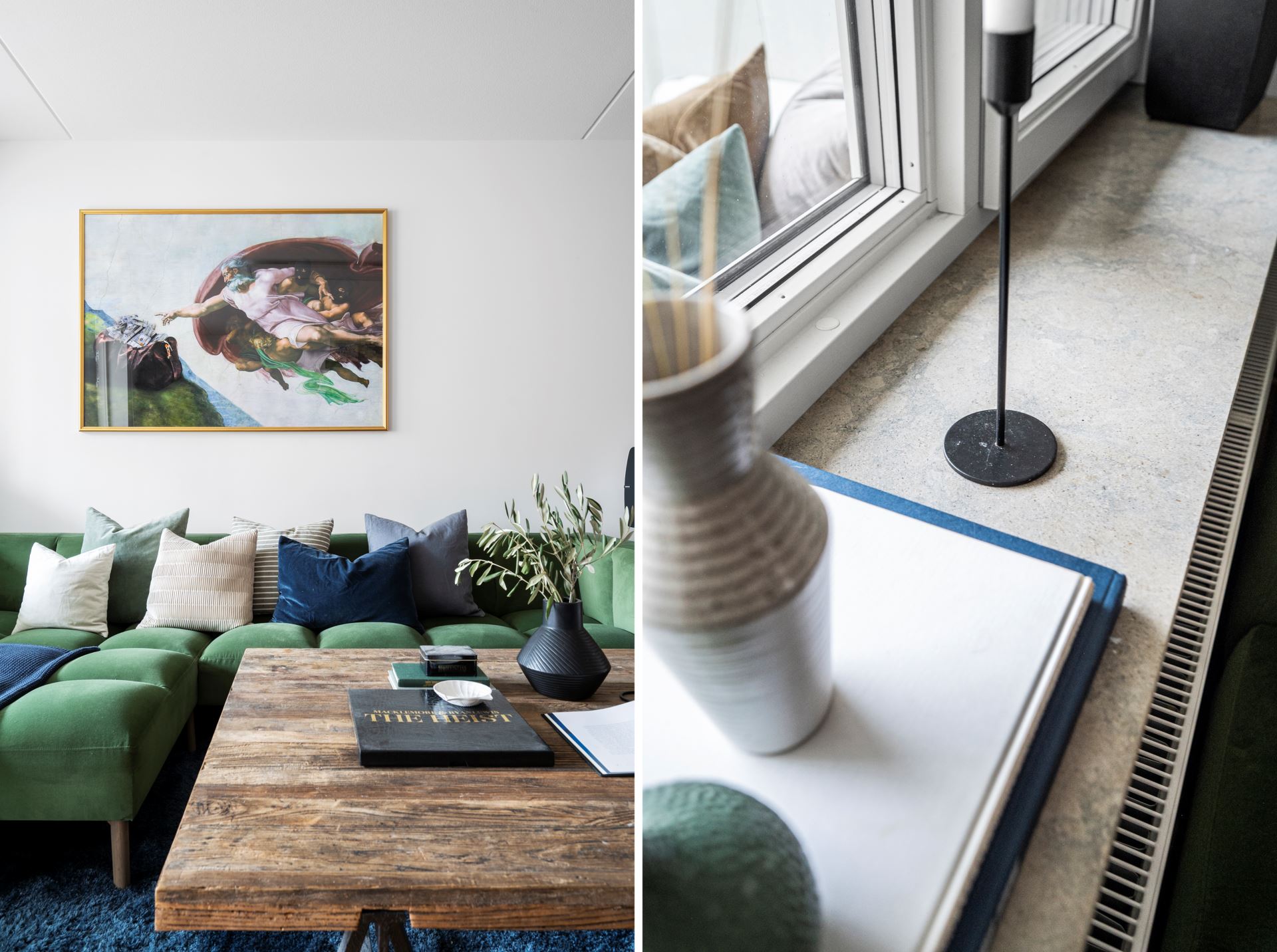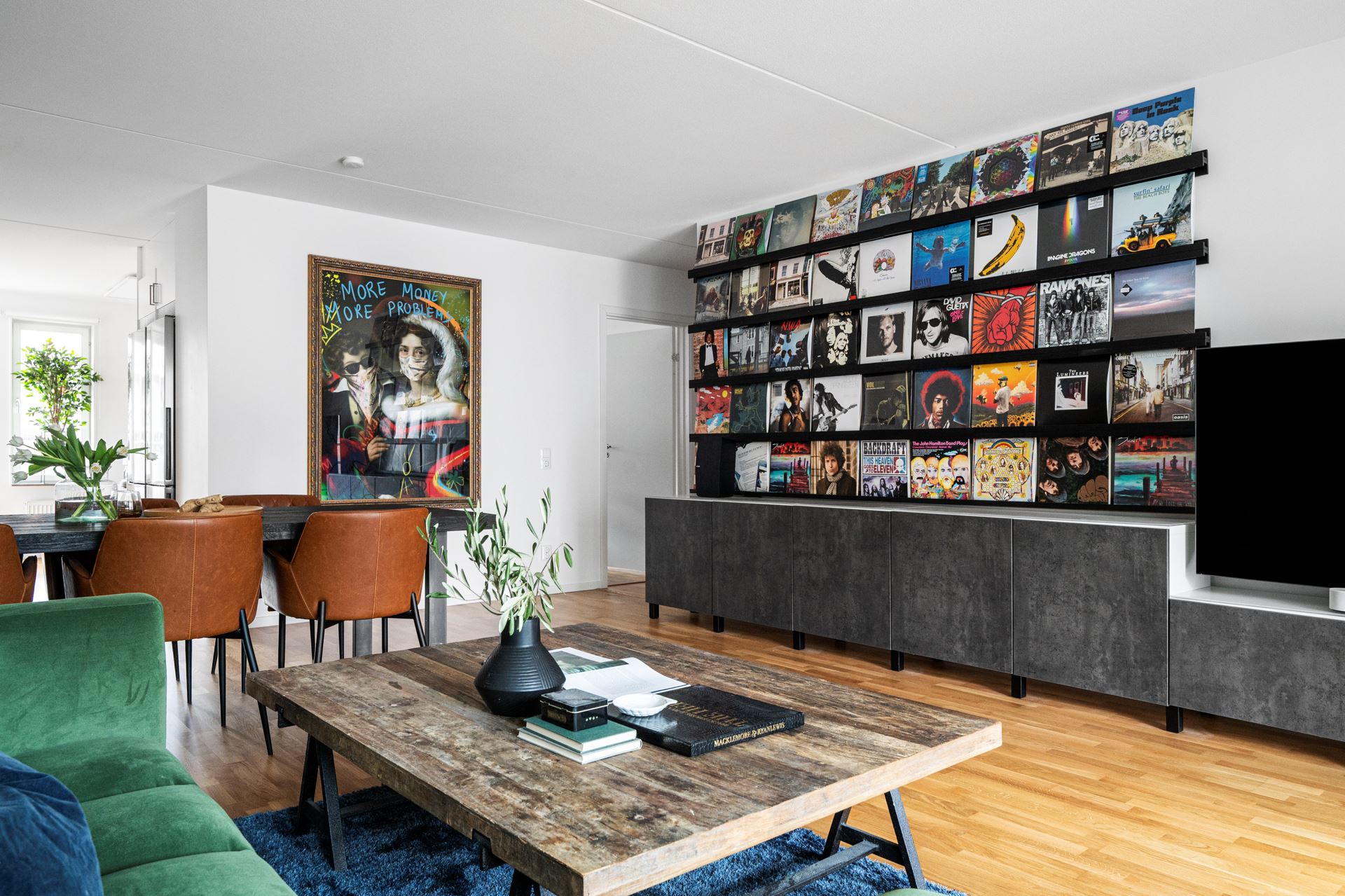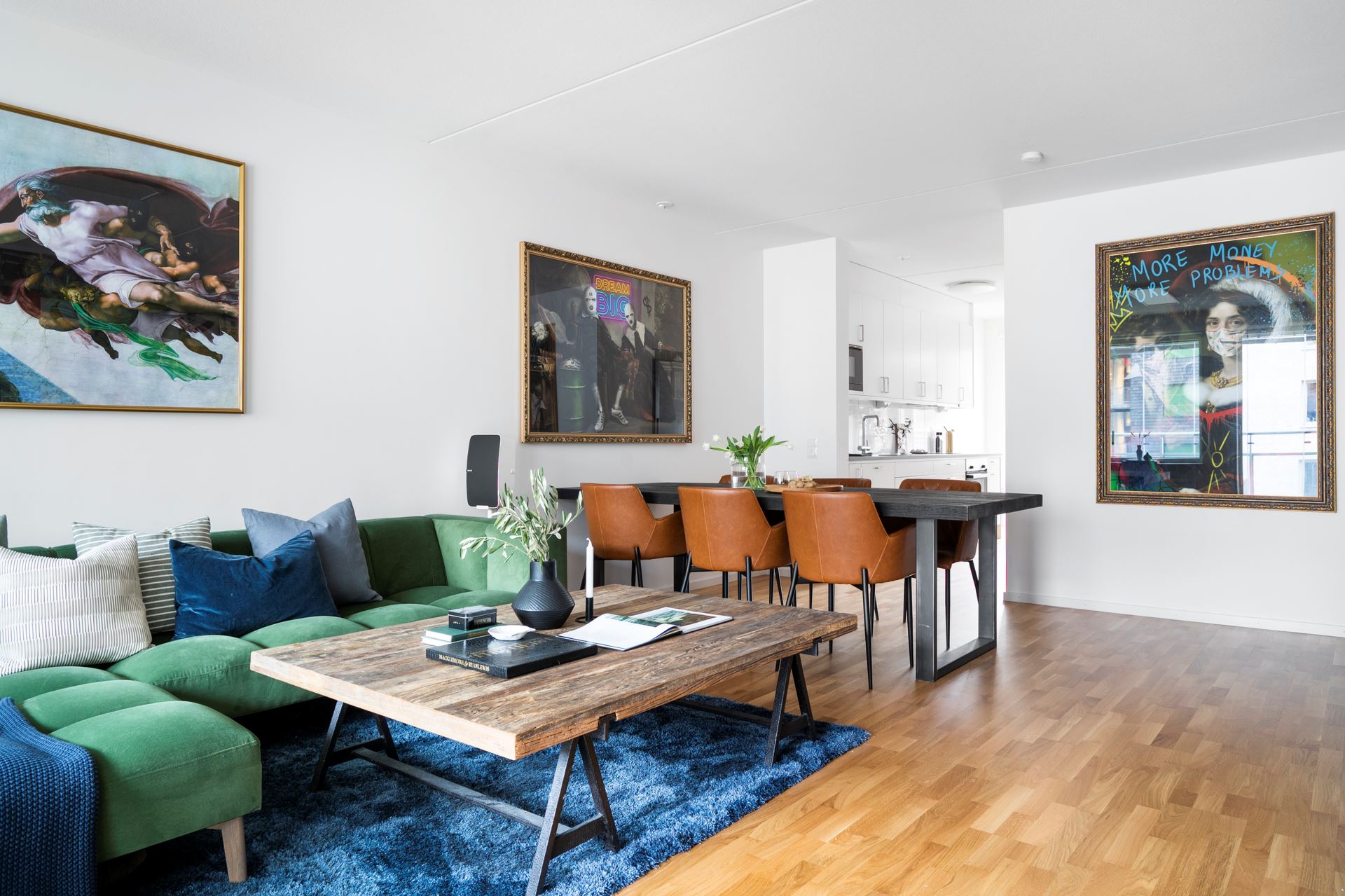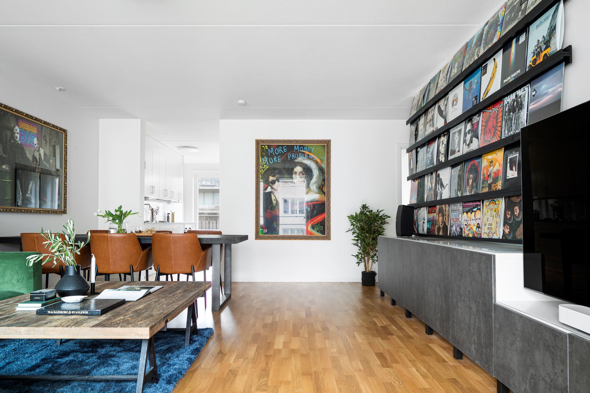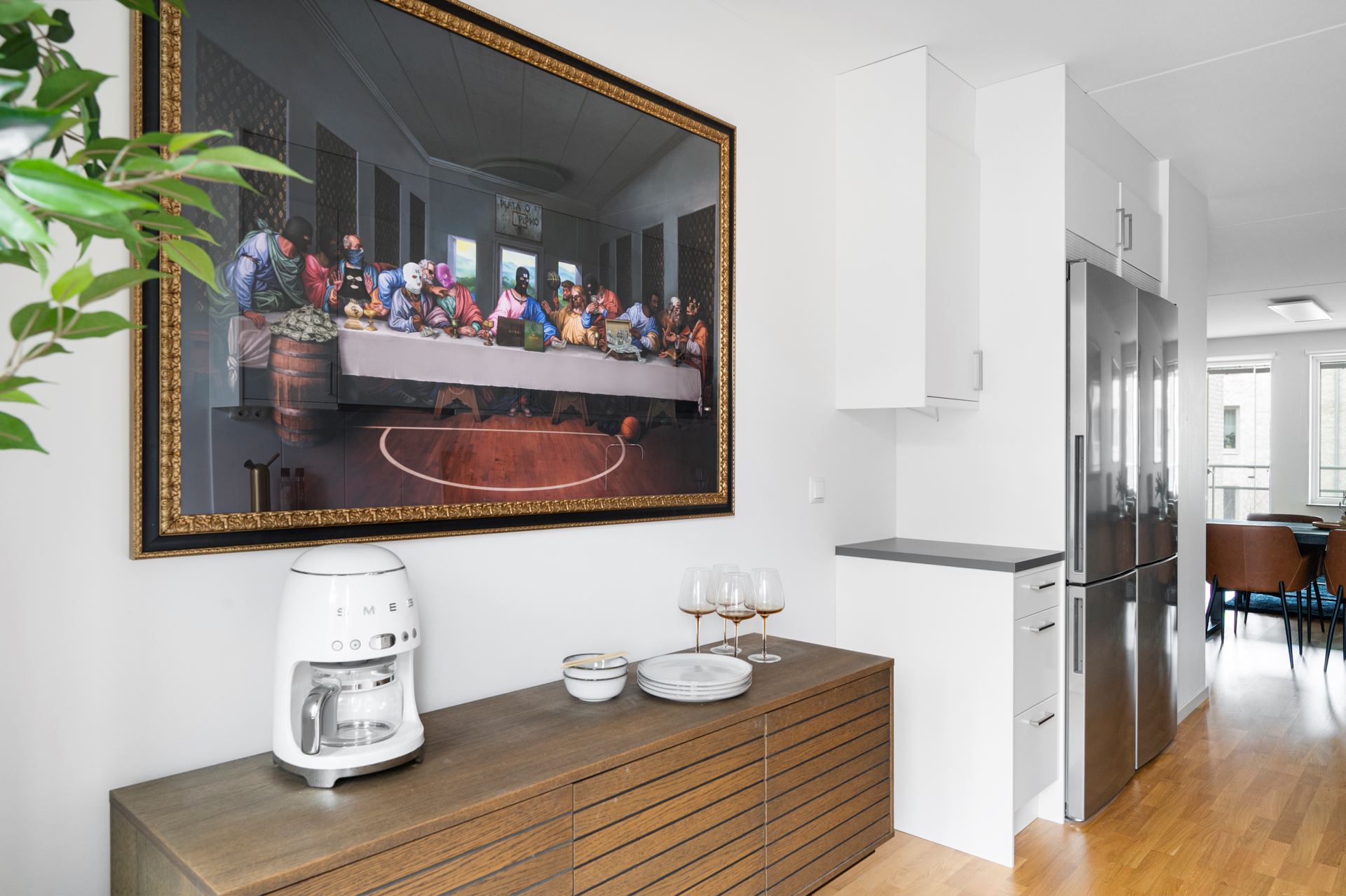 Vi tar hissen till tredje våningen där vi välkomnas vi in i den rymliga hallen som bjuder på gott om plats för avhängning på vänster sida. Ytterligare plats till förvaring får vi bakom skjutdörrsgarderober. Ekparkett på golv och kombineras med sobert vita väggar som är genomgående för hela lägenheten.