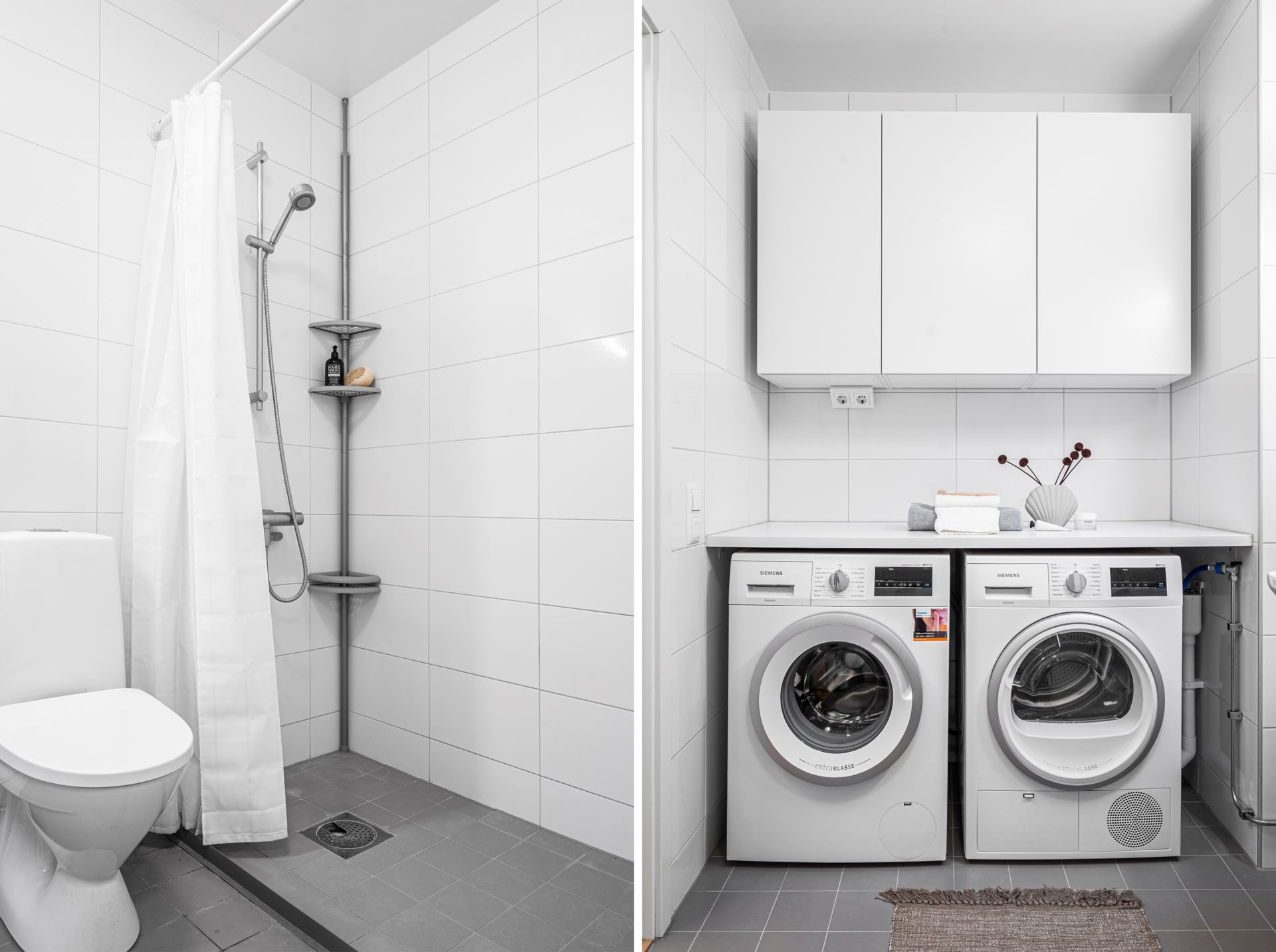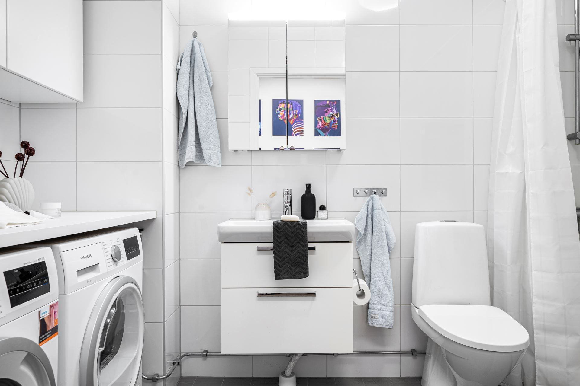 Från hallen nås badrummet, kakel på väggarna och klinkers på golv. Badrummet är utrustat med badkar, wc, handfat med kommod, spegel, tvättmaskin och torktumlare (Siemens). Ytterligare plats till förvaring finns i skåpen ovan tvätt,- och tork.