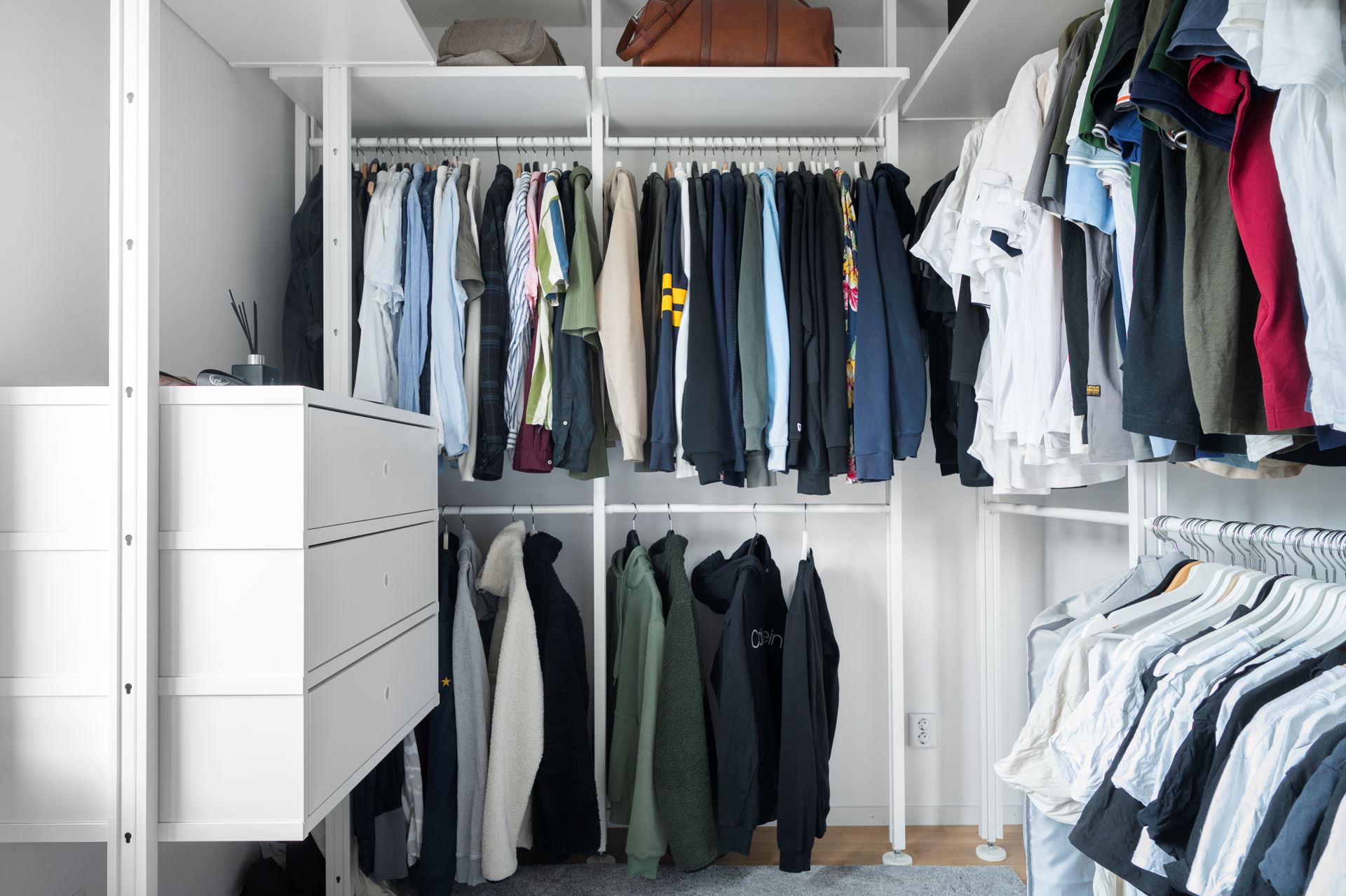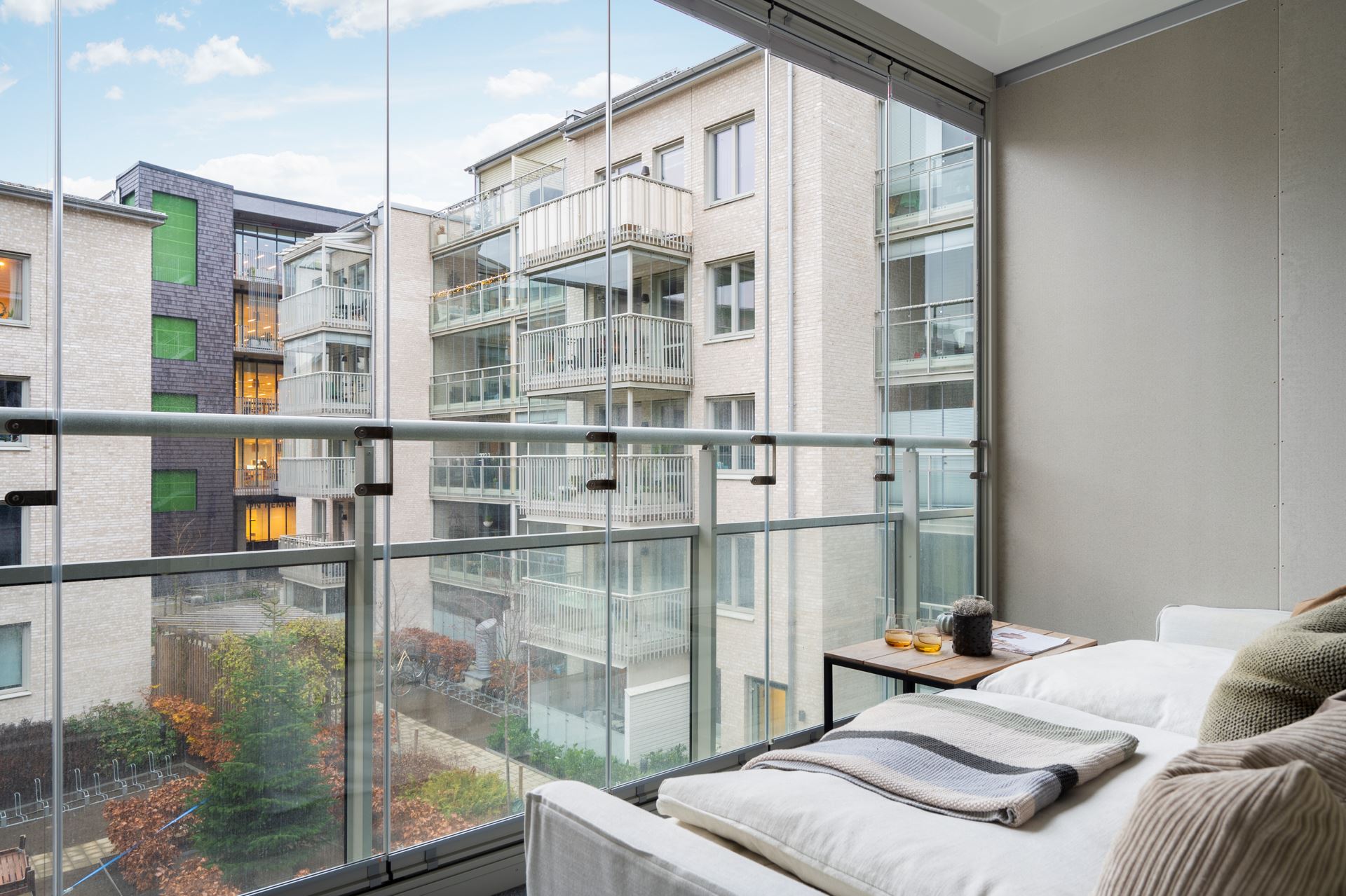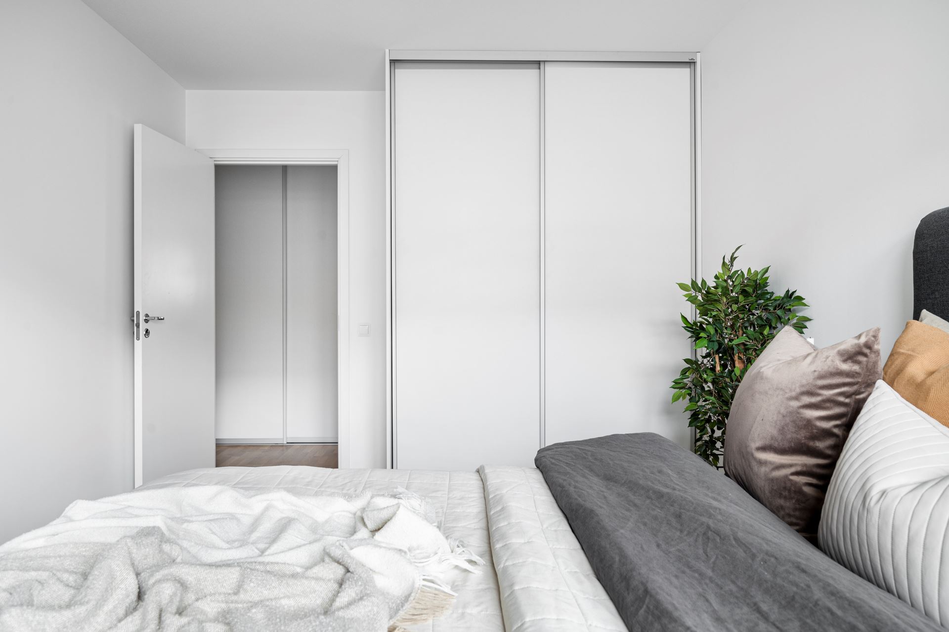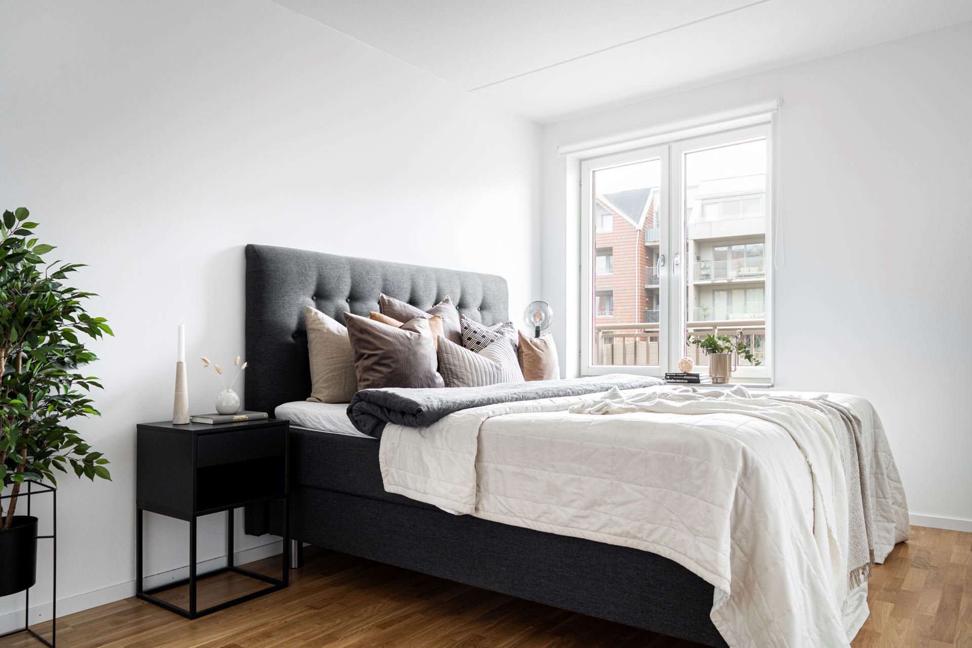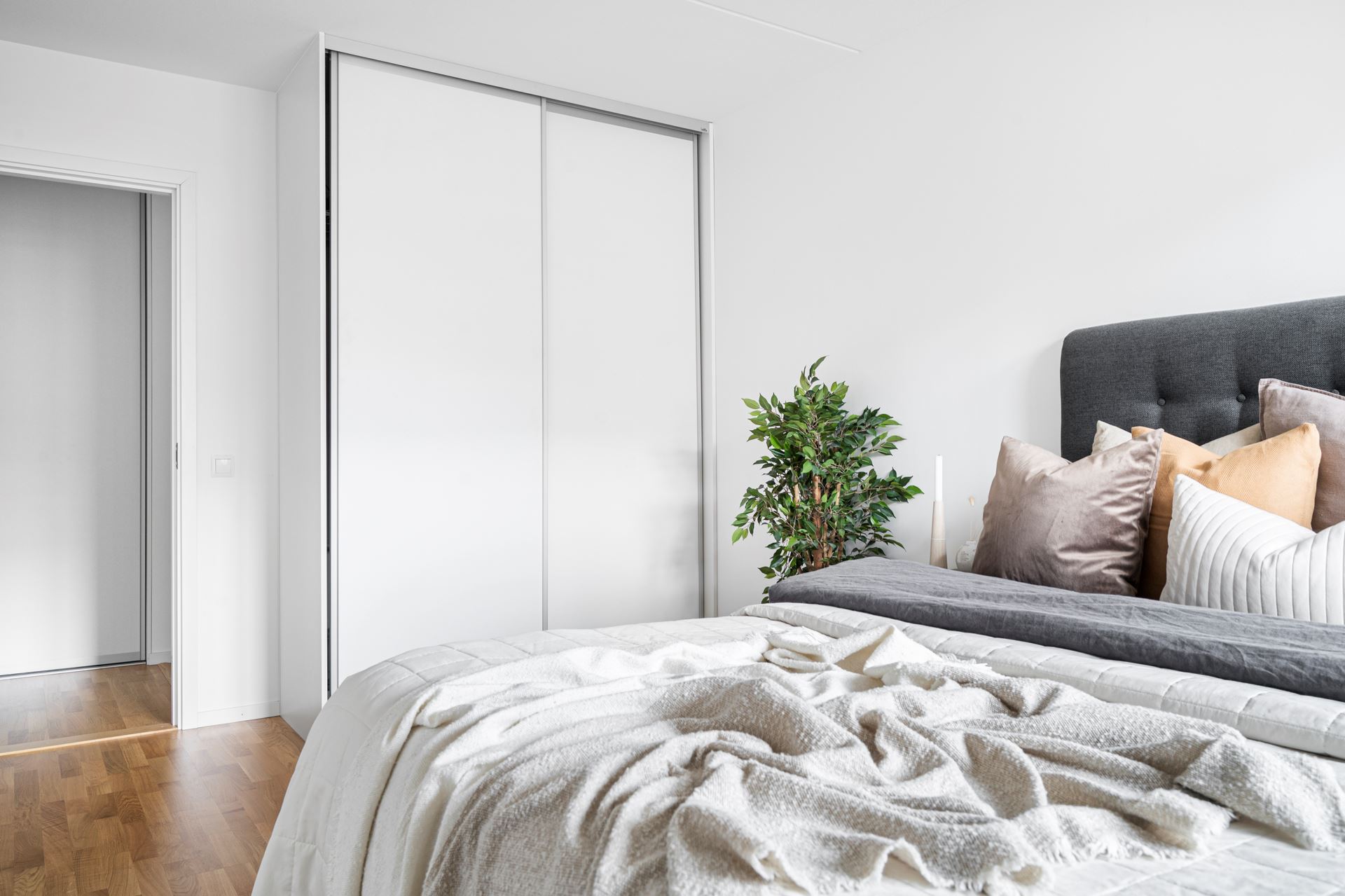 Släta vita väggar kombineras med ekparkett på golv, vilket är genomgående för hela lägenheten. Rymligt sovrum med gott om plats för dubbelsäng, sängbord och ytterligare förvaringsmöbel. Plats till förvaring får vi tack i den stora klädkammaren som rymmer plats för alla årstiders kläder och skor.