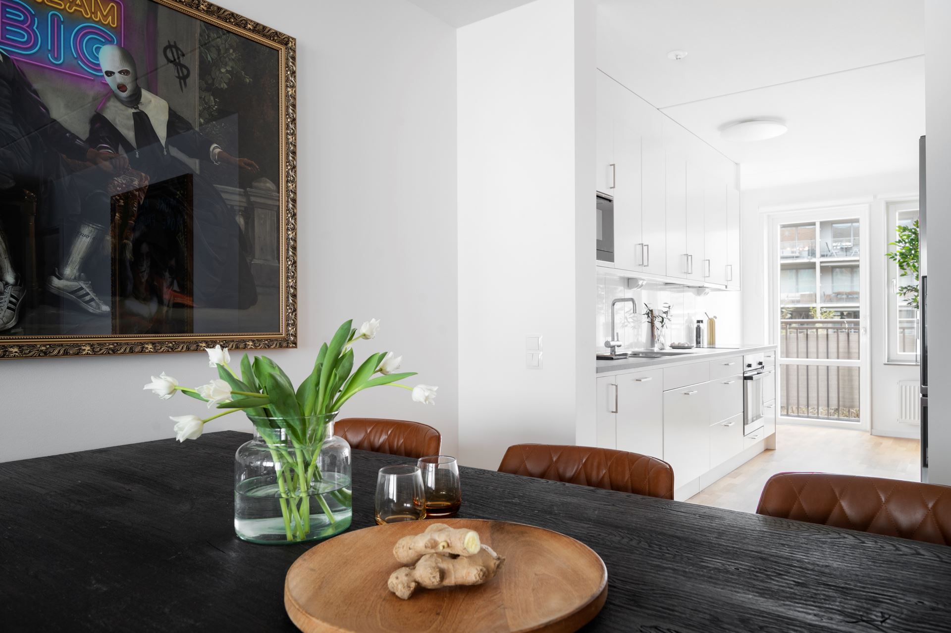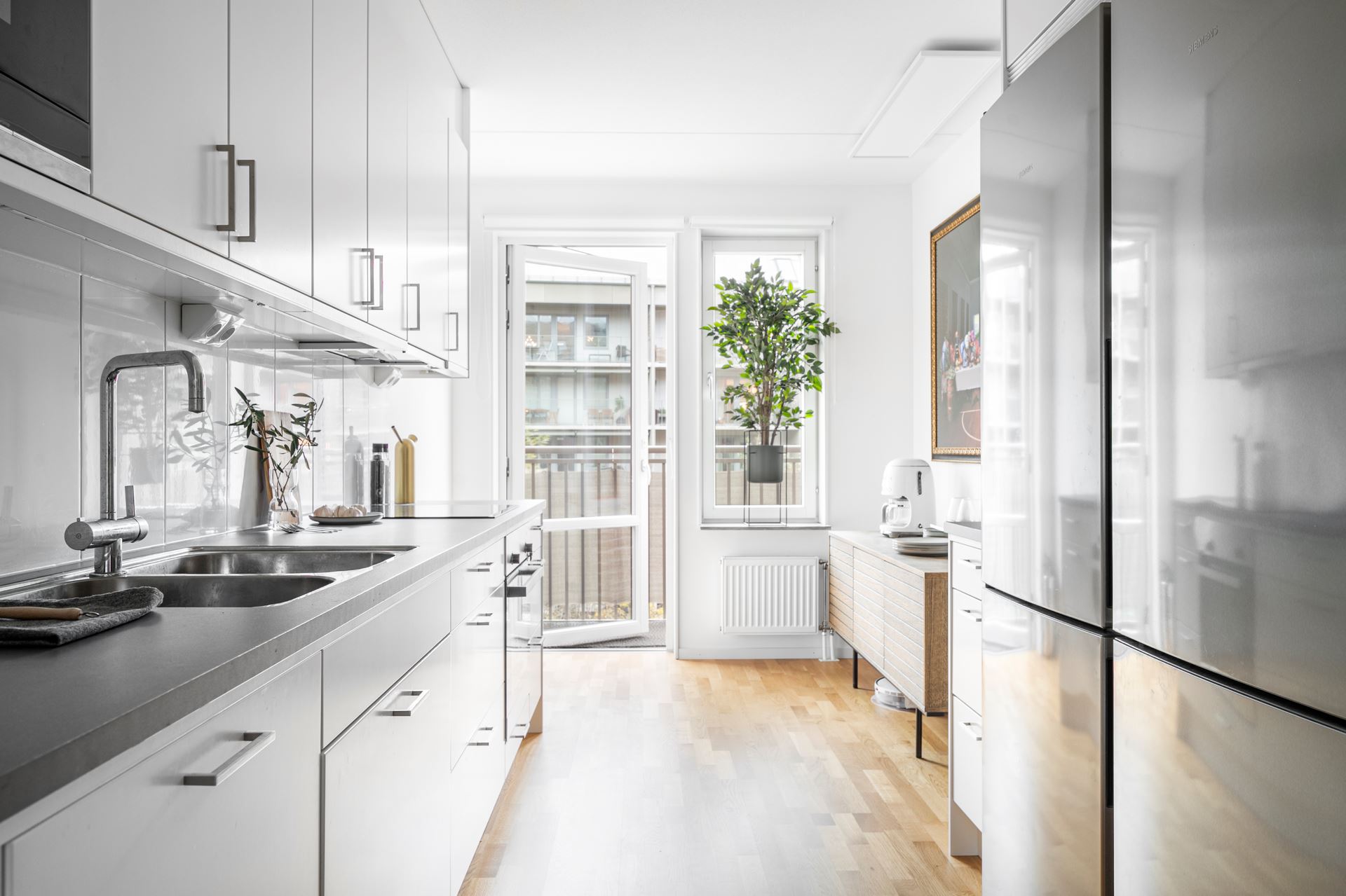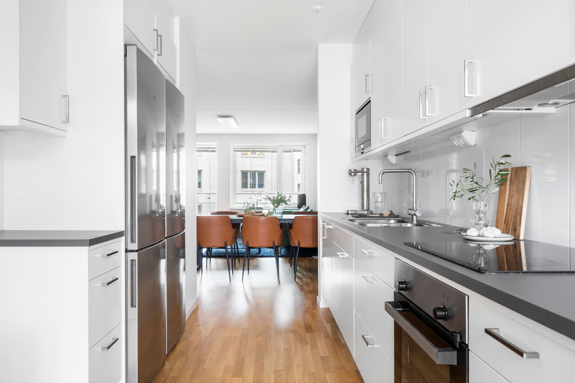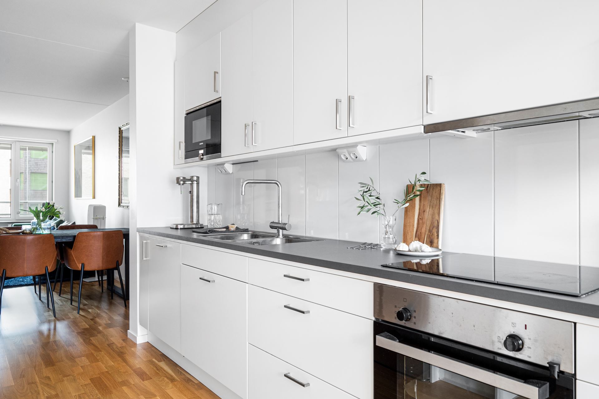 Kök och vardagsrum i praktiskt halvöppen planlösning. Vita köksluckor (Vedum) kombineras med vitt kakel och bänkskiva i laminat. Utmärkta förvaringsmöjligheter i skåp och lådor samt bra arbetsytor. Köket är utrustat med spishäll, diskmaskin, ugn, mikrovågsrum, kyl och frys. Samtlig utrustning från Siemens. Fläkt (Franke). Från köket finns utgången till en av lägenhetens båda balkonger, belägen i österläge blir detta en naturlig plats att avnjuta morgonkaffet på.