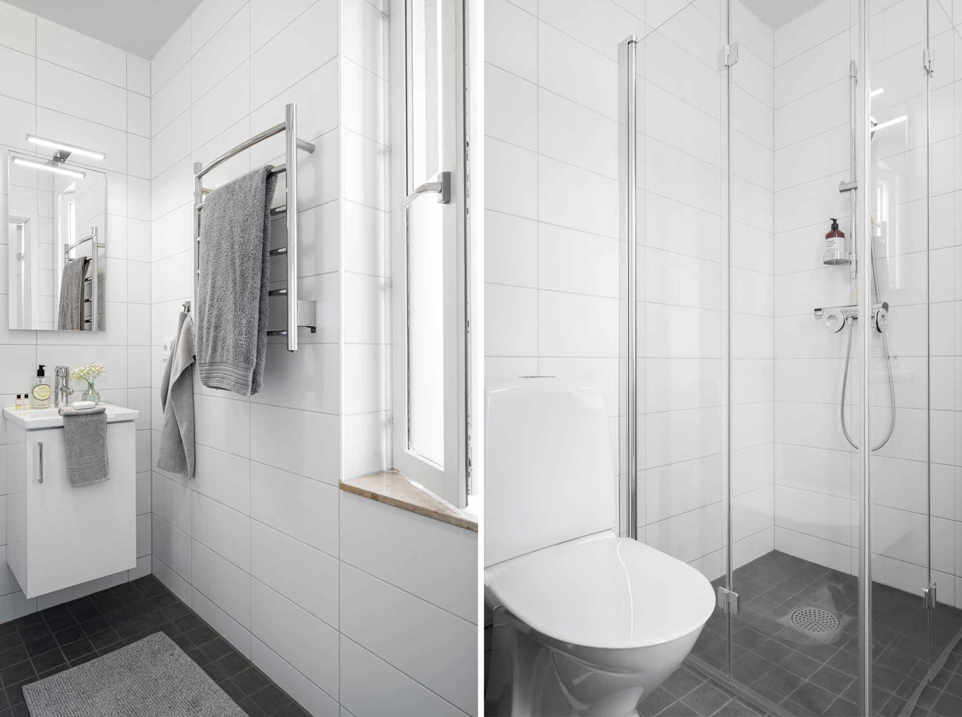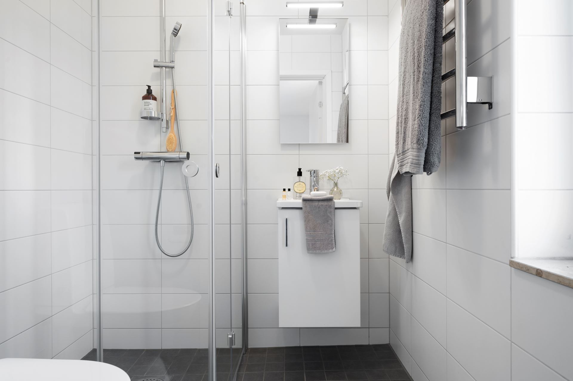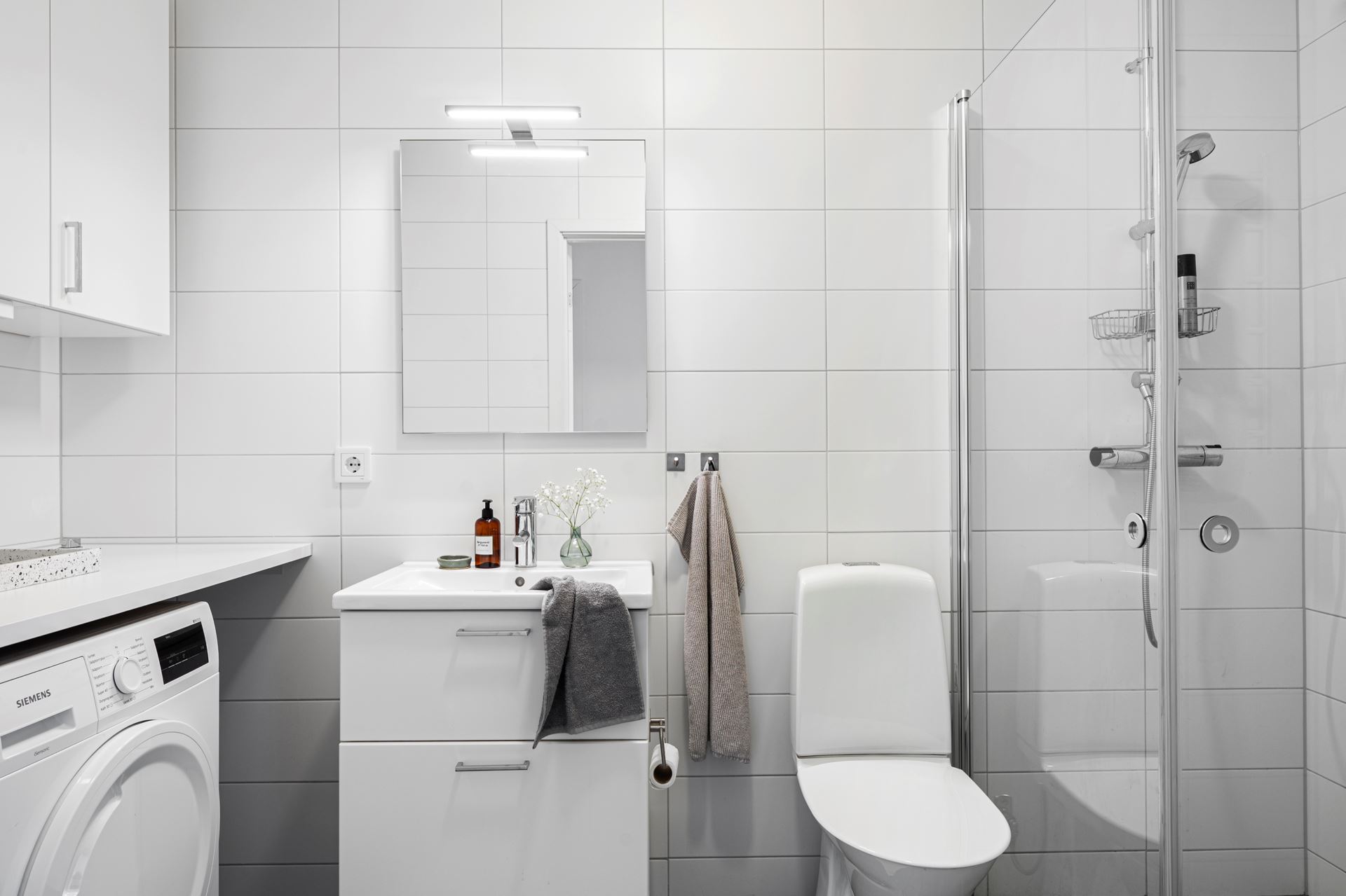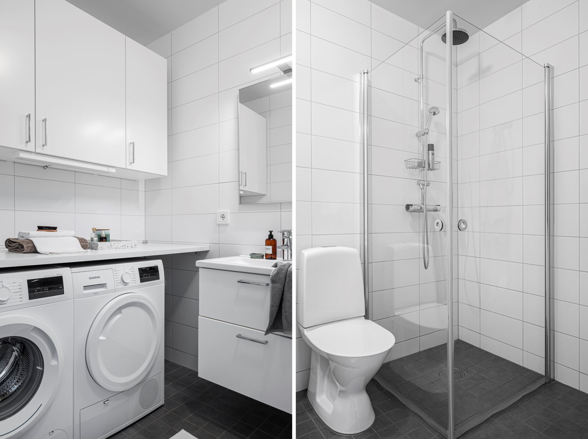 Helkaklat badrum med vitt kakel som kombineras smakfullt med gråa klinkers på golv. Badrummet är utrustat med dusch bakom glasvägg, handfat med kommod, handdukstork, wc, tvättmaskin och torktumlare. Ytterligare skåpsförvaring och arbetsyta finns ovanför tvätt,- och tork.