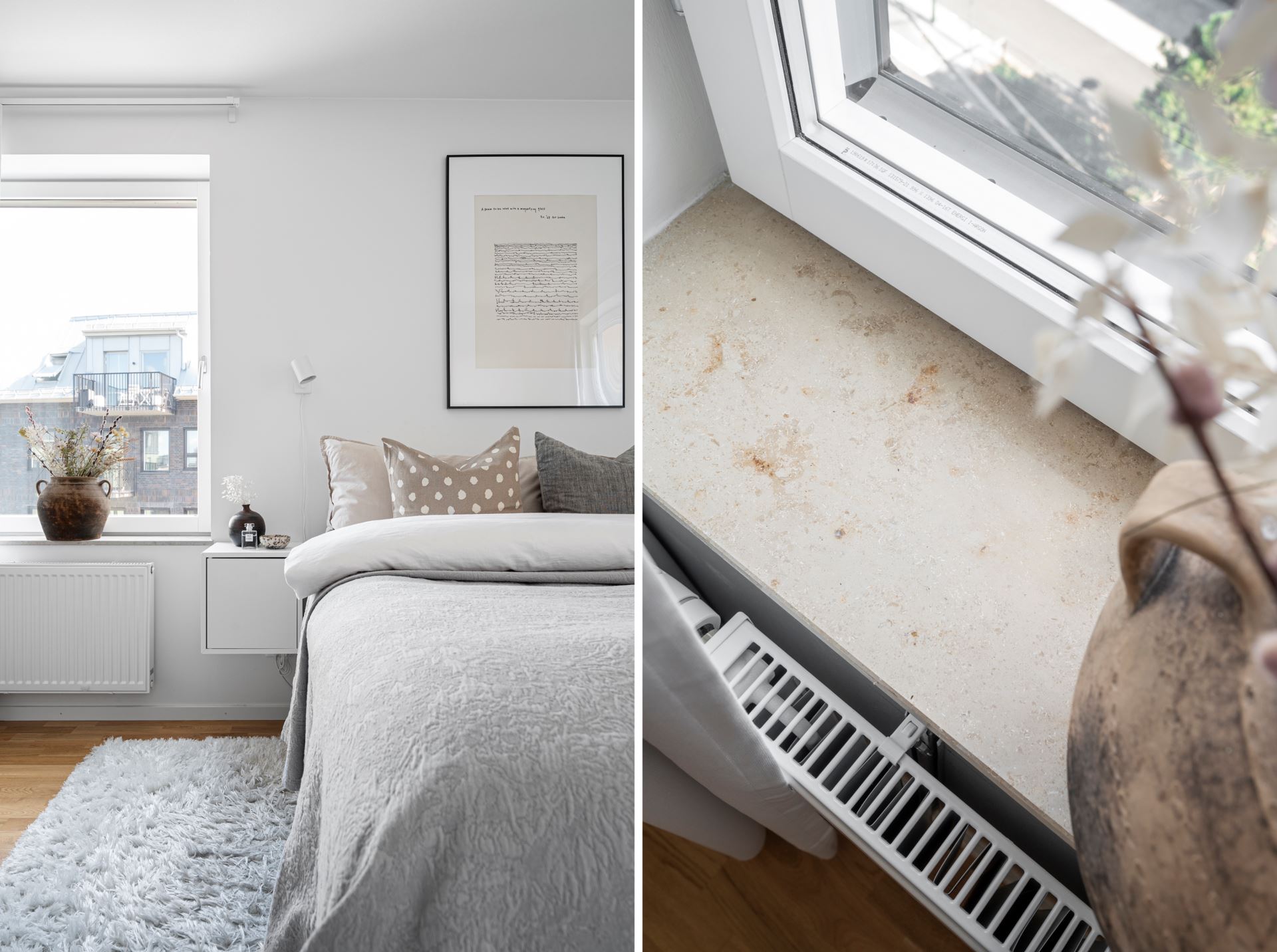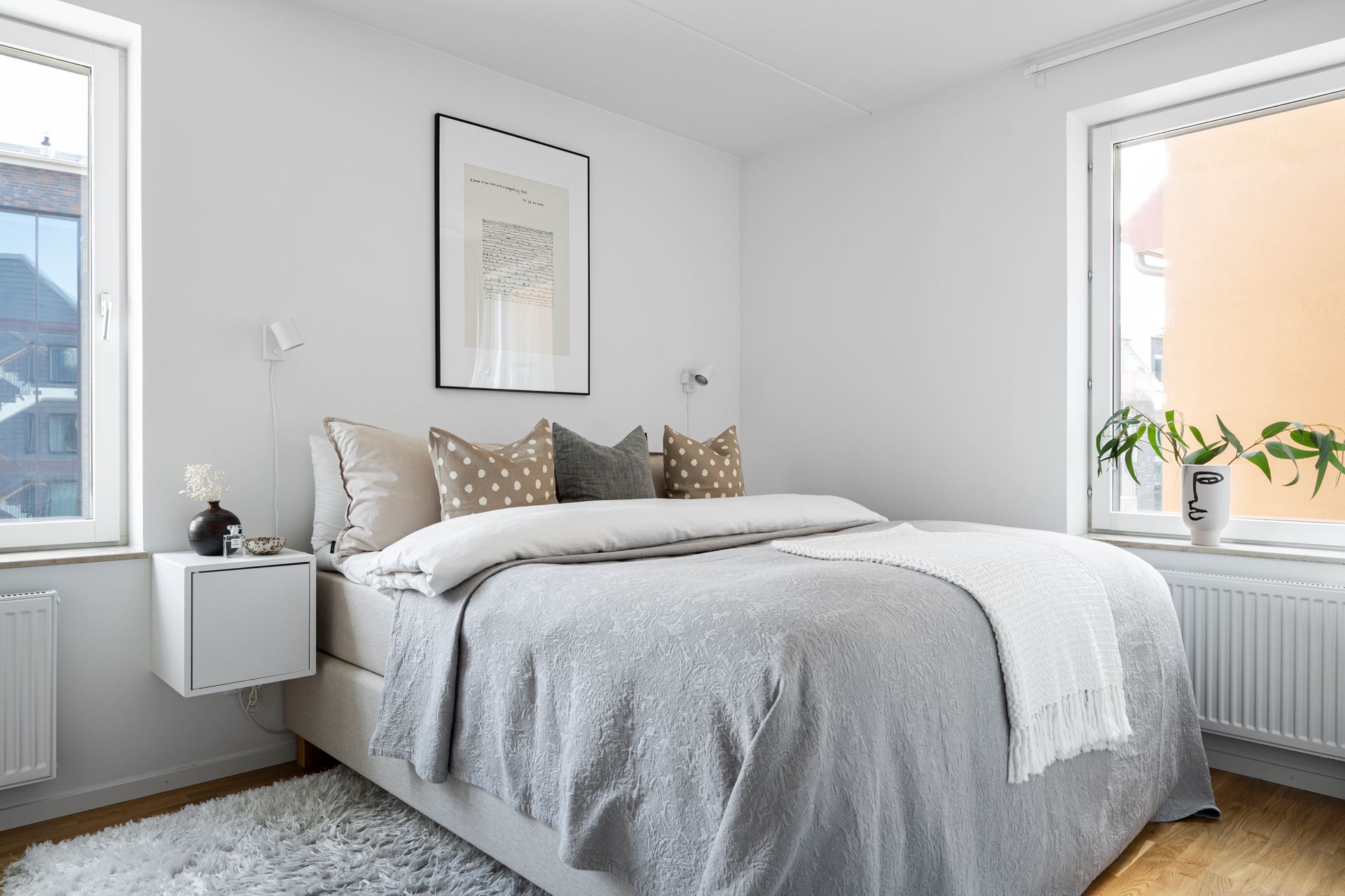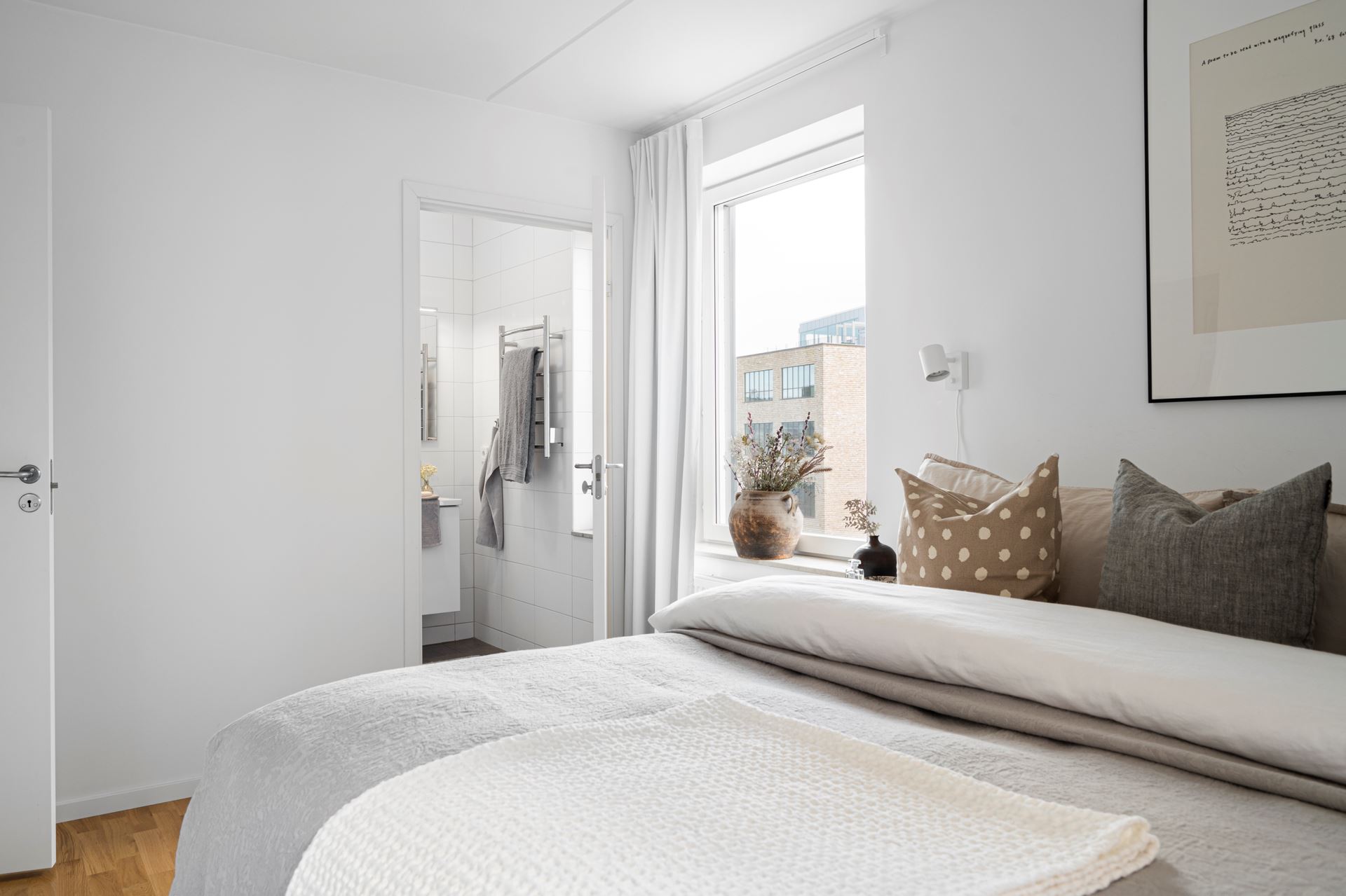 Master bedroom är rymligt till storleken och rymmer gott och väl plats för både dubbelsäng, sängbord och mer därtill. Vita väggar kombineras med solid parkett på golv. Från master bedroom nås även bostadens andra badrum.