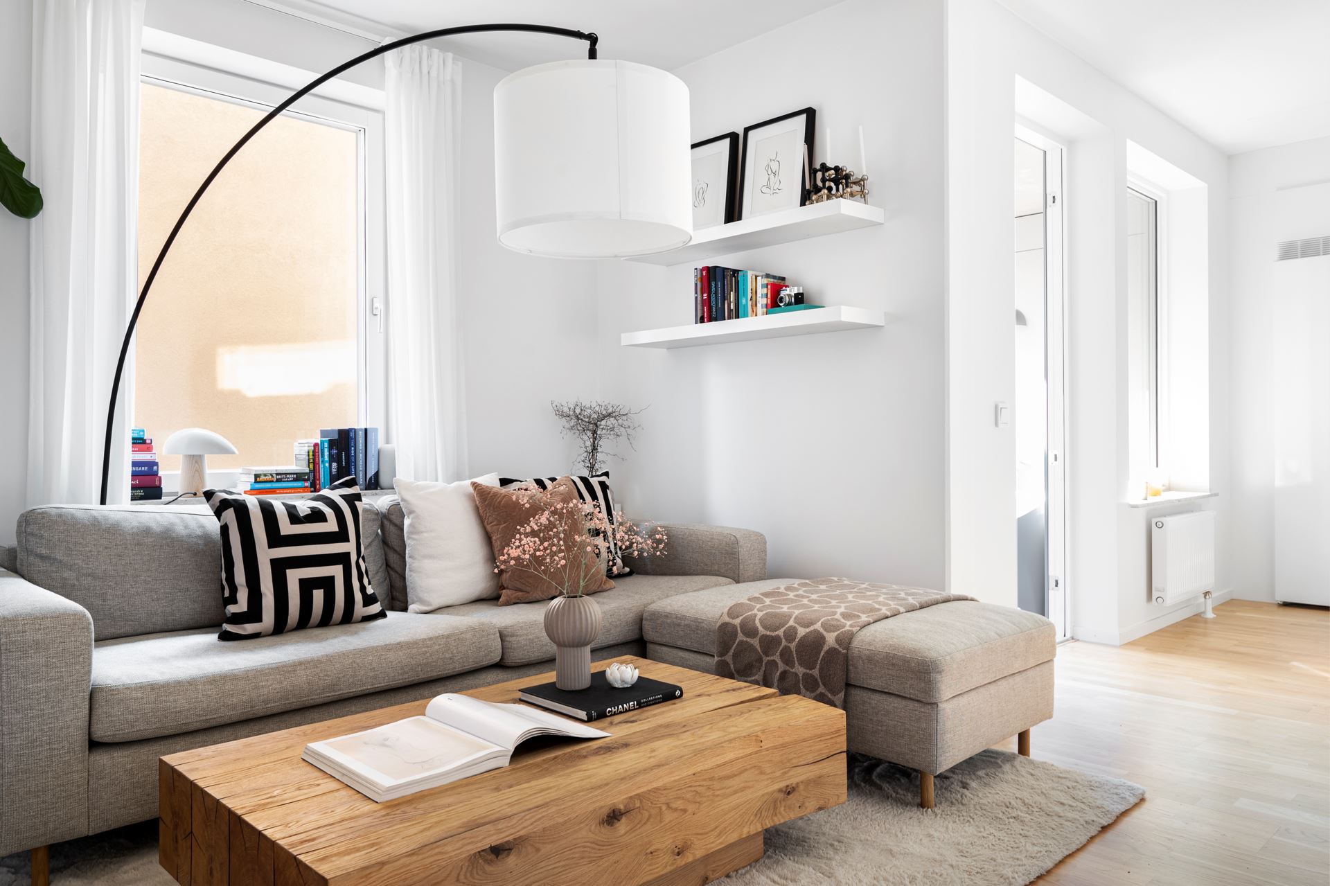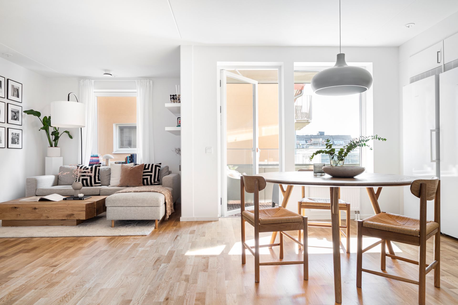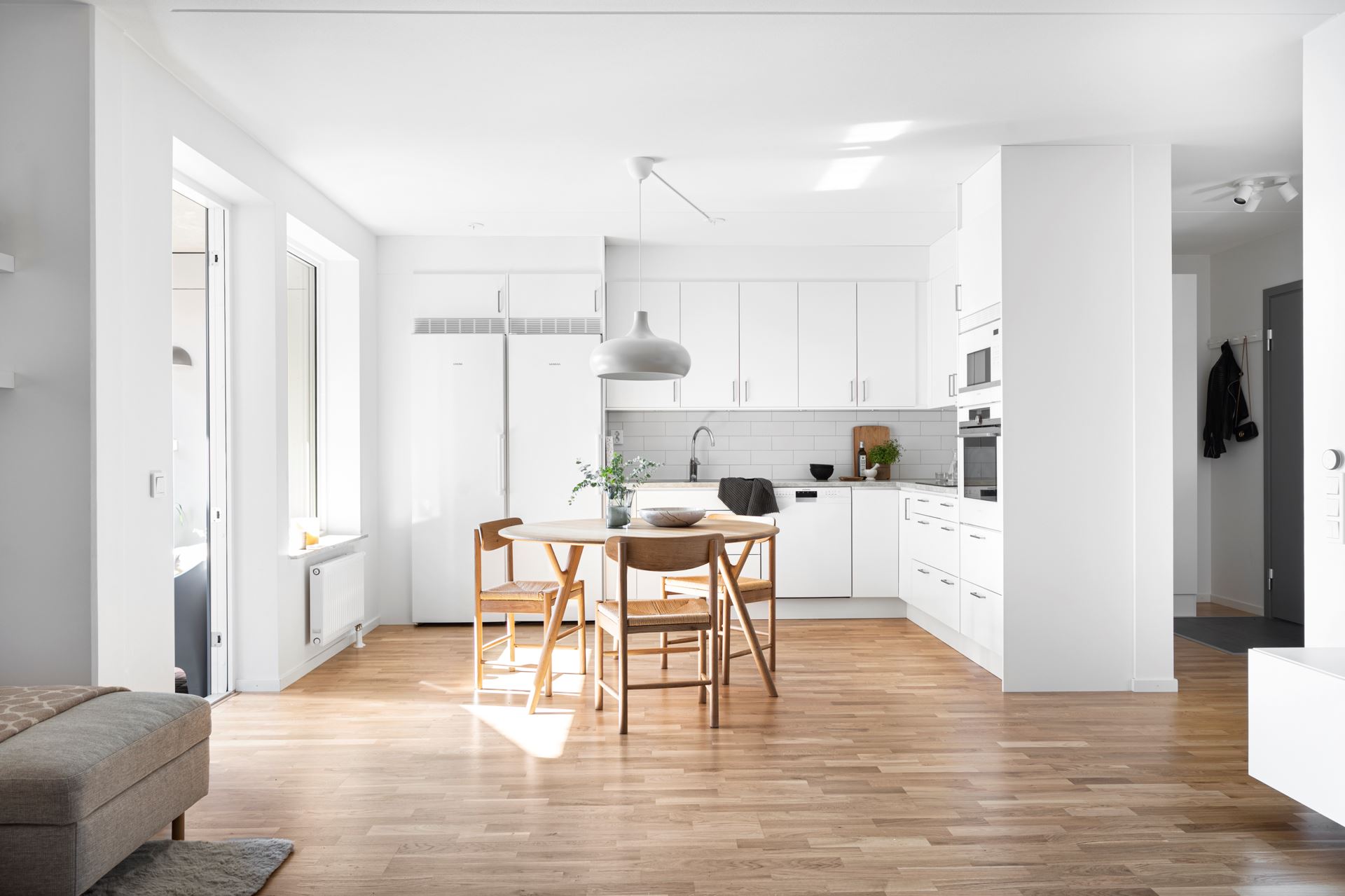 Vidare öppnar vardagsrummet upp med sociala ytor där kök och vardagsrum kombineras i trivsamt öppen planlösning. Plats för soffgrupp och matbord mot köksdelen.