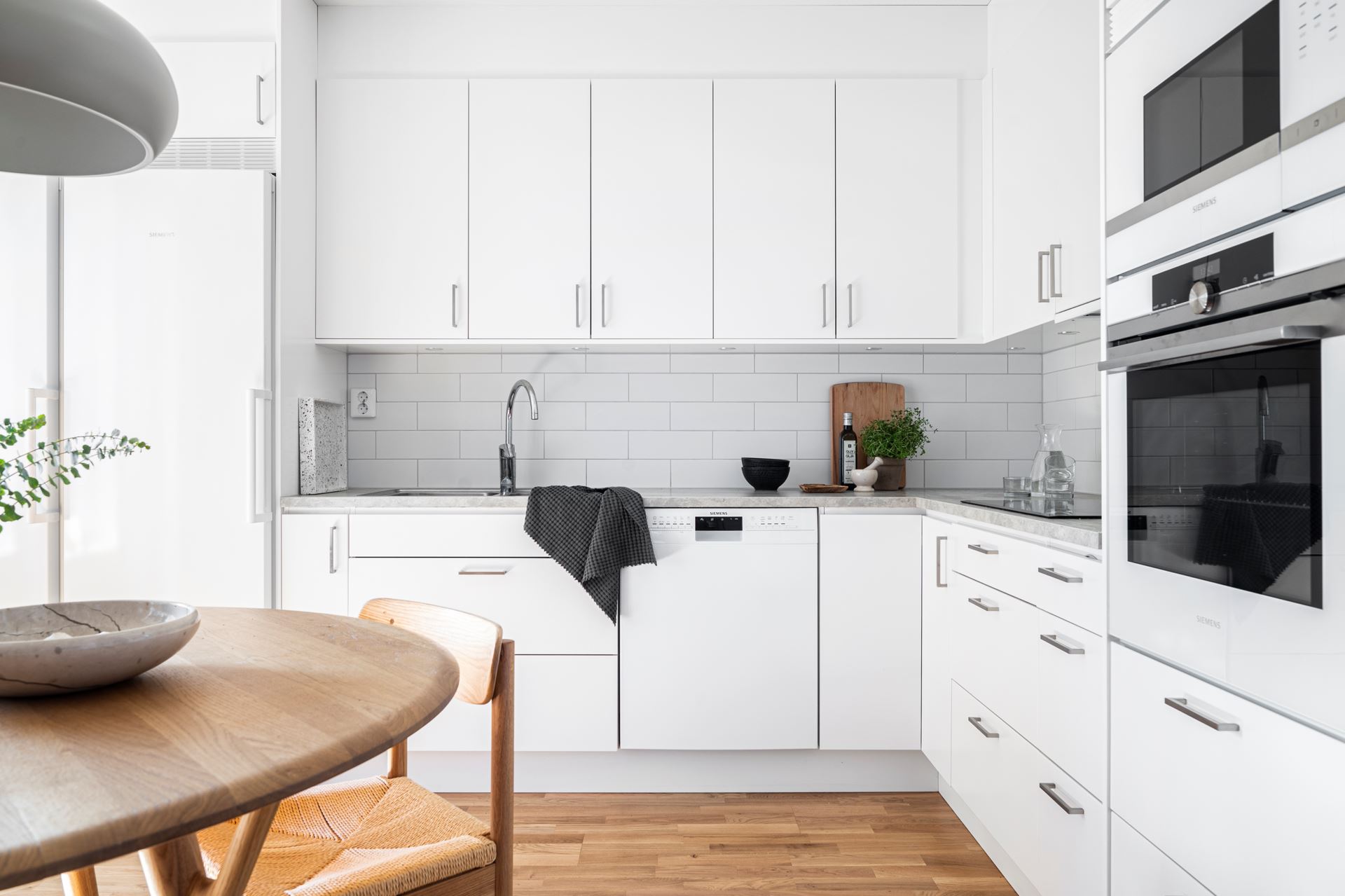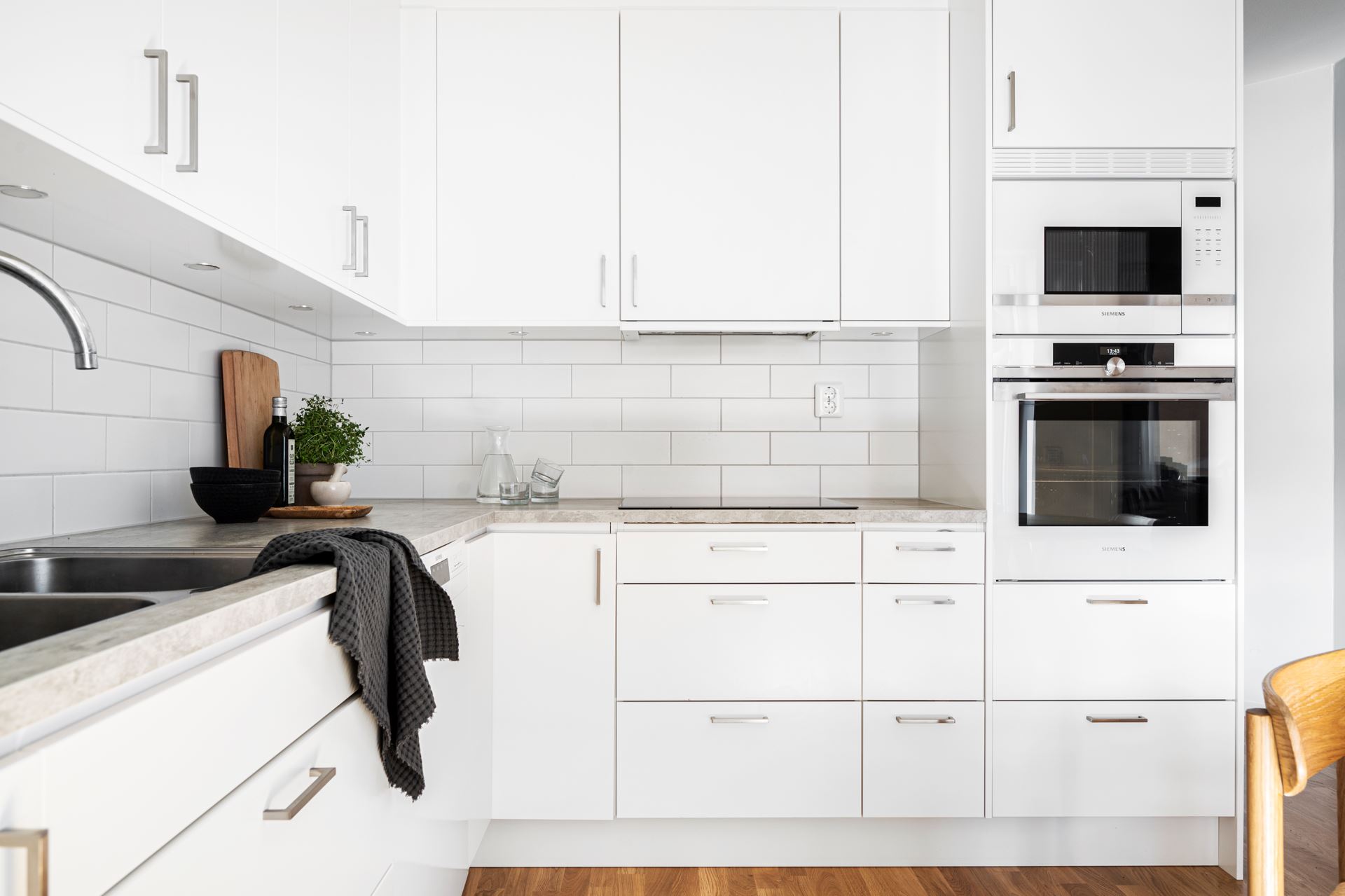Ljusa köksluckor (Vedum) tillsammans med vitt kakel och ljus bänkskiva i laminat. Köket bjuder på både bra förvaringsmöjligheter i skåp och lådor samt goda arbetsytor. Plats för större matbord mot köksdelen. Köket är utrustat med diskmaskin, kyl och frys, spishäll, inbyggnadsugn, inbyggd mikro och fläkt. Från köket nås dessutom den sköna balkongen, belägen i härligt söderläge!
