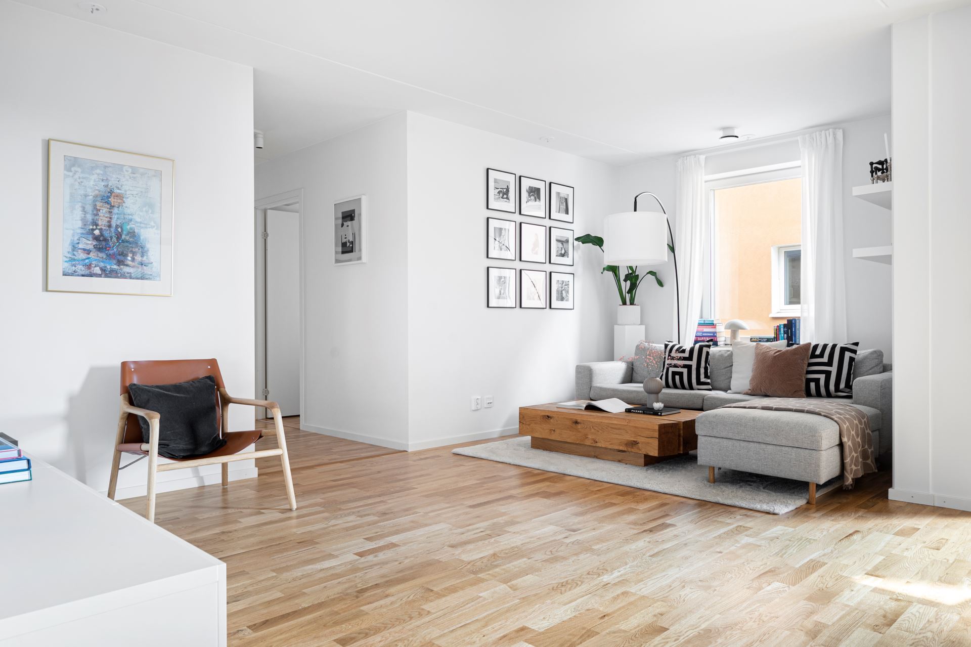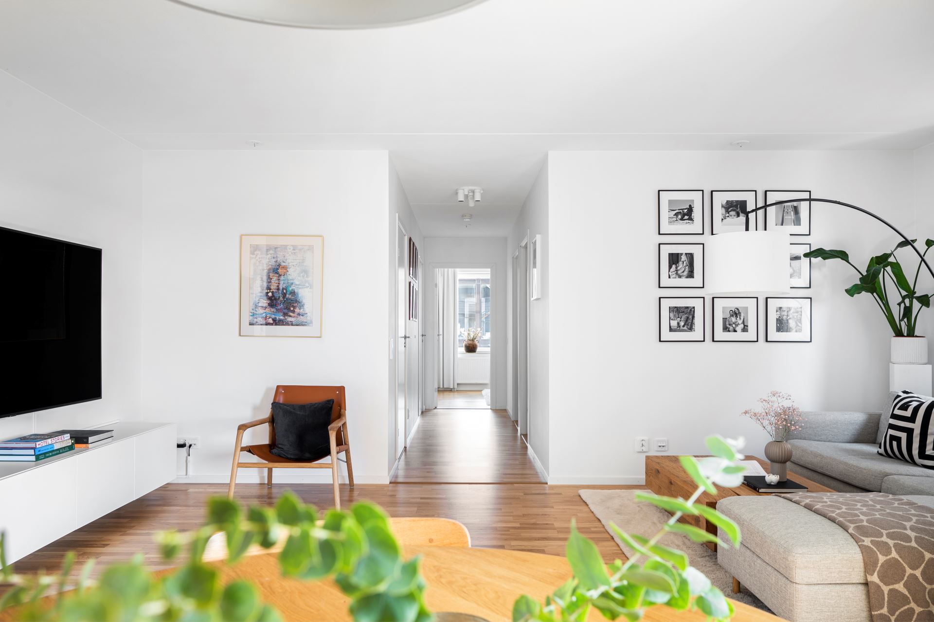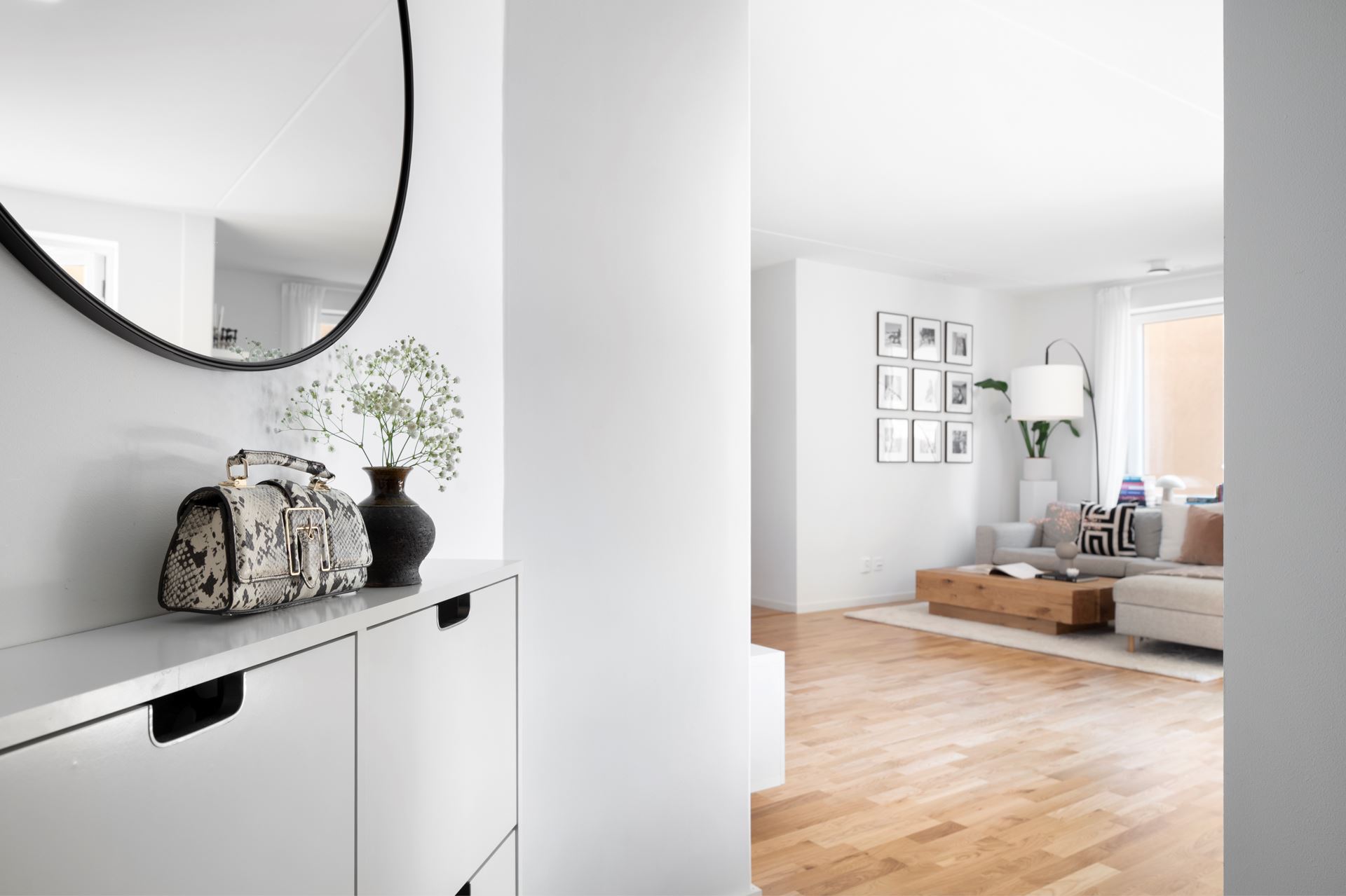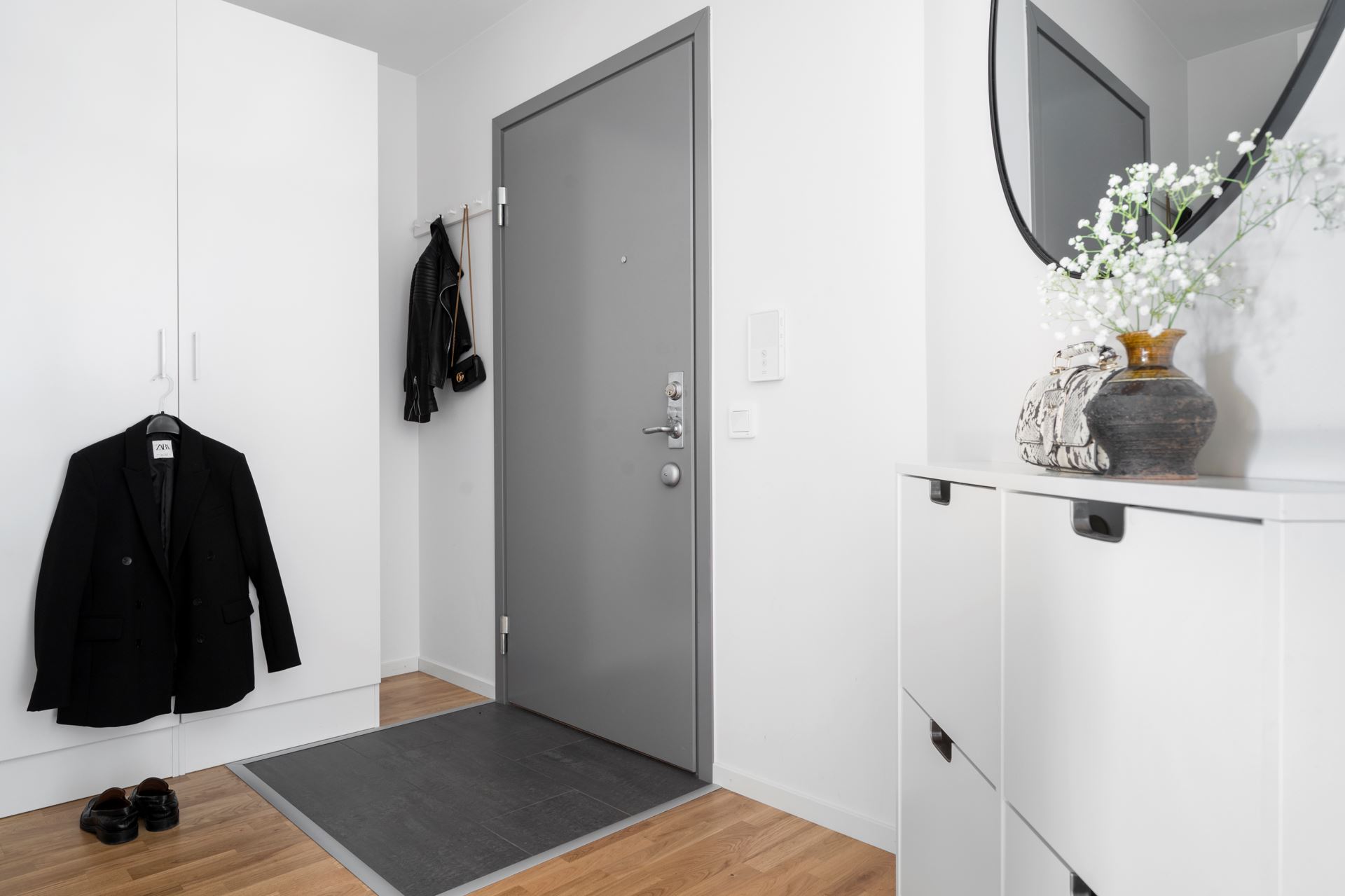 Vi tar hissen till fjärde våningen där hallen välkomnar med mörka klinkers på golv tillsammans med släta vita väggar och parkett på golv, vilket är genomgående i hela bostaden. Avhängningsmöjligheter finns i hallen och vidare in finns även en större klädkammare/förråd som rymmer gott om plats till förvaring.