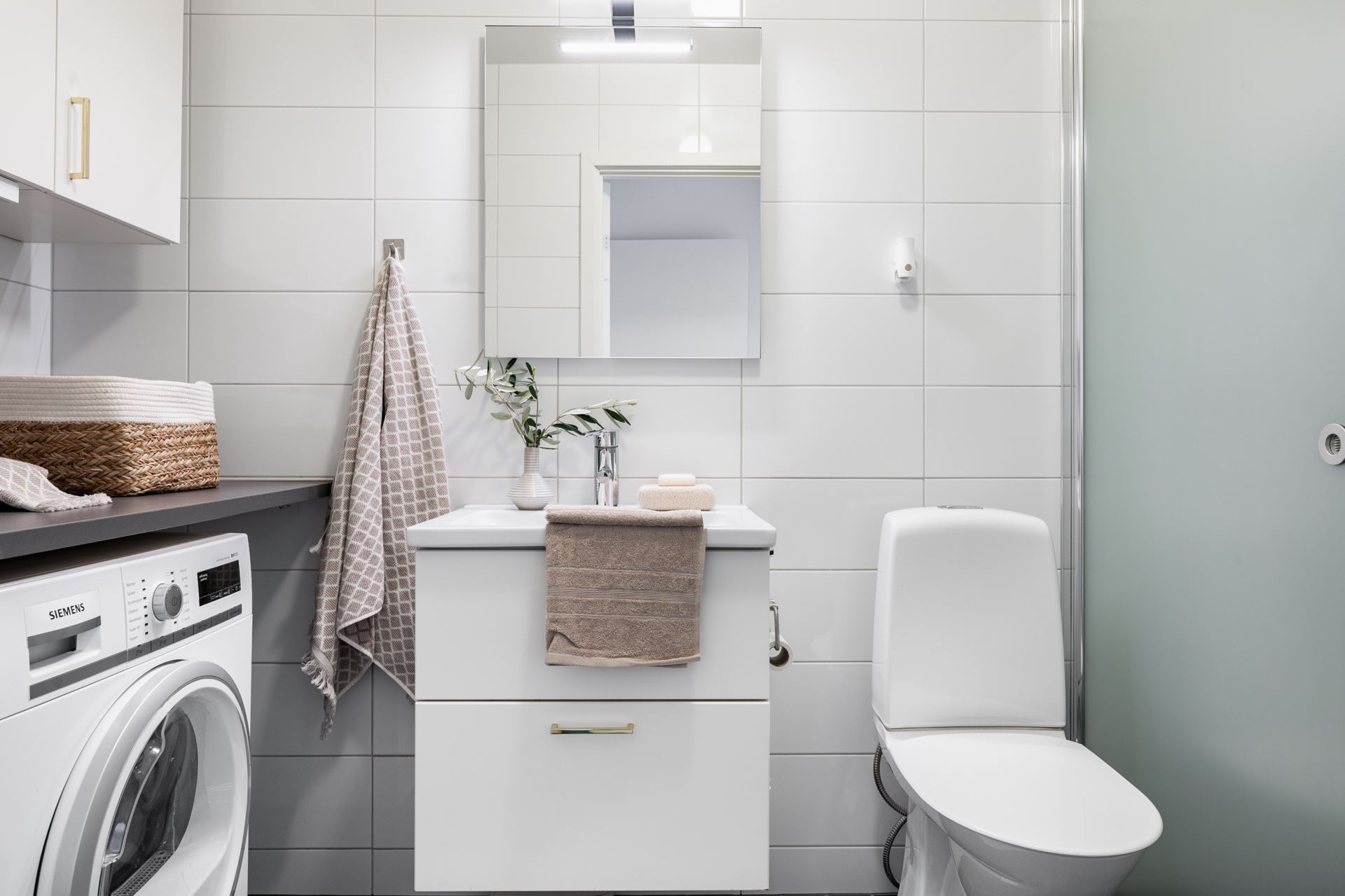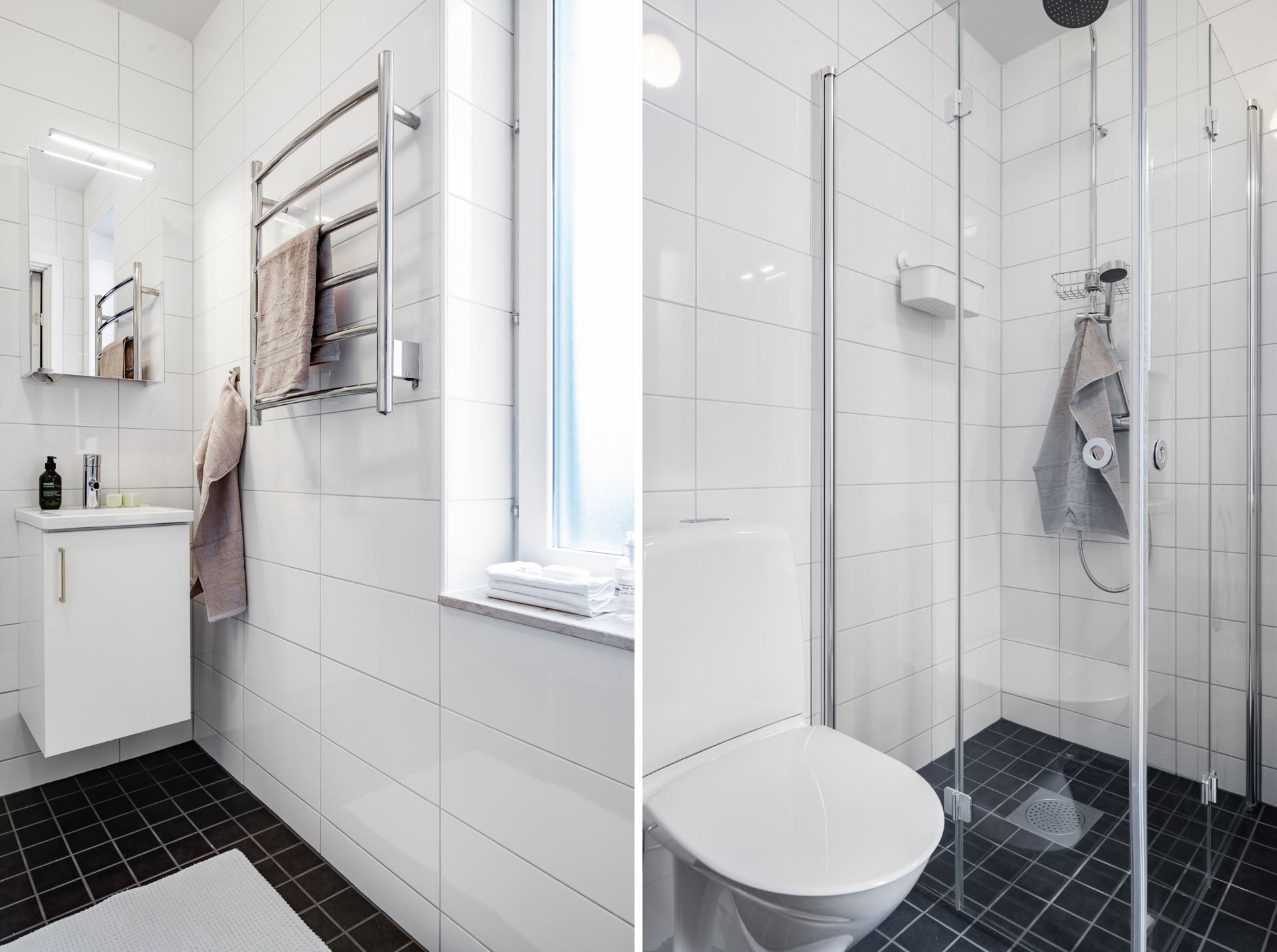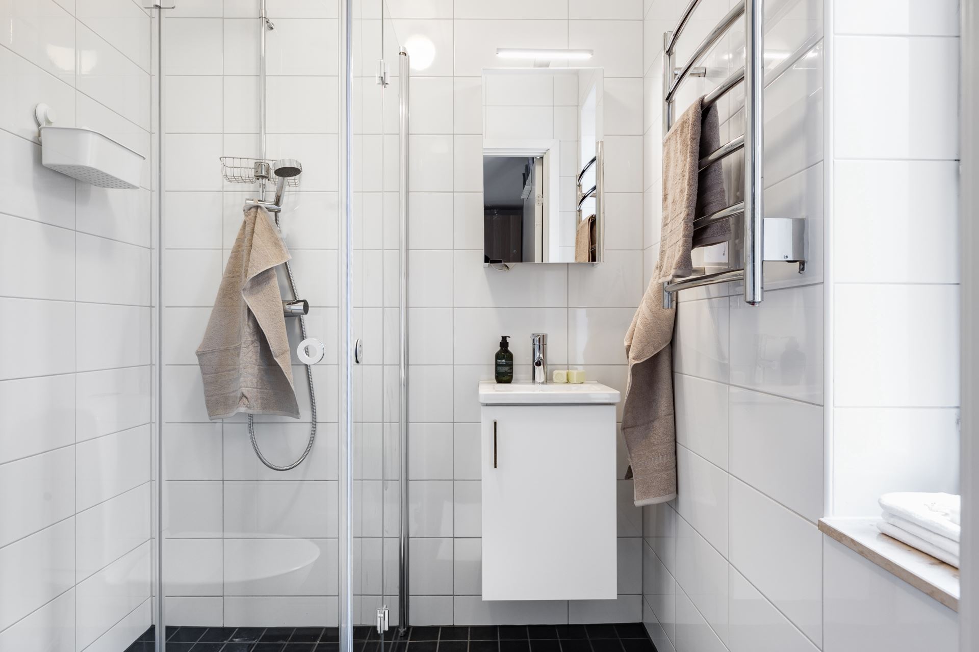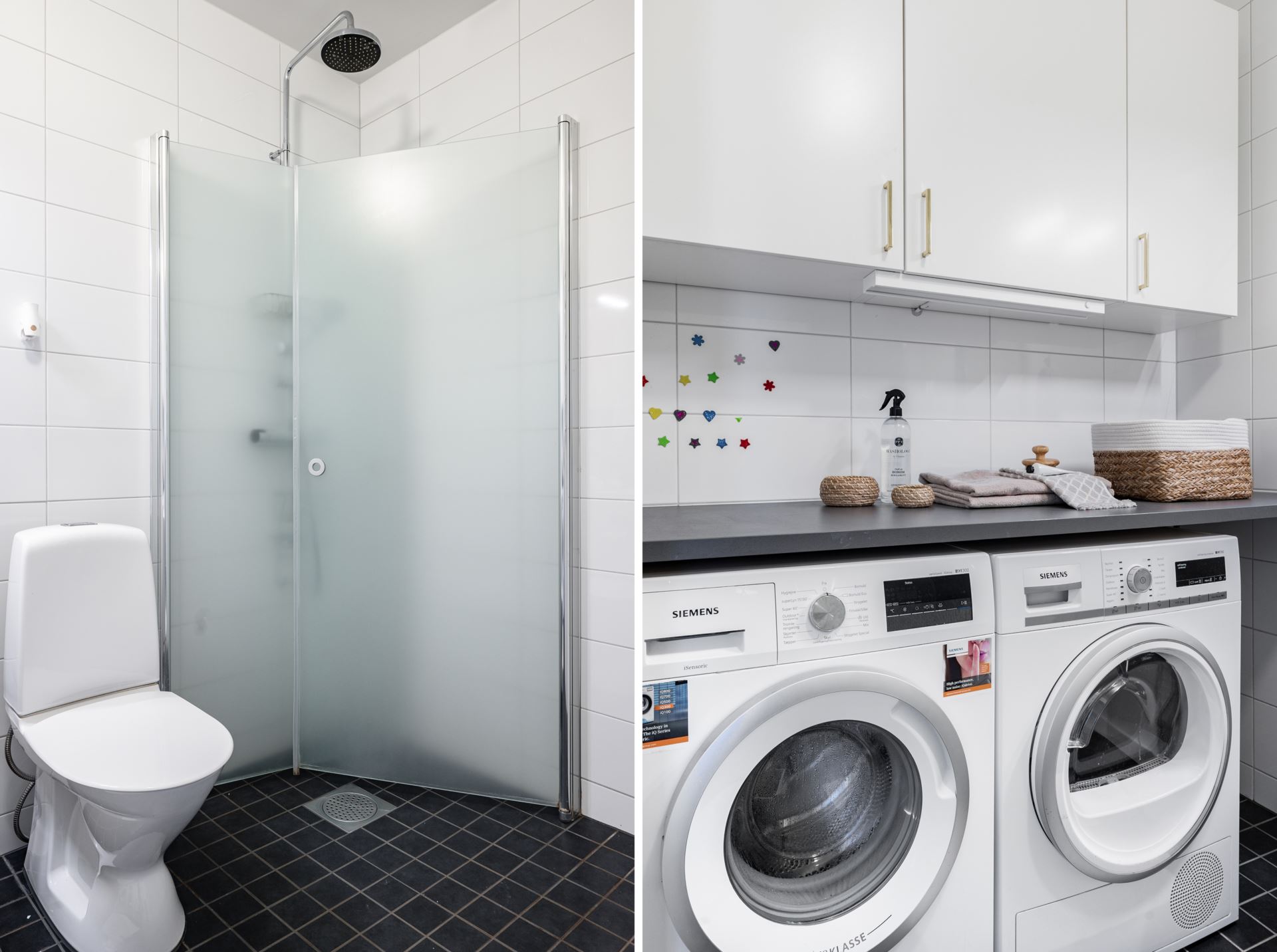 Helkaklat badrum med vitt kakel som kombineras smakfullt med gråa klinkers på golv. Badrummet är utrustat med dusch bakom glasvägg, handfat med kommod, handdukstork, wc, tvättmaskin och torktumlare. Ytterligare skåpsförvaring och arbetsyta finns ovanför tvätt,- och tork.